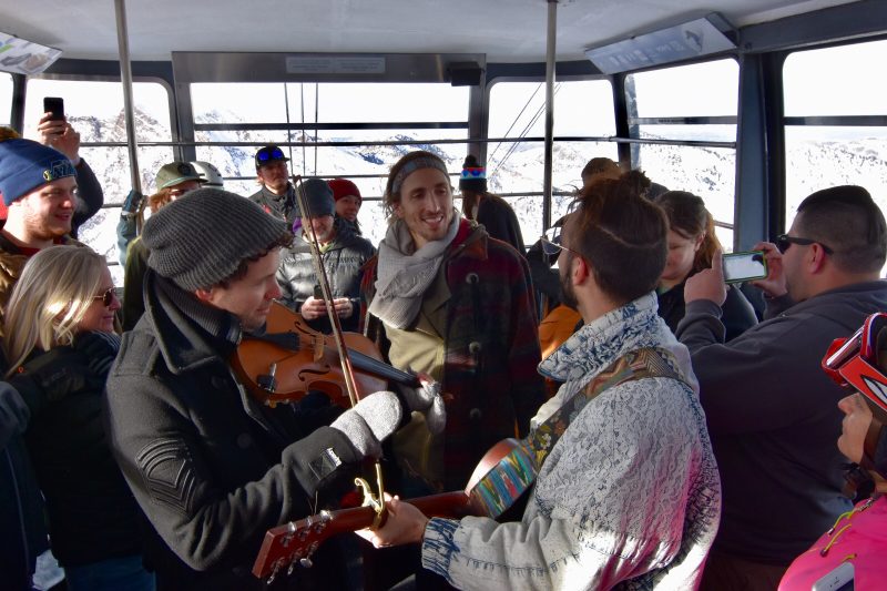 Magic Giant kicked off the first mini concert of Frontside Sessions on Jan. 31. “On the way up the mountain, the tram was filled to capacity,” says Walle. “With an awesome mountain backdrop, Magic Giant played a selection of its most popular songs, acoustic-style. Band members took turns wading through the crowd while they performed, hugging and high-fiving thrilled fans.” Following the show, the band kept close to the tram base, talked with fans and posed for pictures.