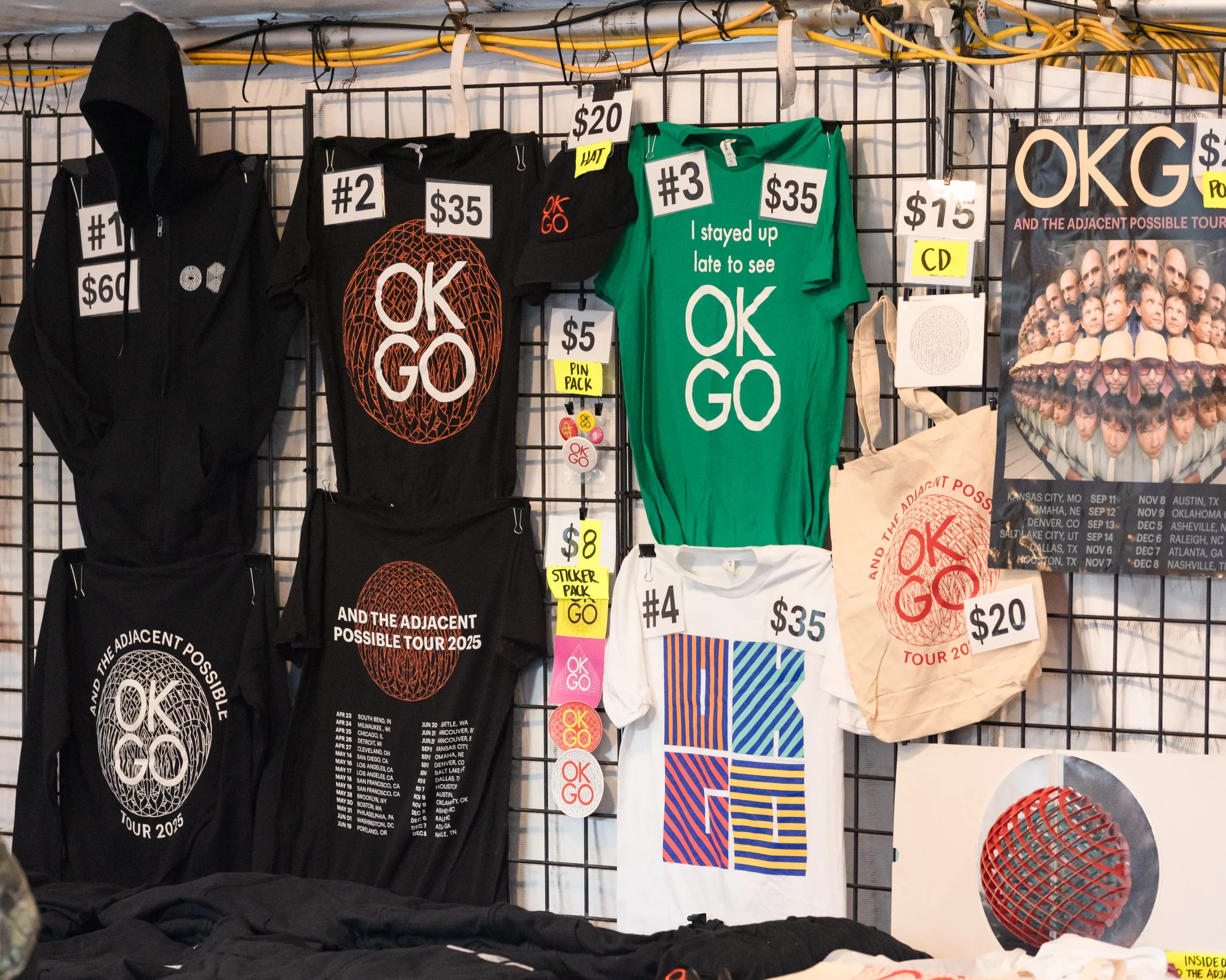 Inviting questions from the crowd, someone asked, “How do you like it here?” Kulash responded, “How do we like it? We like it here very much!” He introduced their new album And the Adjacent Possible, sporting a physical copy to share the cool 3D pop-out feature of the album sleeve itself, as the band pivoted to playing music from the new release. Pausing another time for a further inquiry from a young audience member, asking “Where did you get your name from?” Kulash told the story of meeting fellow Nordwind at a young age — through a tale of body odor and unusual circumstances, the name “OK Go” stuck.