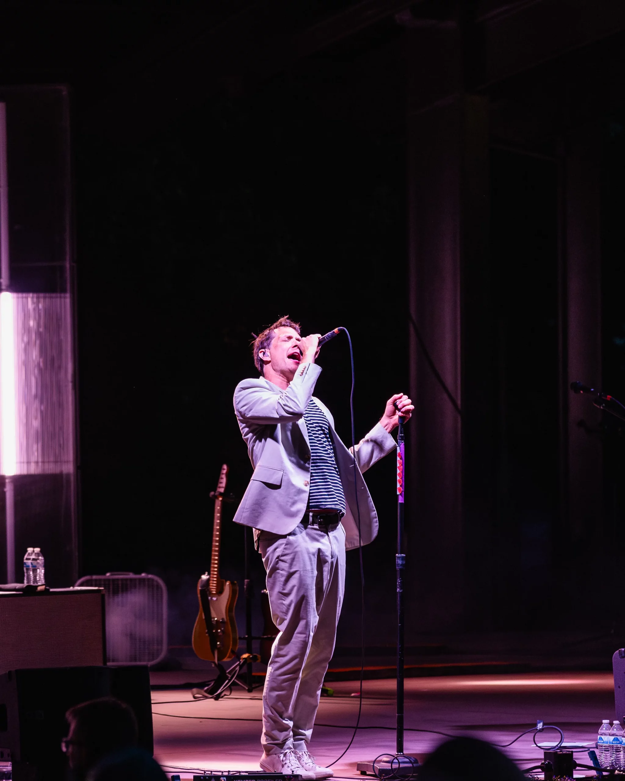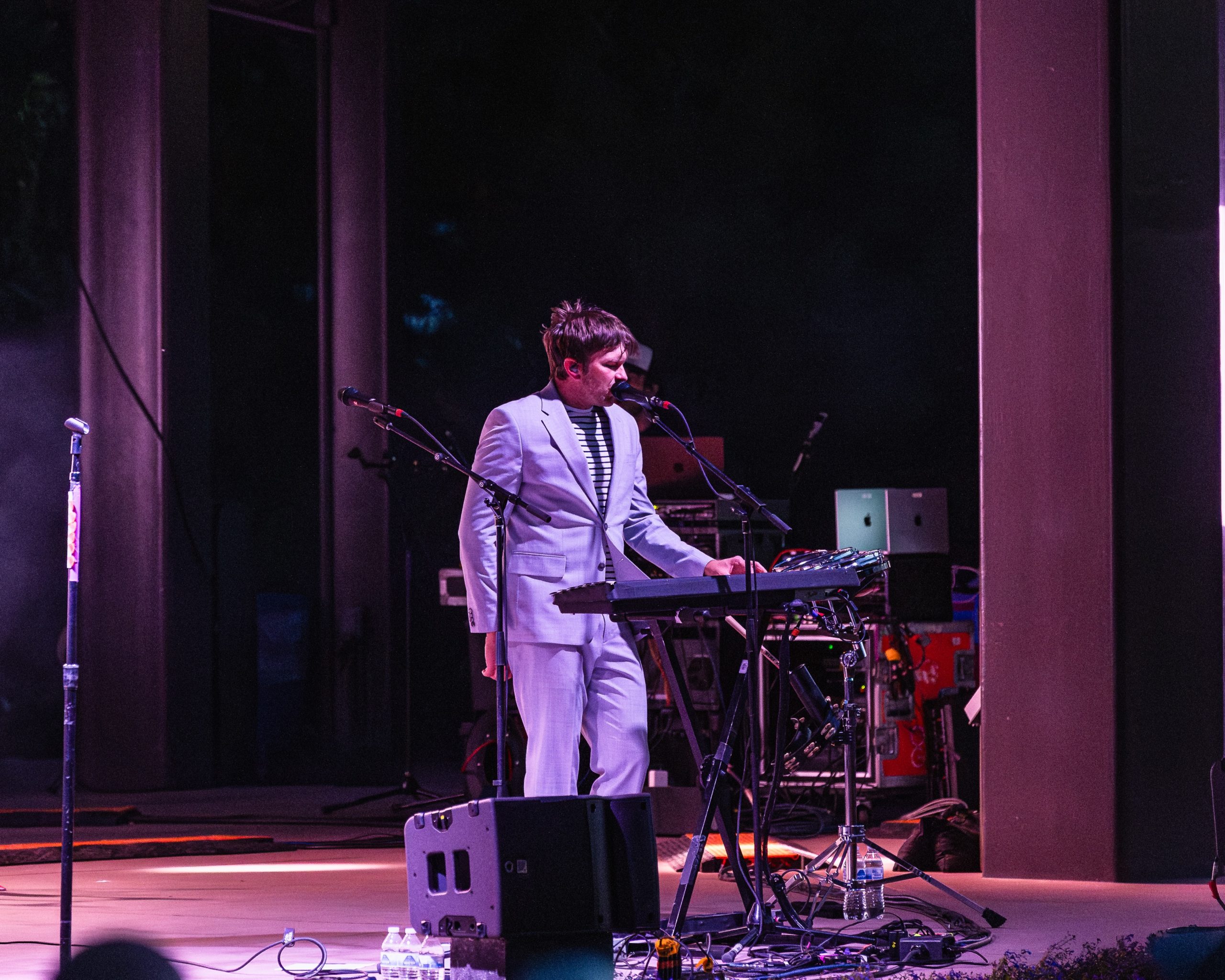 OK Go took the stage just as darkness hit, with members Damian Kulash, Tim Nordwind, Dan Konopka and Andy Ross heading out and taking their spots. Sporting coordinating gray suits and pieces of personal style, they started up the music with the hits, ending the intro to the set with a third song play of “Get Over It” before taking a pause for Kulash to speak with the audience.
