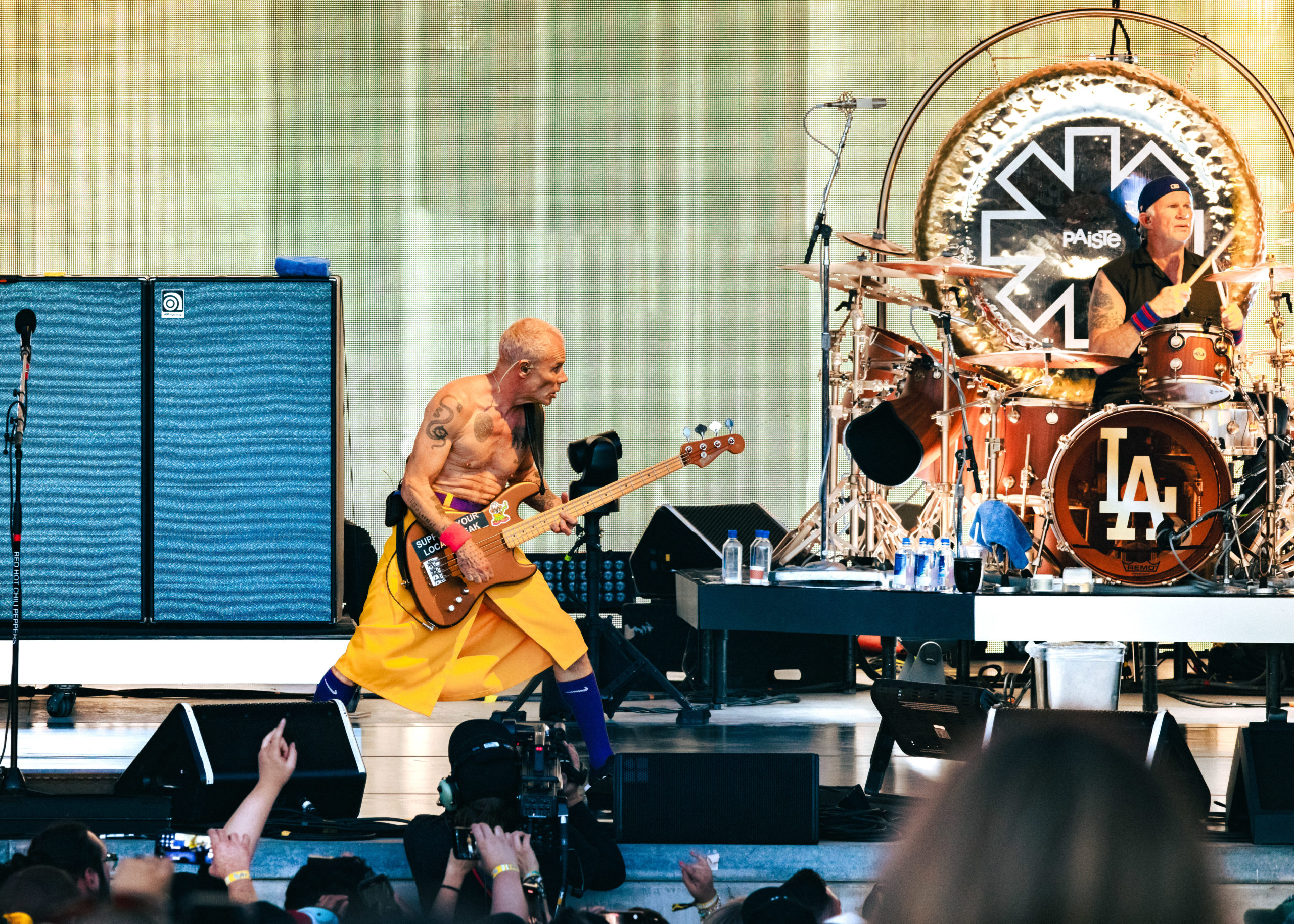 Bassist Flea of the Red Hot Chili Peppers sports a shirtless look with a yellow fabric skirt as he plays with drummer Chad Smith right behind him in Salt Lake City, Utah. Photo: @lmsorenson