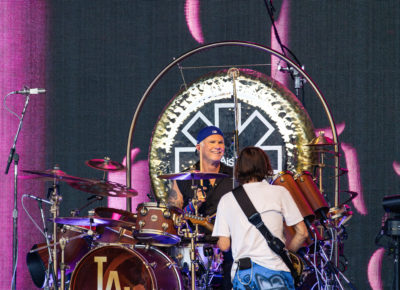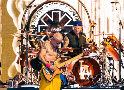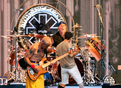 Next up to the stage is the Red Hot Chili Peppers. An intro riff starts up as the members come on stage, just missing Anthony Kiedis… The instrumentals come to a head and “Can’t Stop” finally kicks in, as Kiedis joins the band to an uproar of applause. The other band members don’t miss a beat as they play on, continuing with “The Zephyr Song.” Chad Smith on the drums keeps an eye on everyone as bassist Flea runs the gamut of the stage, guitarist John Frusciante provides some backup vocals, Chris Warren commands the keyboard and Kiedis keeps wailing on that mic at center stage.