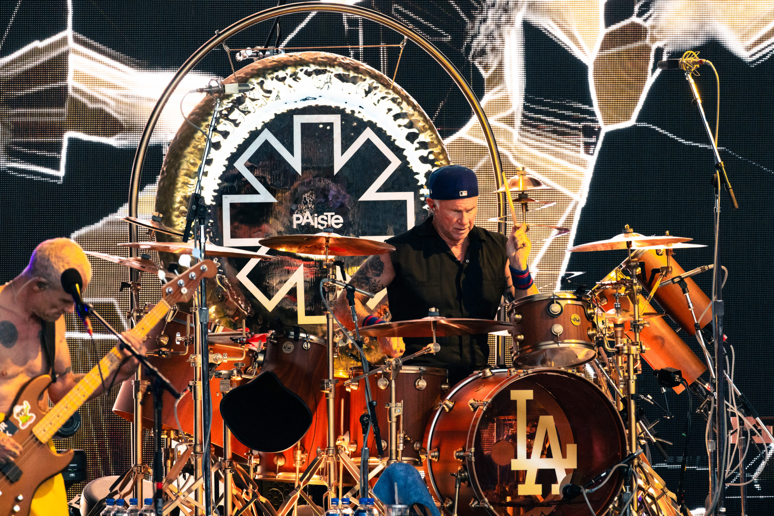 Chad Smith of the Red Hot Chili Peppers plays drums on stage at the Utah First Credit Union Amphitheatre. Photo: @lmsorenson