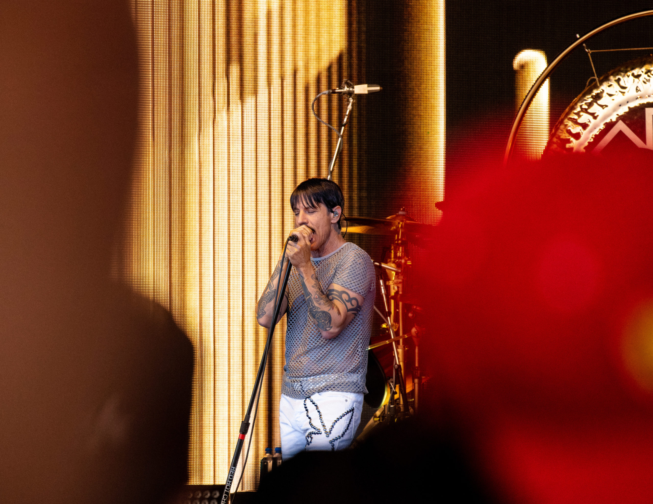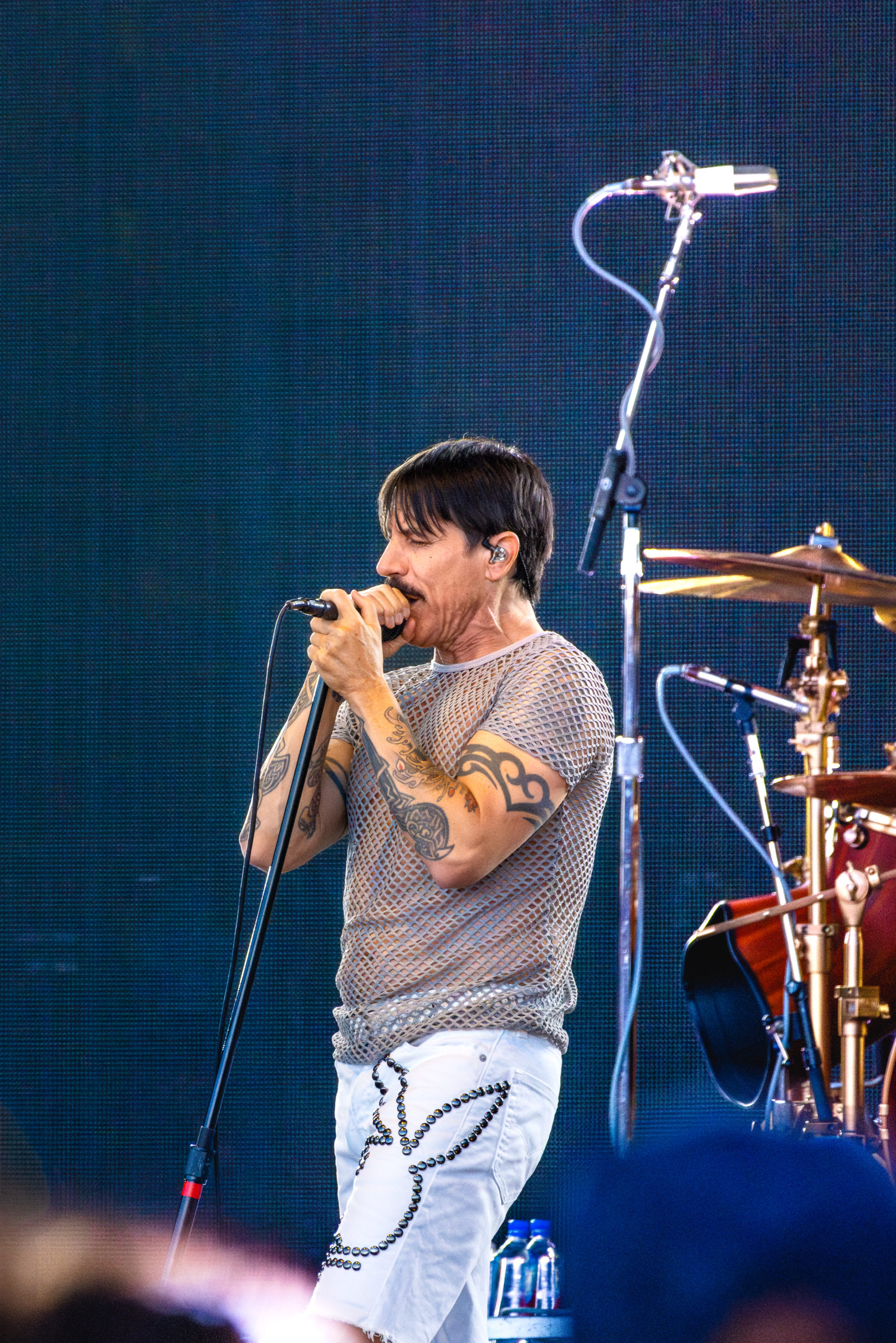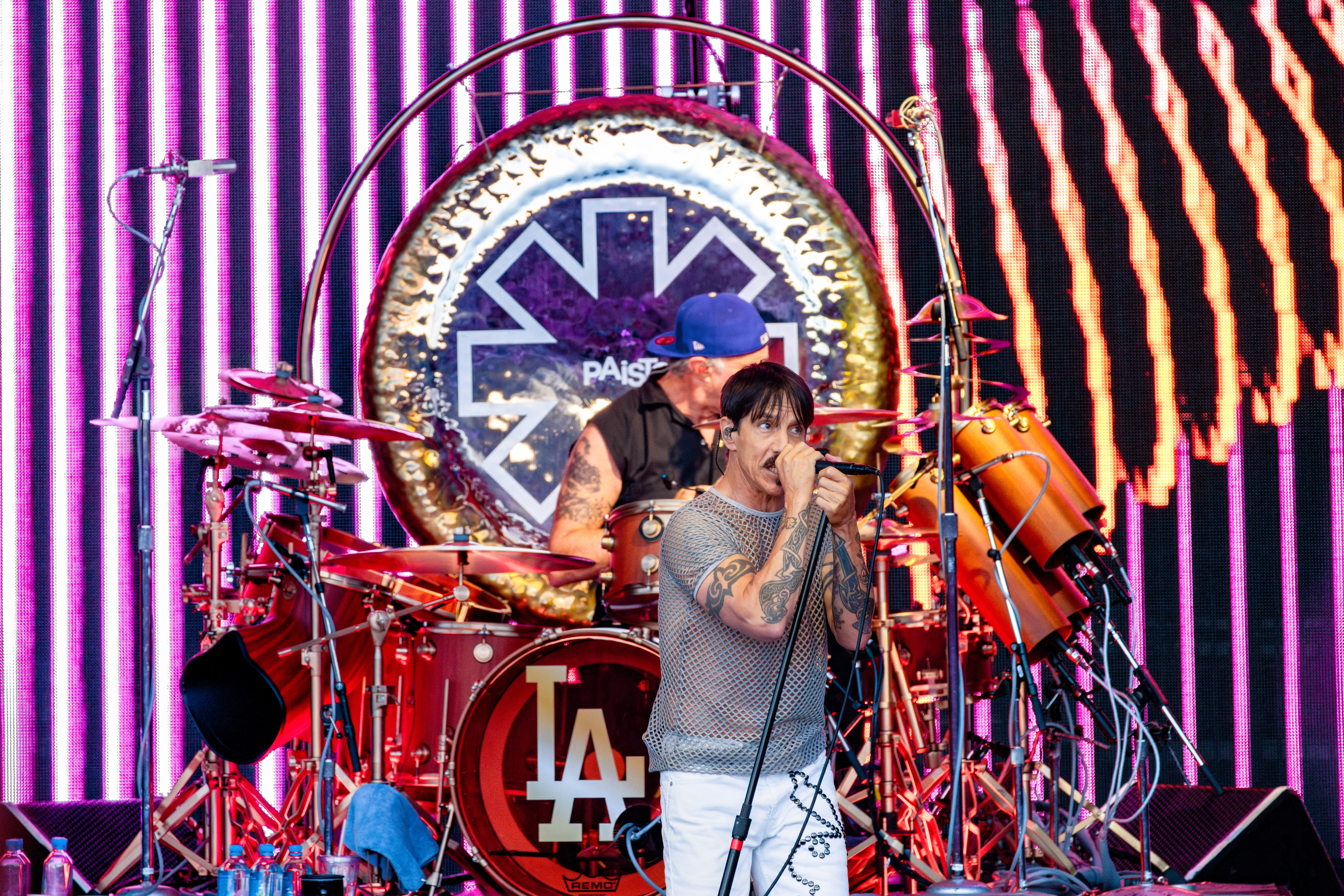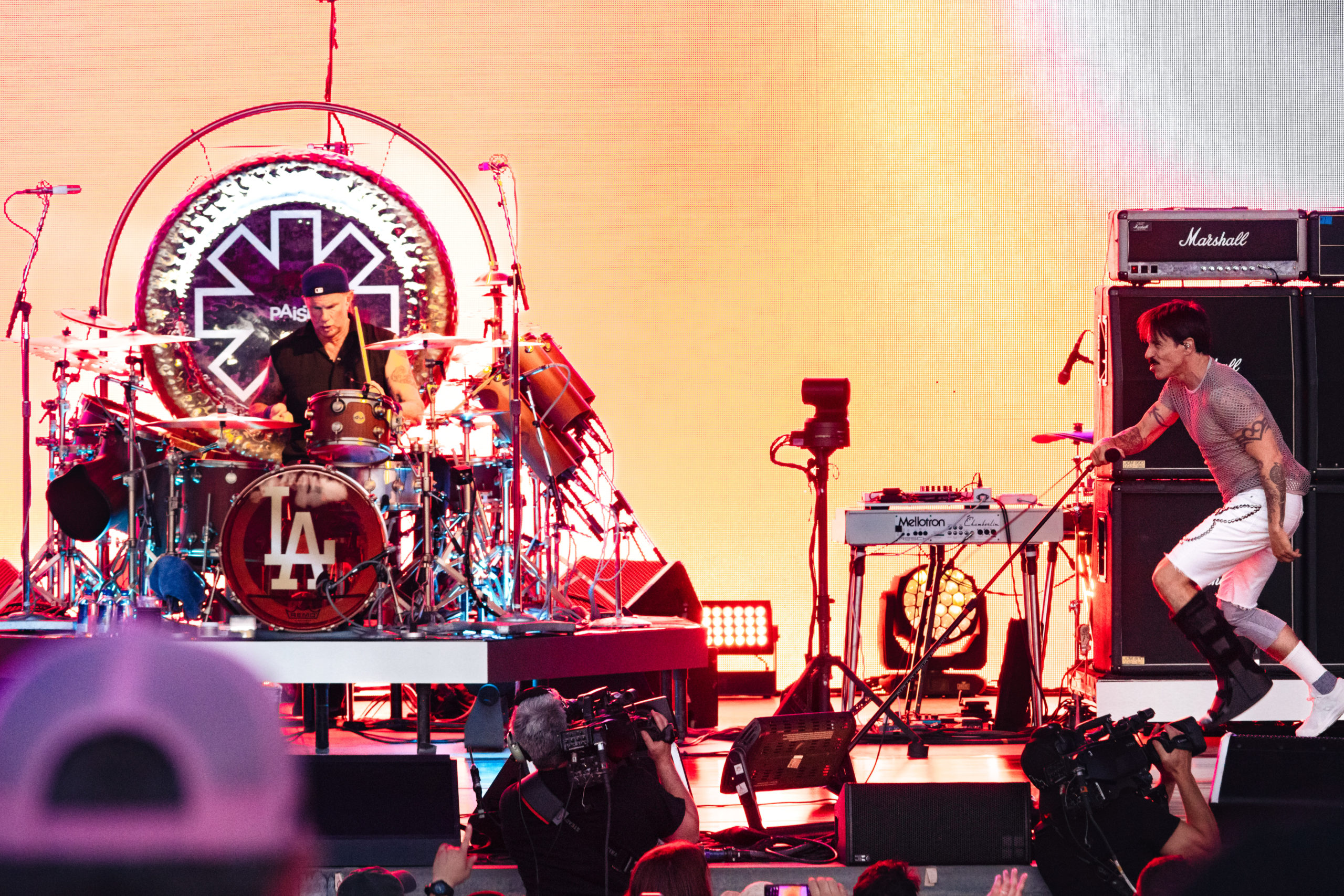 Anthony Kiedis of the Red Hot Chili Peppers sings on the mic center stage just in front of drummer Chad Smith. Photo: @lmsorenson