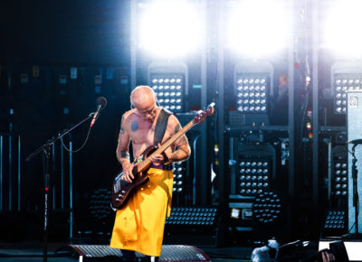 Flea, bassist for the Red Hot Chili Peppers, plays in front of a blast of white light from the stage as he is in the zone, looking down at his instrument. Photo: @lmsorenson