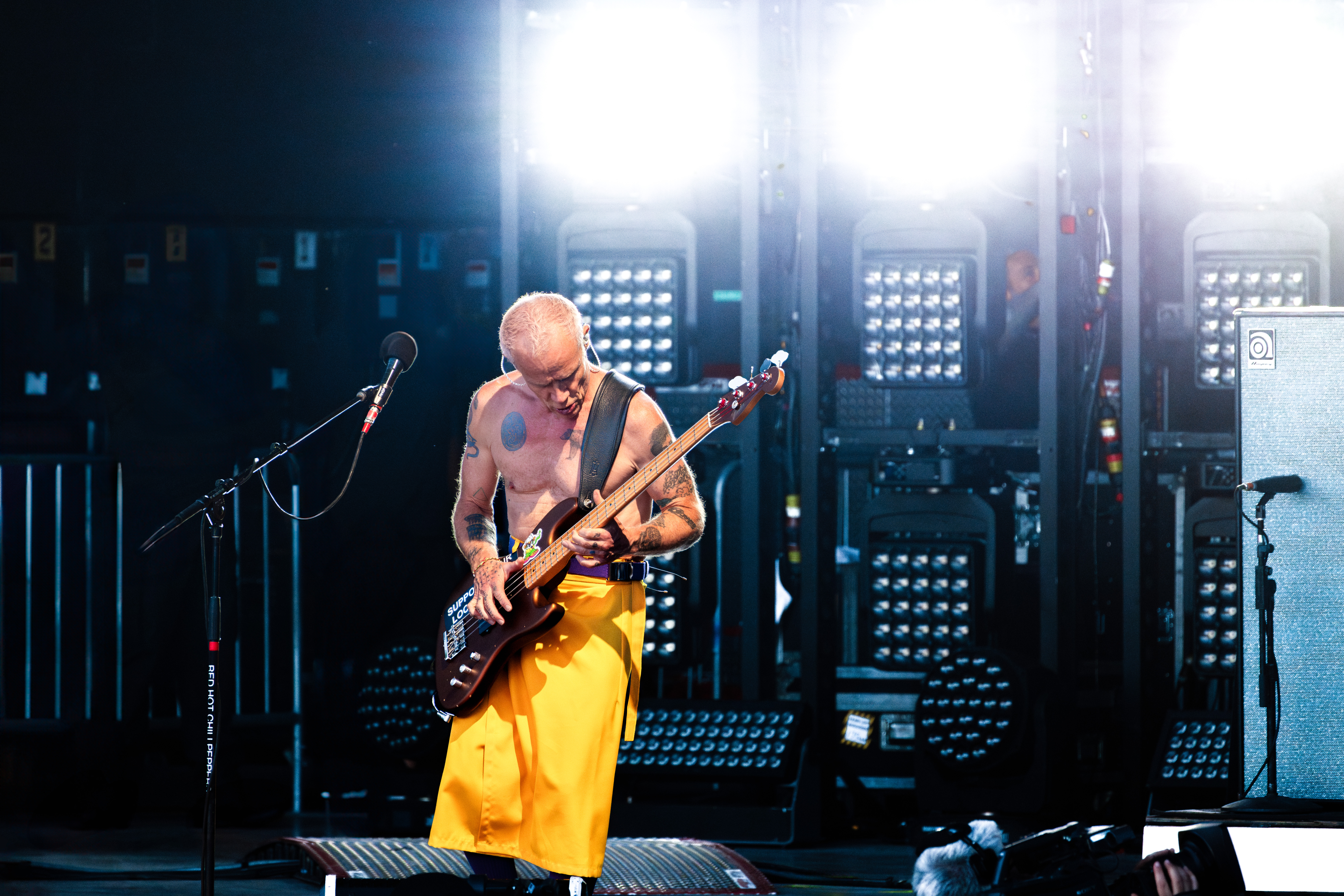 Flea stands with a wide stance playing bass in front of the fans, with Chad Smith playing drums to the side while on stage in Salt Lake City, Utah. Photo: @lmsorenson