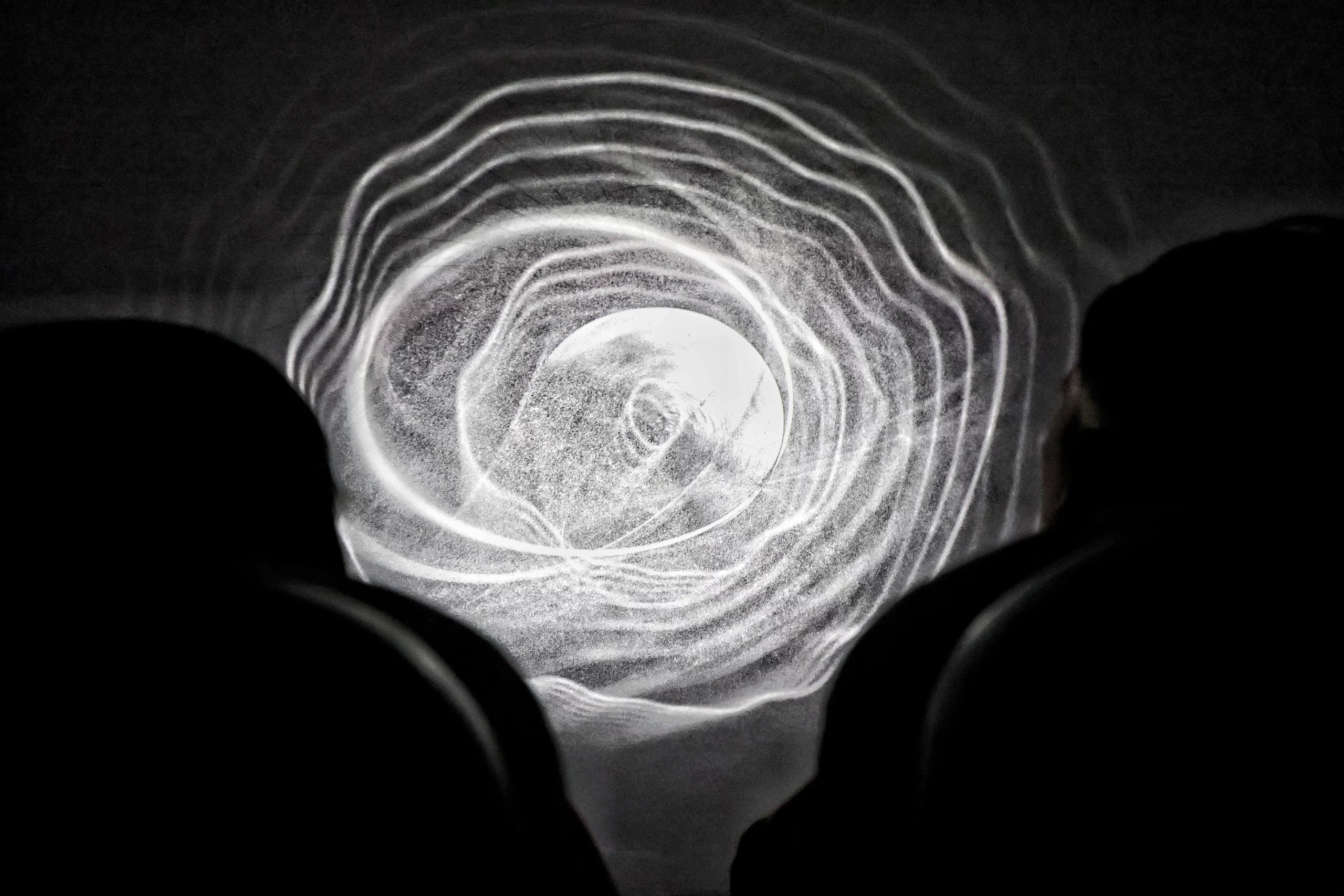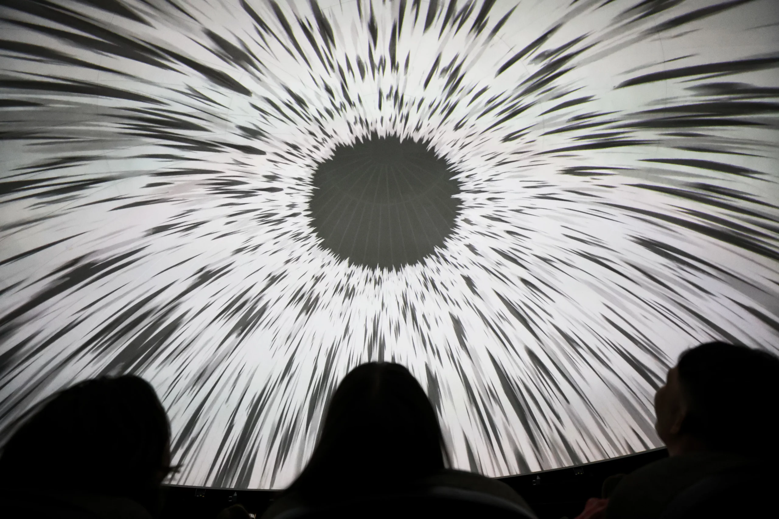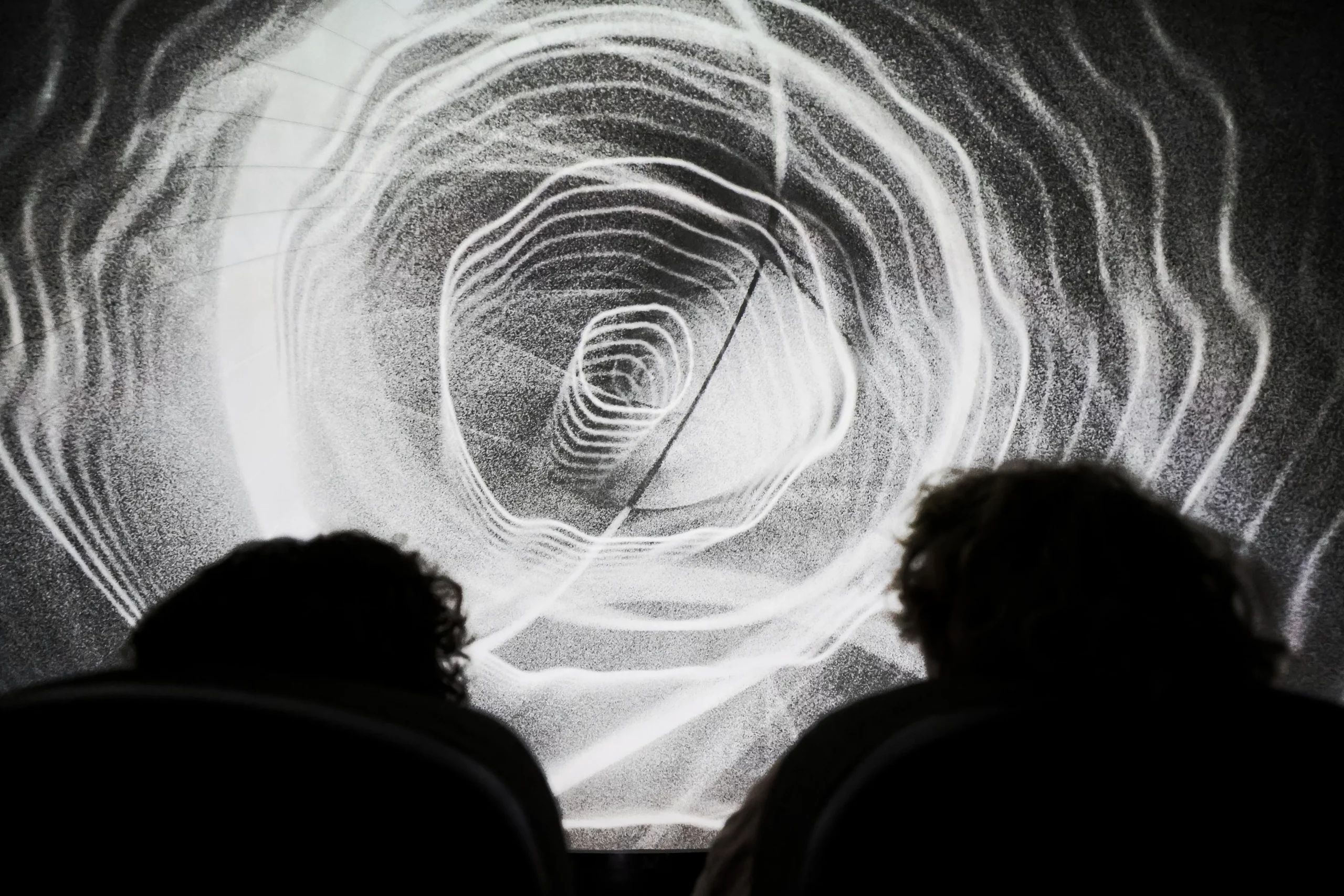 The room quiets as the show is about to begin and warm violet hues fall away, giving into the darkness. Out of that darkness comes a small, out-of-focus geometric shape just taking form in stark black and white. The images keep forming, coming at the audience and sucking them out of their seats and into the full experience as the accompanied tracks kick in and the room is suddenly filled with the moon, waves, black holes and space.