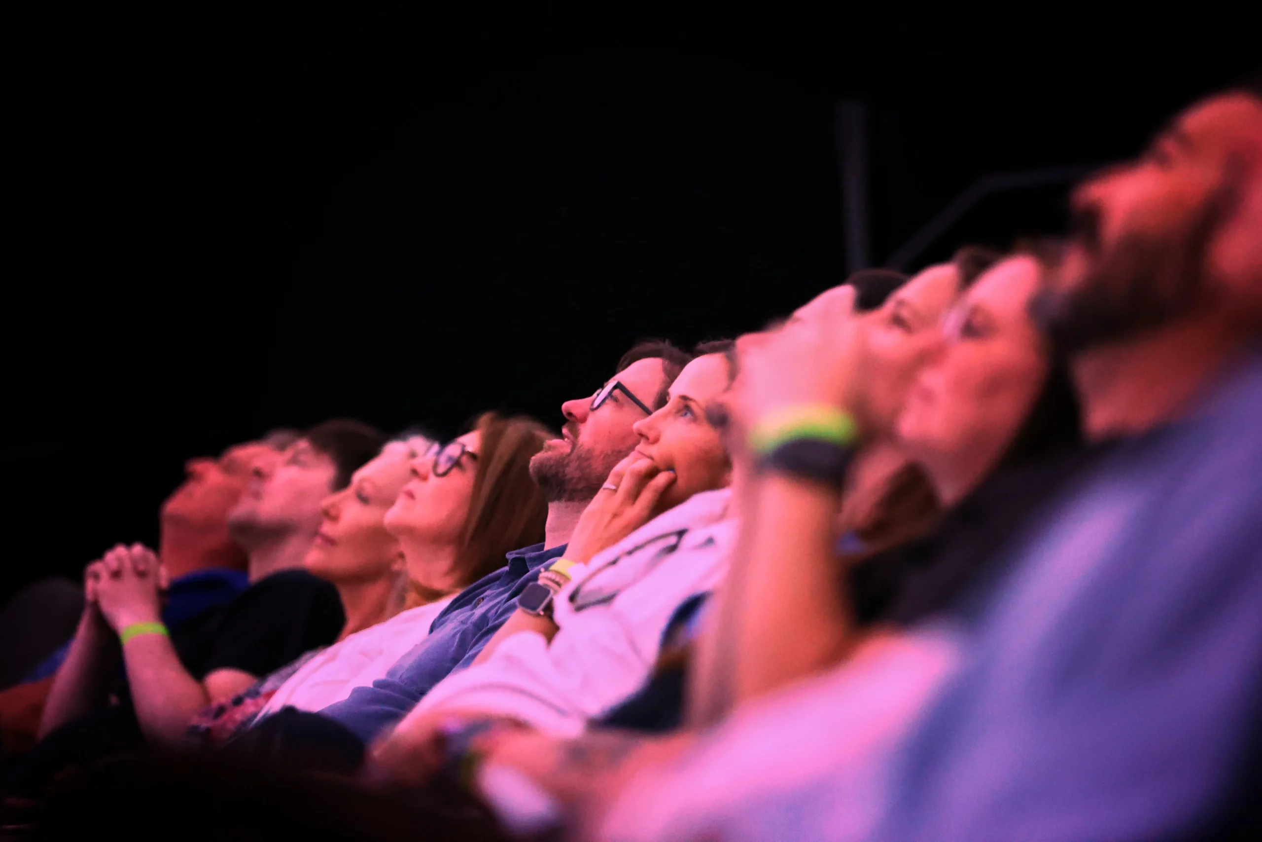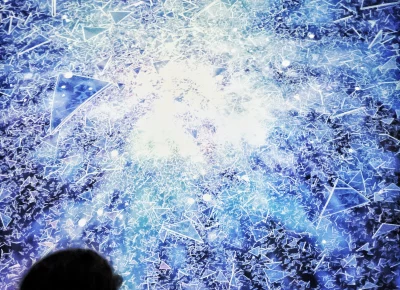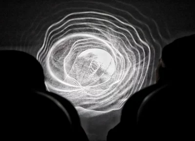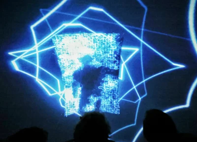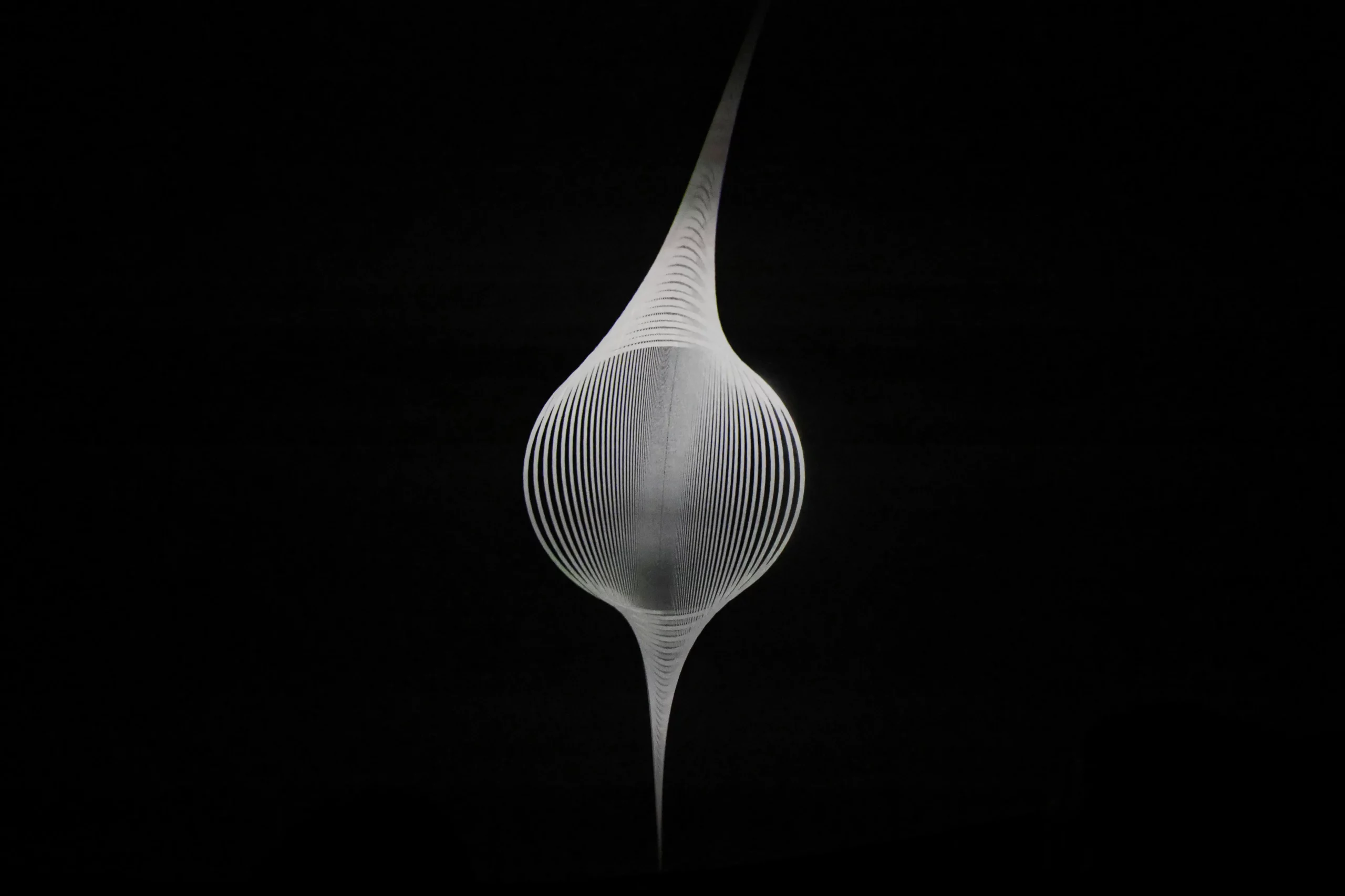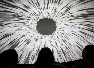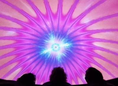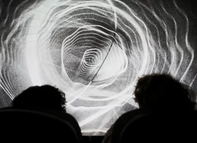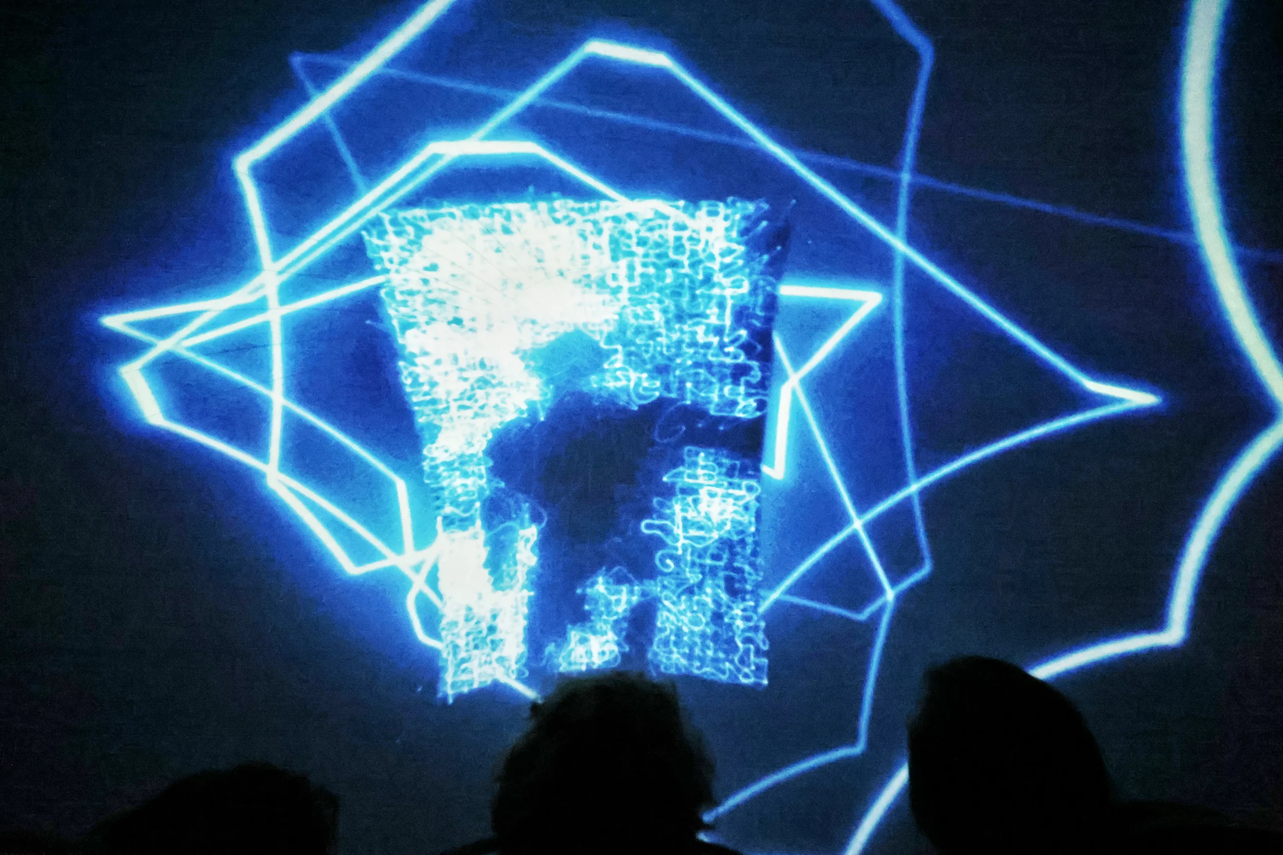 The room quiets as the show is about to begin and warm violet hues fall away, giving into the darkness. Out of that darkness comes a small, out-of-focus geometric shape just taking form in stark black and white. The images keep forming, coming at the audience and sucking them out of their seats and into the full experience as the accompanied tracks kick in and the room is suddenly filled with the moon, waves, black holes and space.