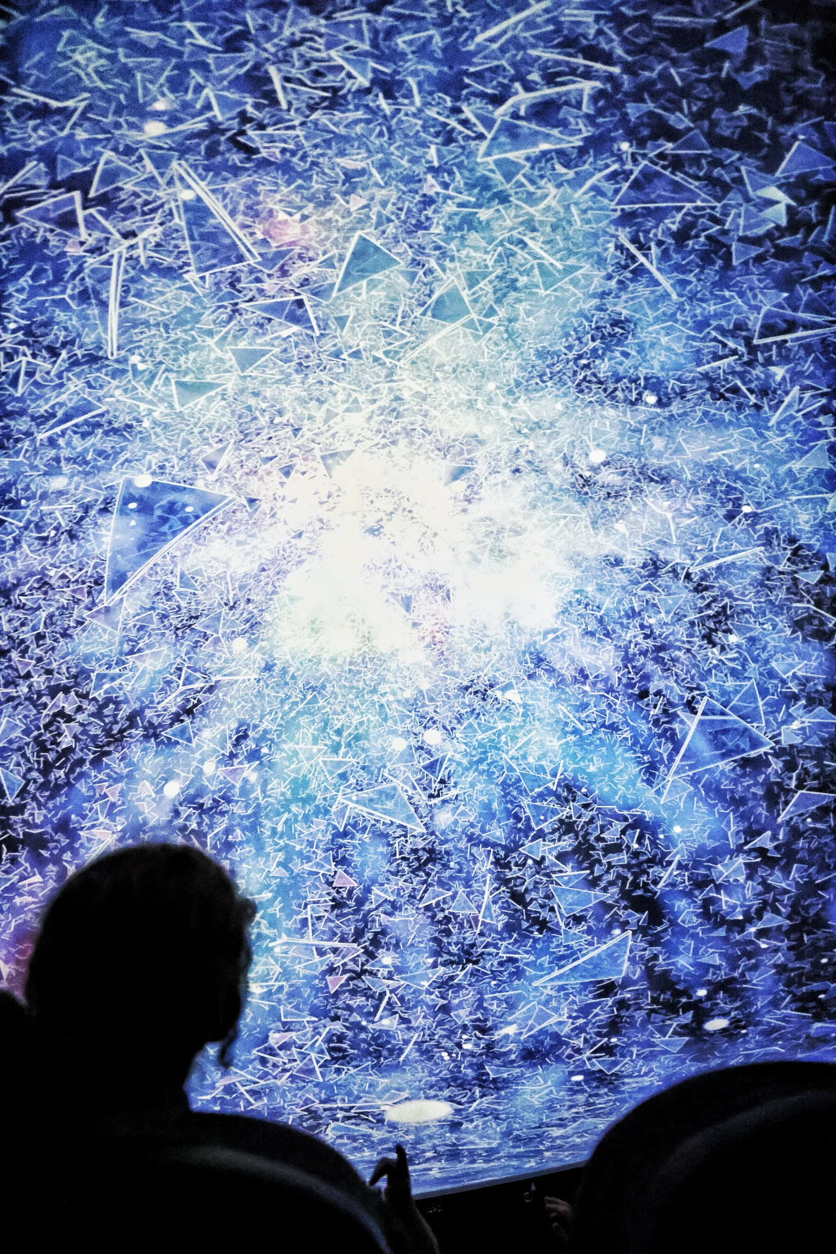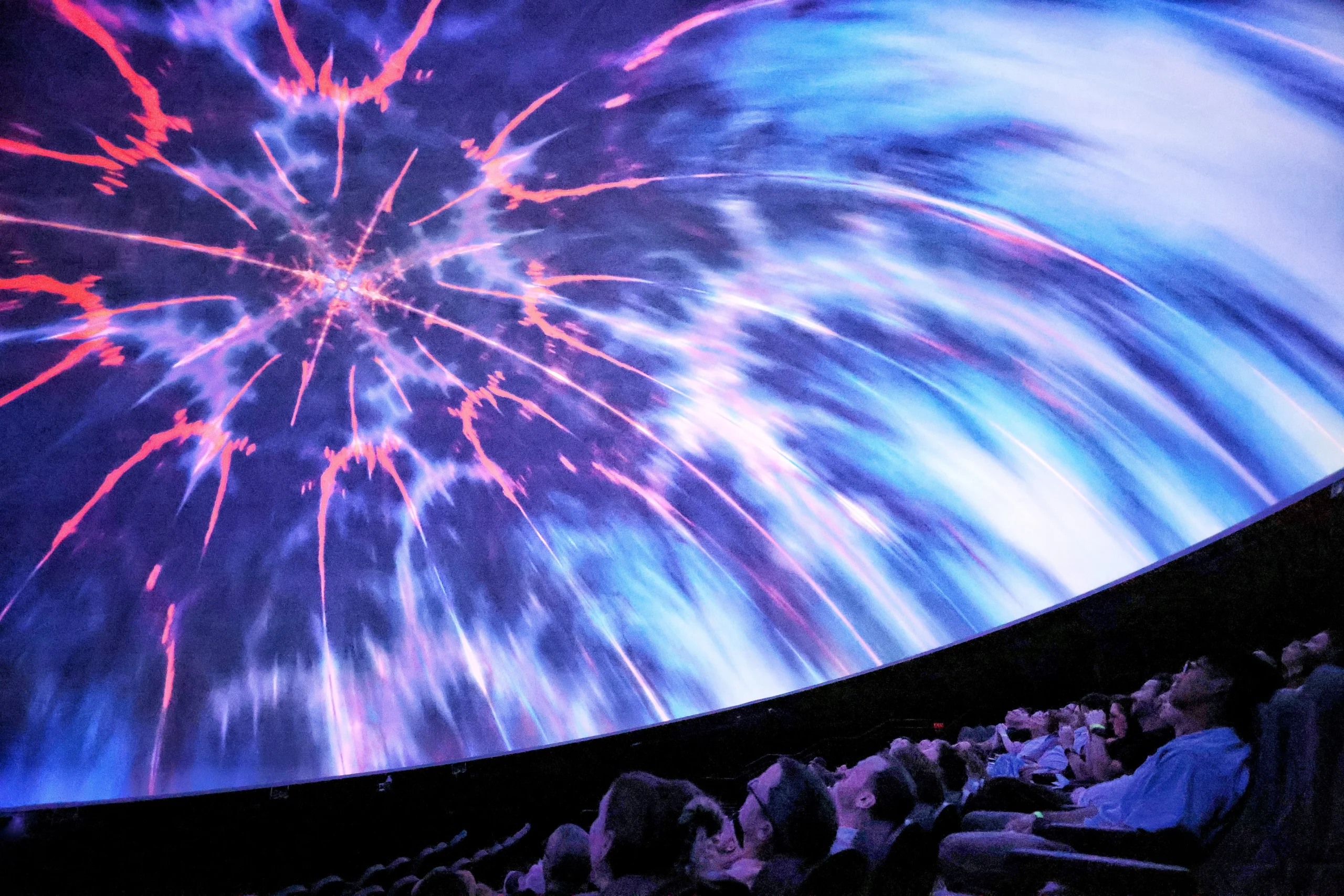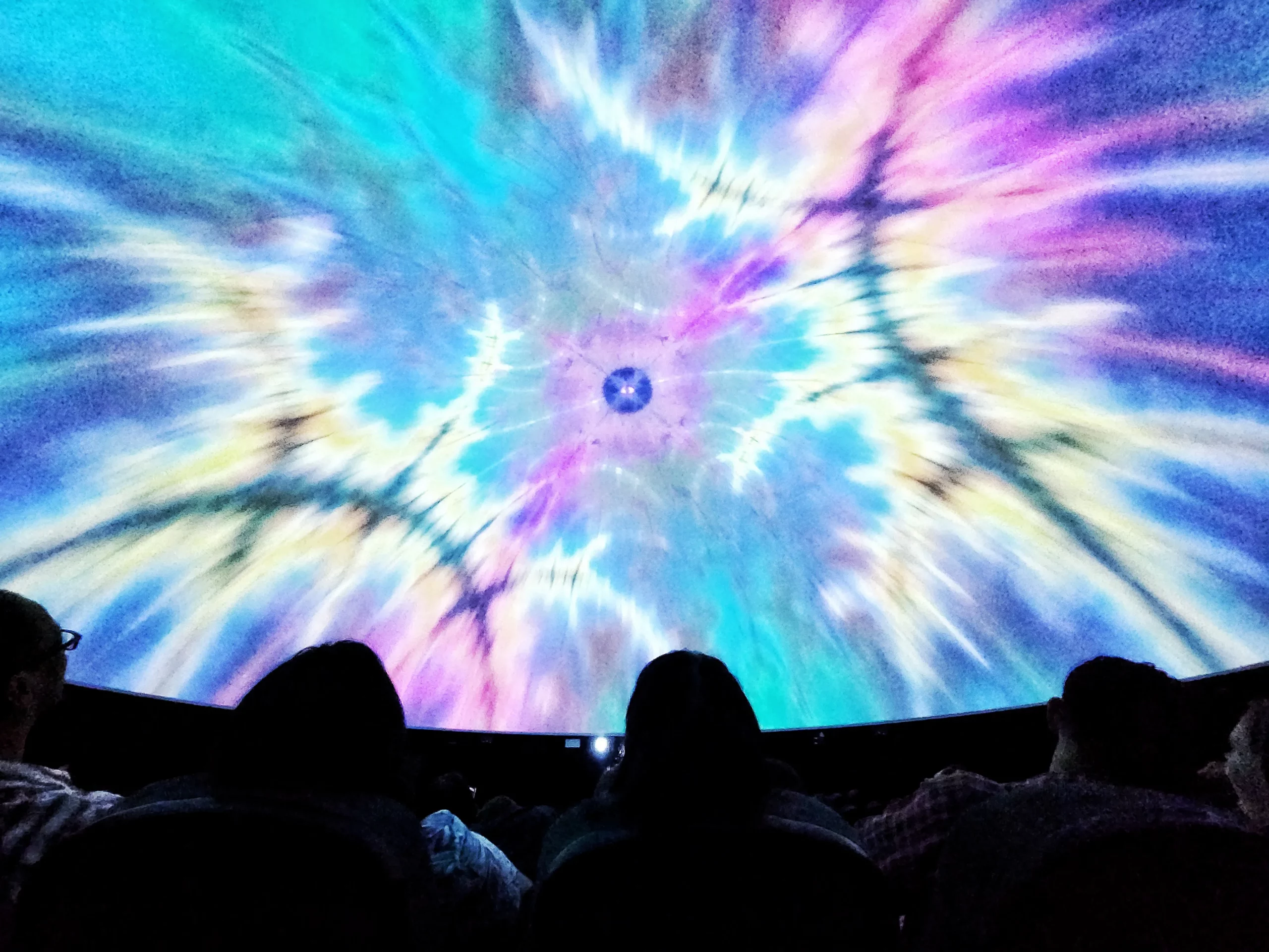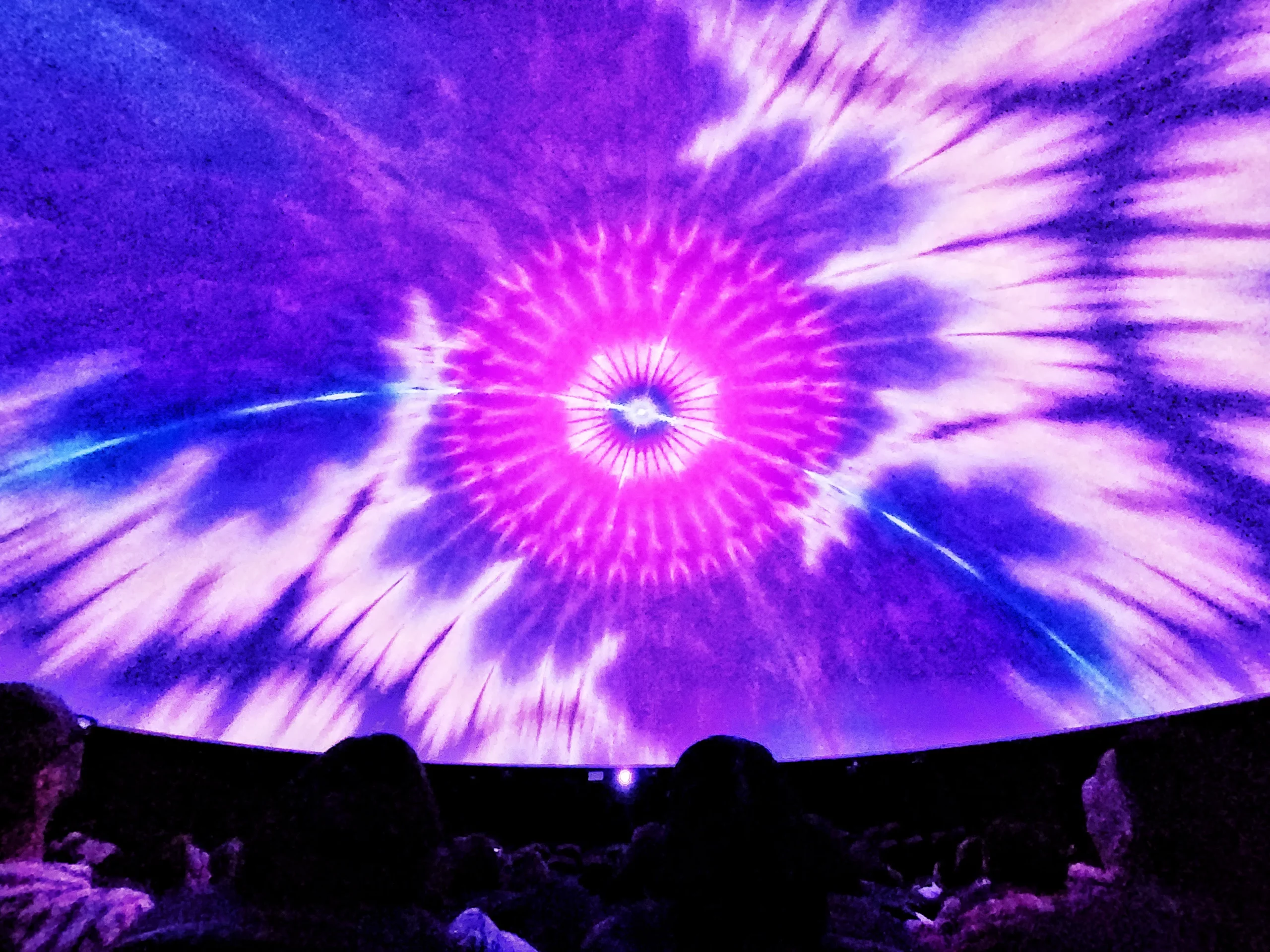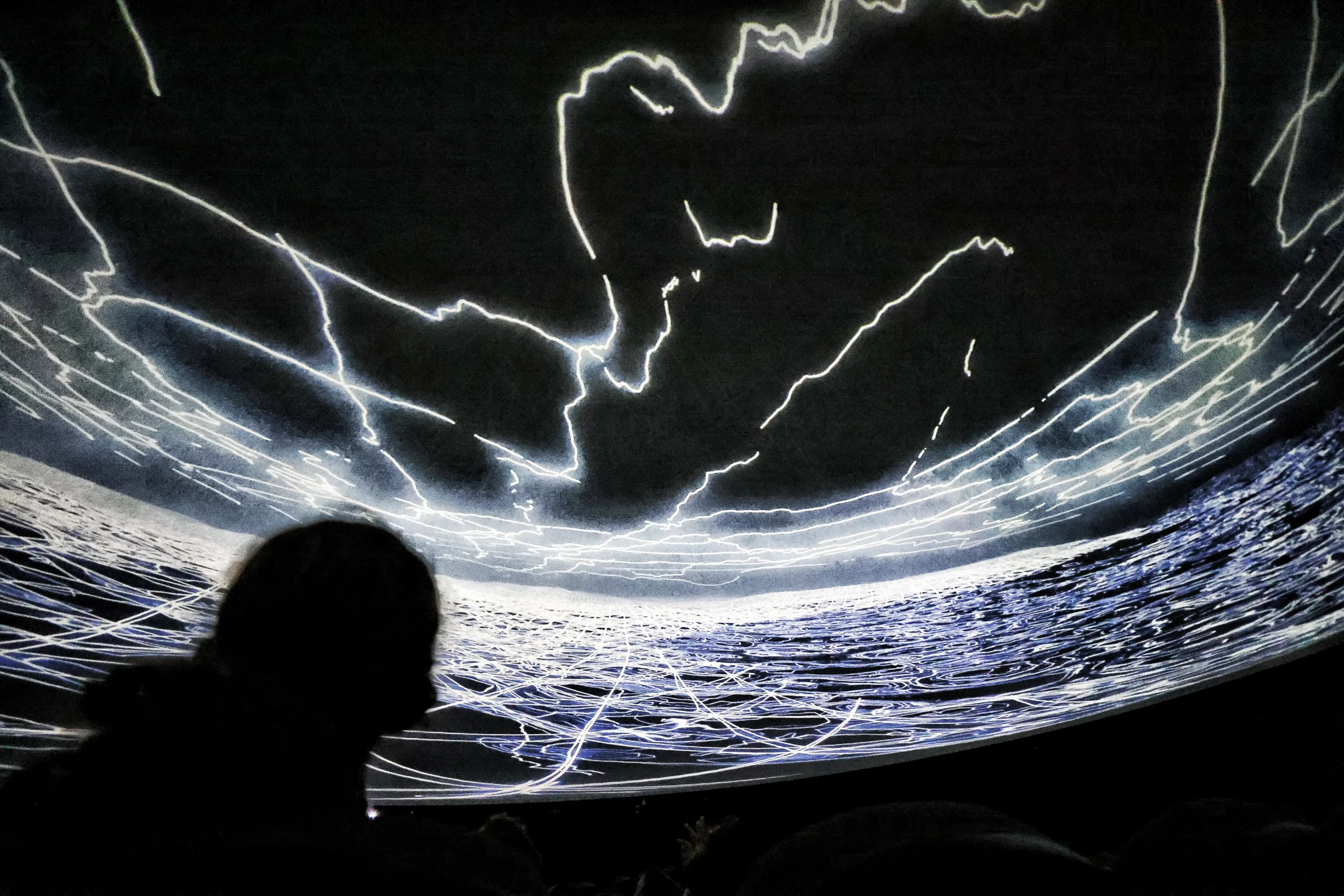 Alden is introduced by Dome Theater Experience Manager Brandon Crowley, who mentions his impressions of working with Alden and his admiration at his adaptation to the Dome Theater setting. Alden briefly introduces himself to a mixed crowd of friends, fans and new soon-to-bes who are just here for a good Dome Theater experience (as the Planetarium holds other such regular events). But “Space and Time” is special. Alden mentions that this is not his first foray in releasing music — far from it, with his extensive experience with various genres — however, this is a personal feat and a culmination of over four years of work. His work utilizes many different tools: recording, mixing, creating, altering, blending and rendering for what seems a boundless task to create this reflection. This creation is ten songs in total (with the tenth released as a bonus for streaming) and audio and VR versions available to boot. It always was the intention and vision to have this project be fully featured in a Dome Theater release.