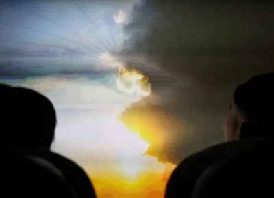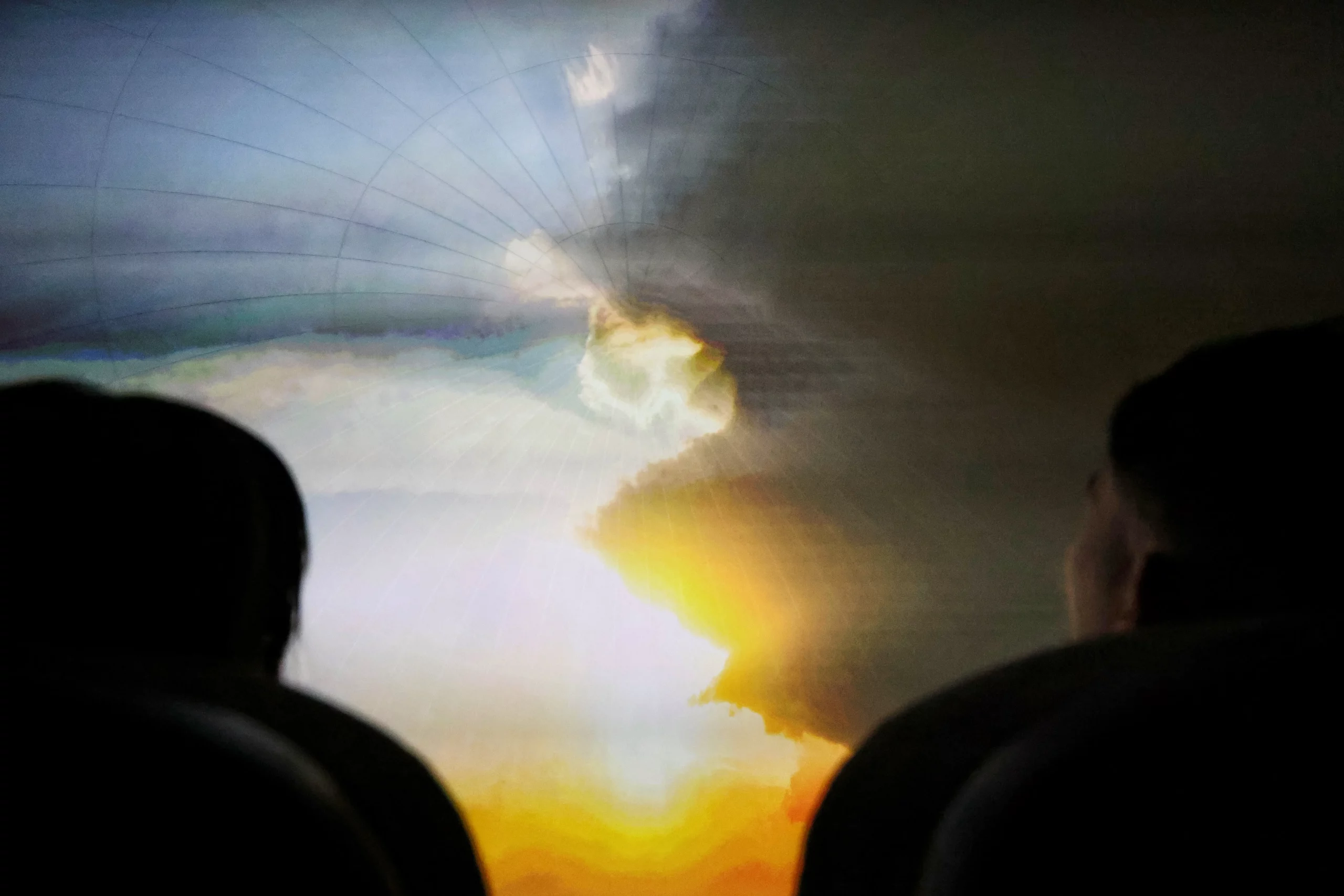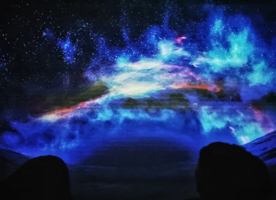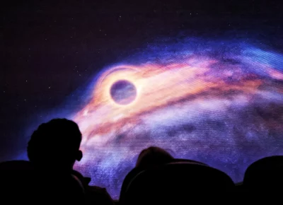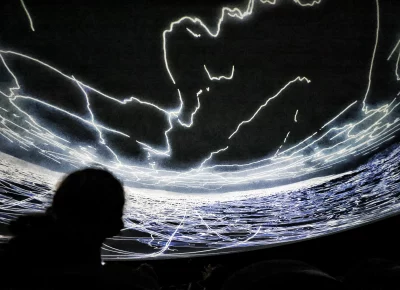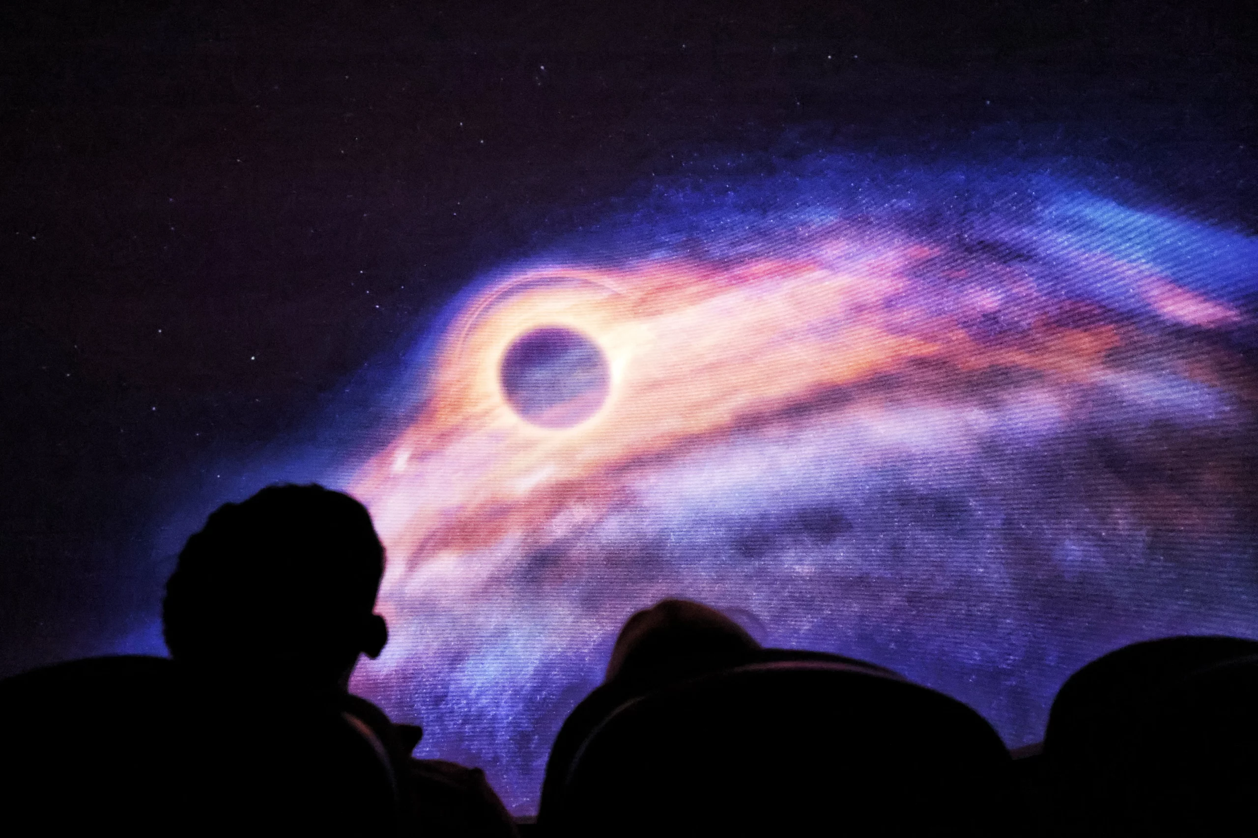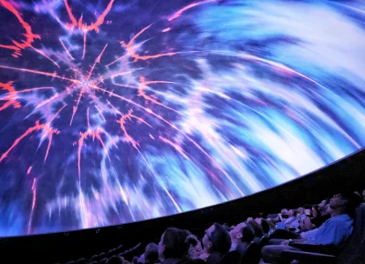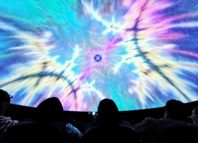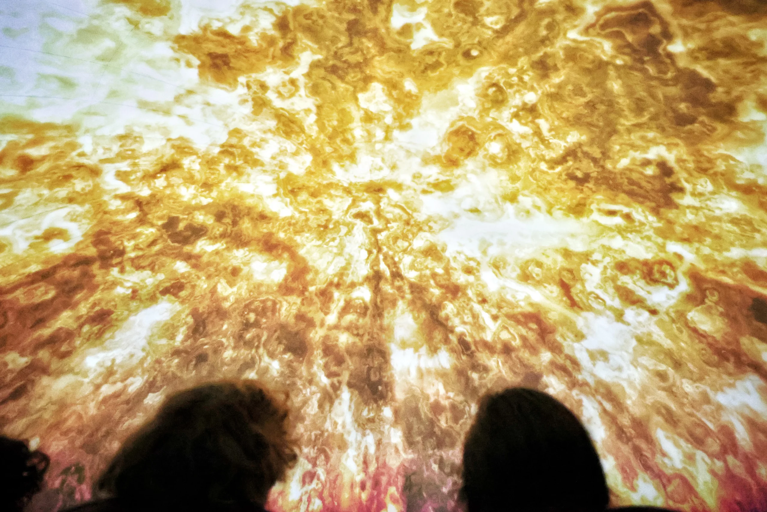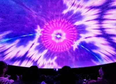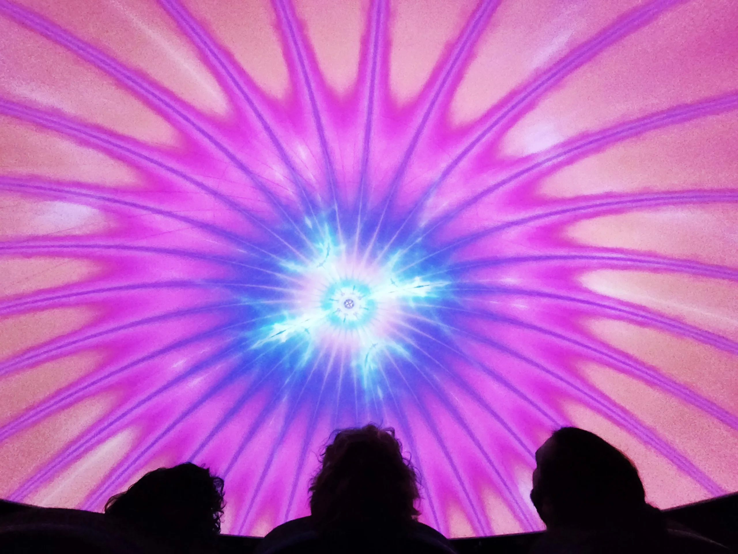 Alden is introduced by Dome Theater Experience Manager Brandon Crowley, who mentions his impressions of working with Alden and his admiration at his adaptation to the Dome Theater setting. Alden briefly introduces himself to a mixed crowd of friends, fans and new soon-to-bes who are just here for a good Dome Theater experience (as the Planetarium holds other such regular events). But “Space and Time” is special. Alden mentions that this is not his first foray in releasing music — far from it, with his extensive experience with various genres — however, this is a personal feat and a culmination of over four years of work. His work utilizes many different tools: recording, mixing, creating, altering, blending and rendering for what seems a boundless task to create this reflection. This creation is ten songs in total (with the tenth released as a bonus for streaming) and audio and VR versions available to boot. It always was the intention and vision to have this project be fully featured in a Dome Theater release.