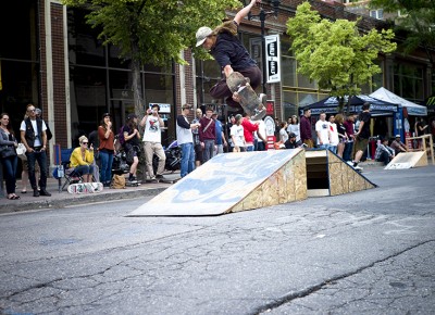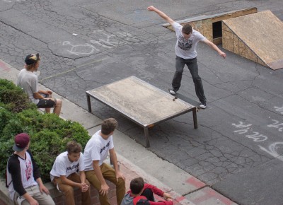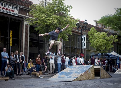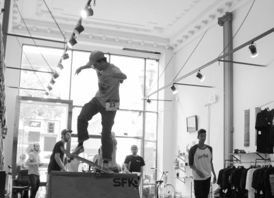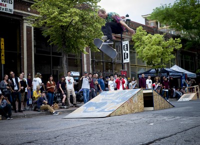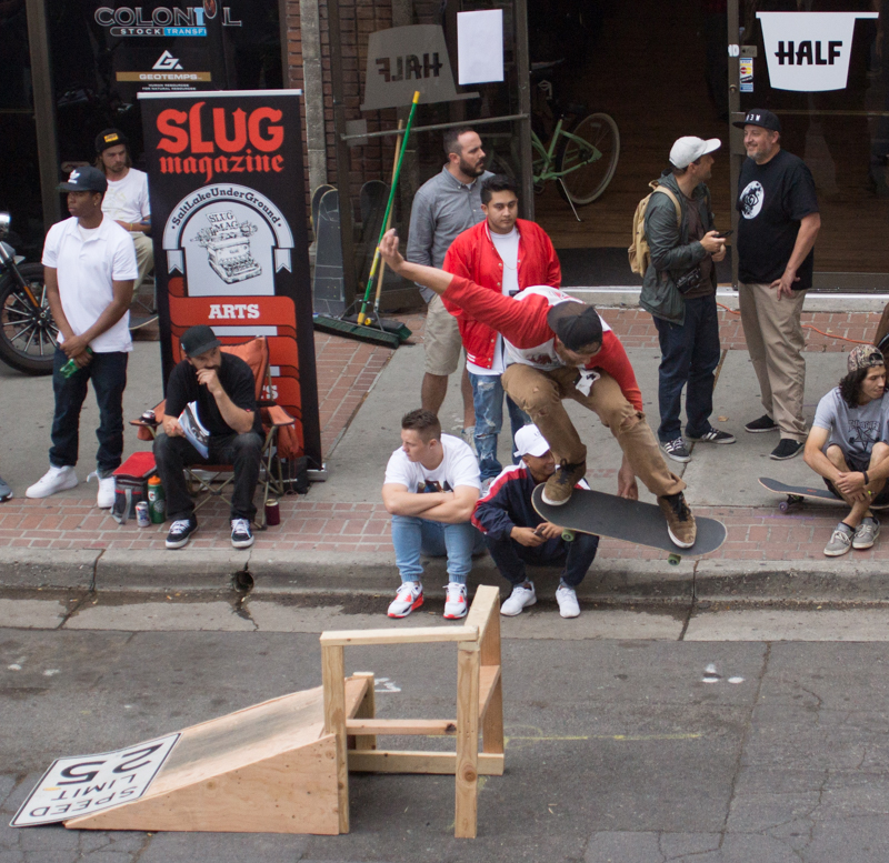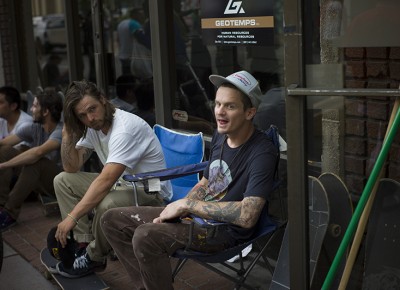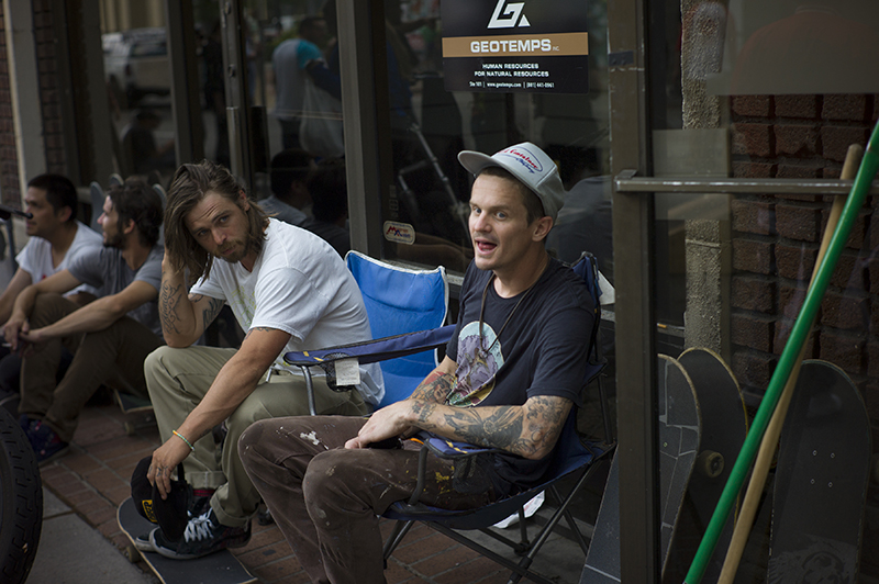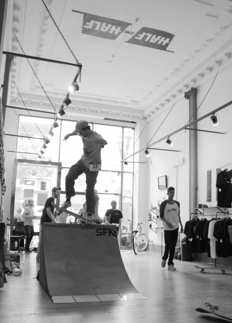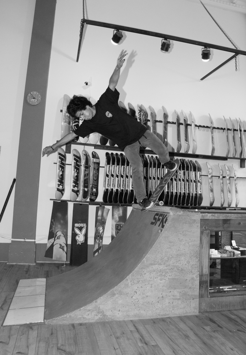 Half and Half owner, Milhouse, is stoked on Jeff Griffith’s skating. Photo: Chris Kiernan