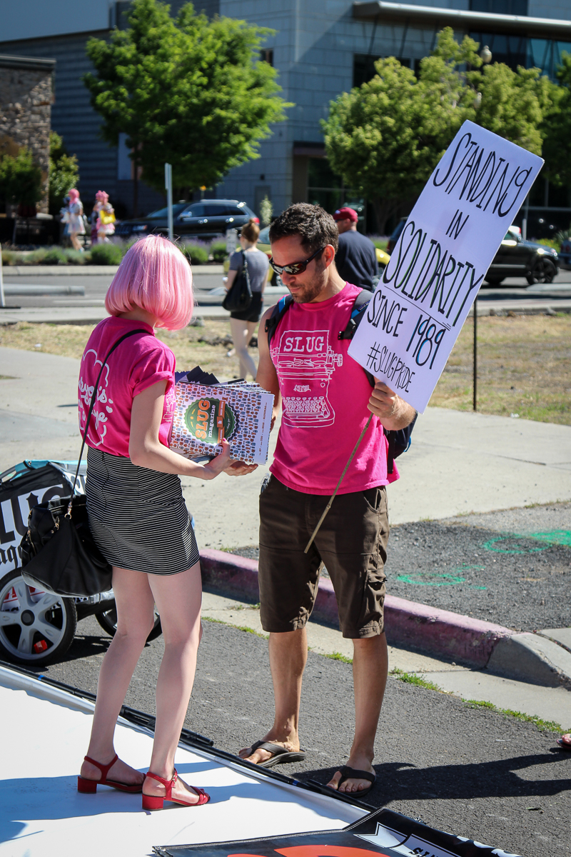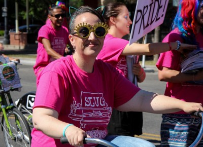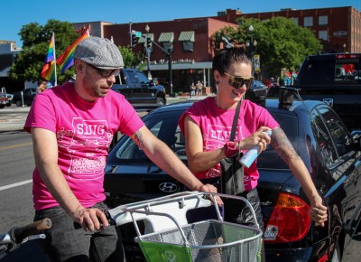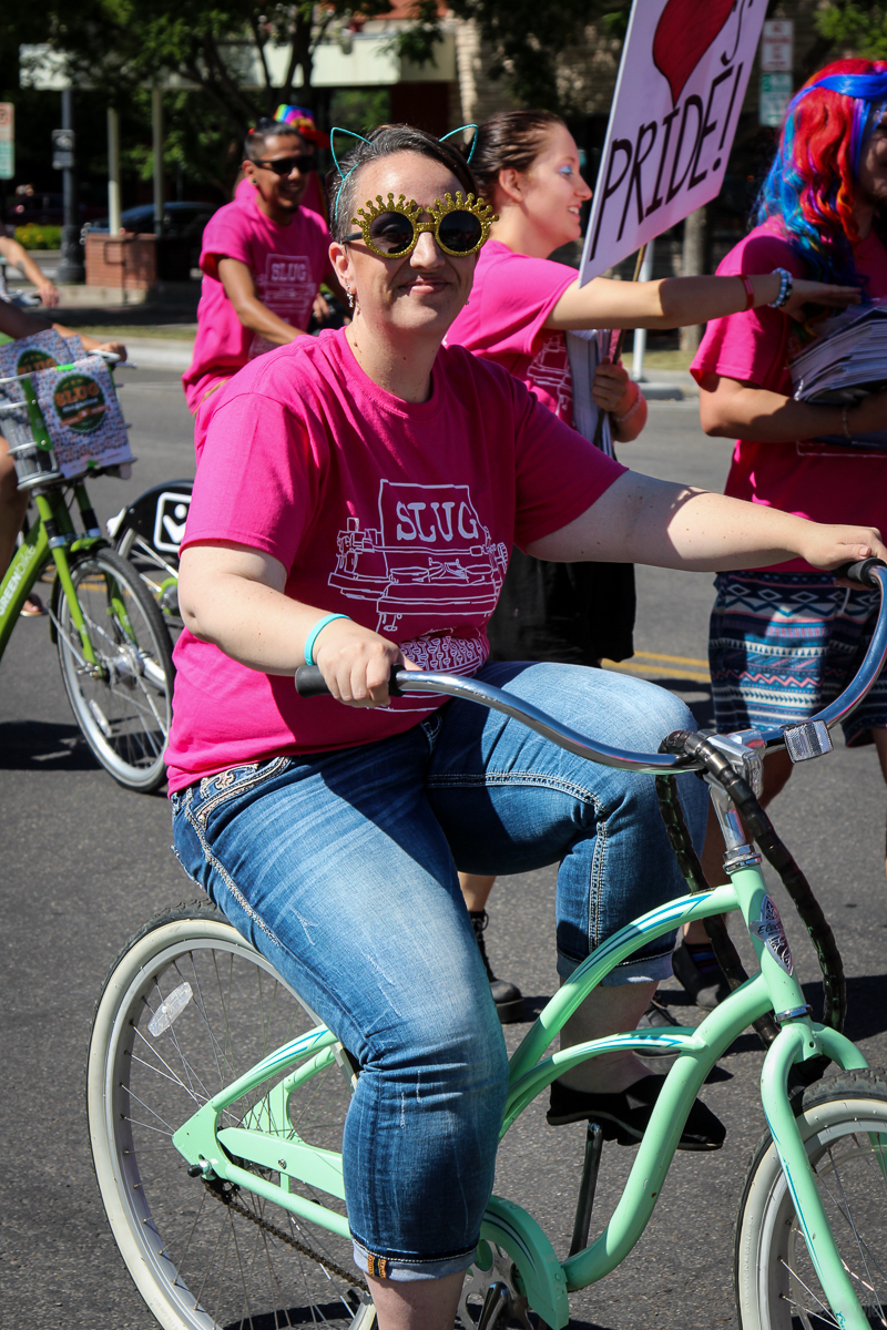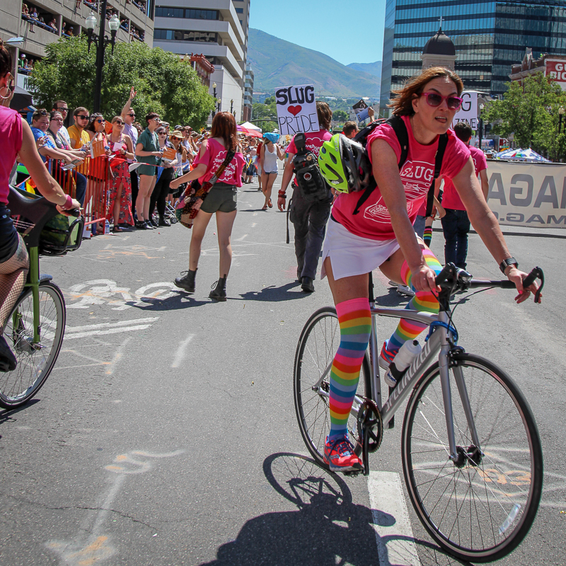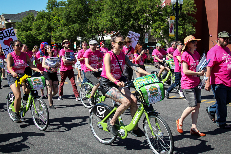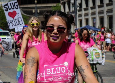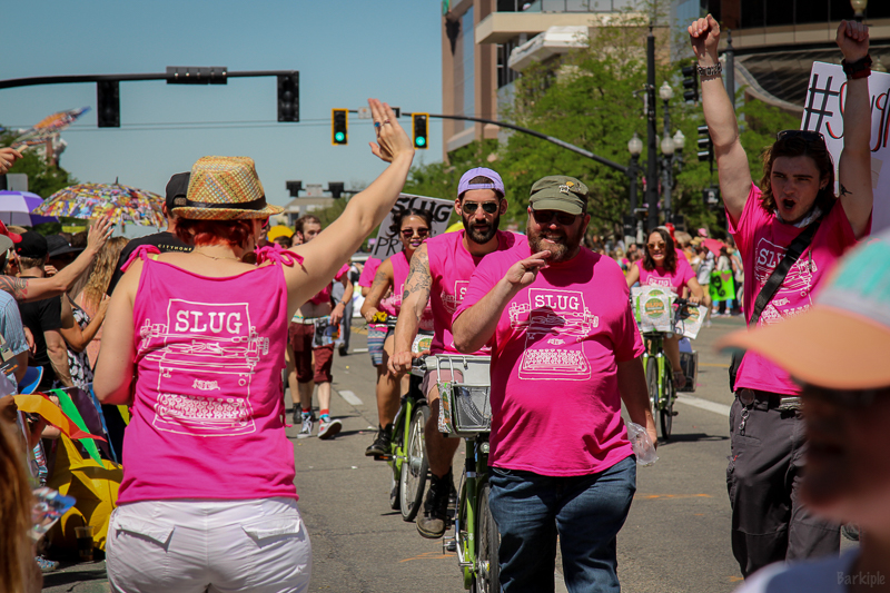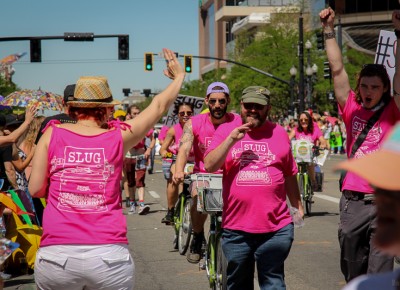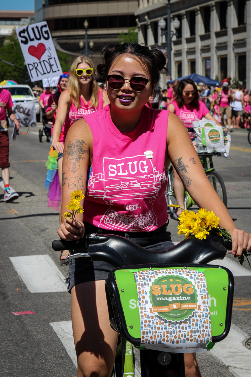 As this pink procession marched along 200 South, the natural ebb and flow of parade dynamics would spread the marchers thin on the street, and then they’d gather in a thick, pink blob of SLUG Mag solidarity for all things LGBTQ+. SLUG cyclists spun tiny laps around the group as SLUG strollers walked among the crowd passing out tchotchkes.