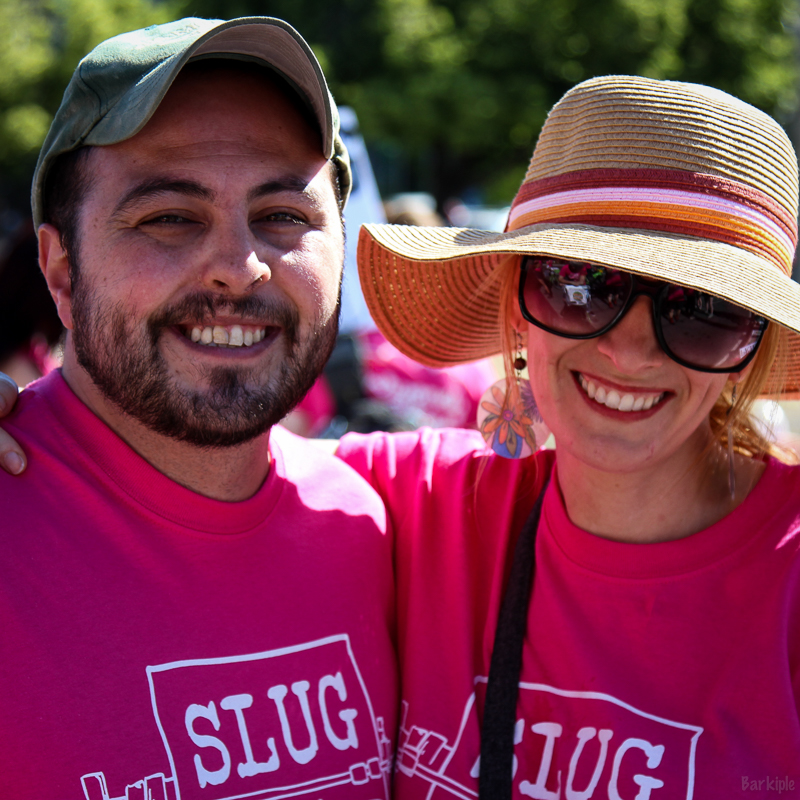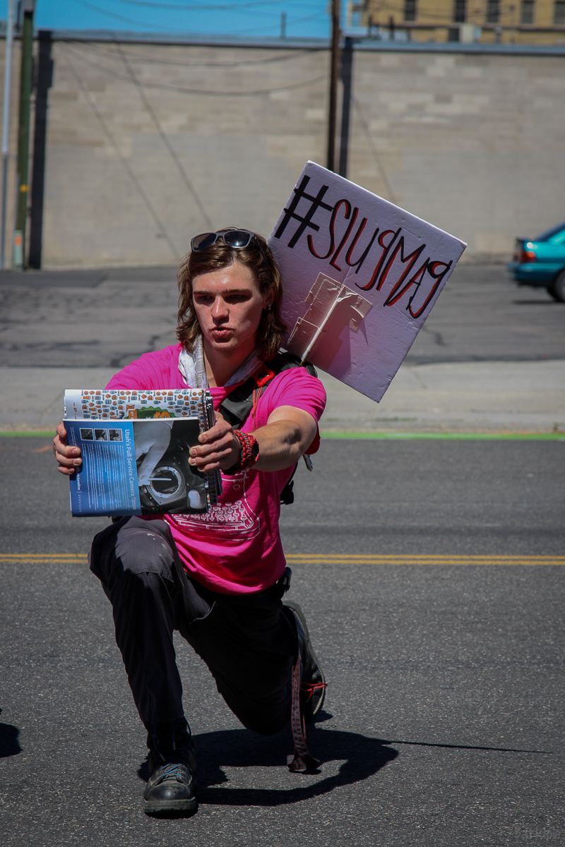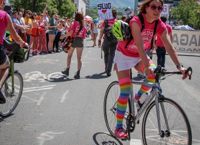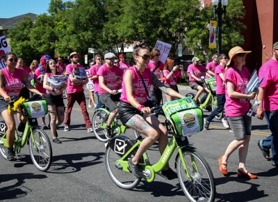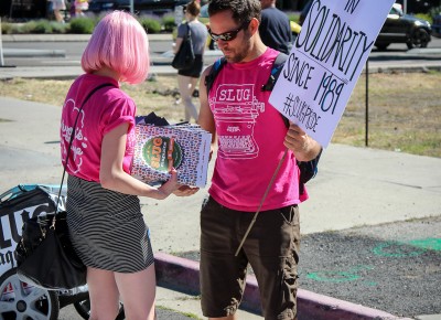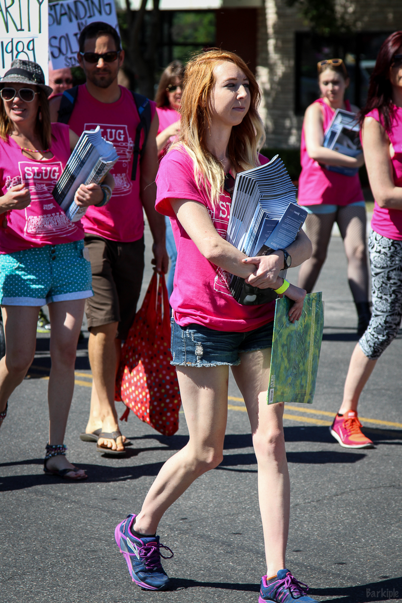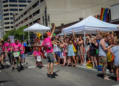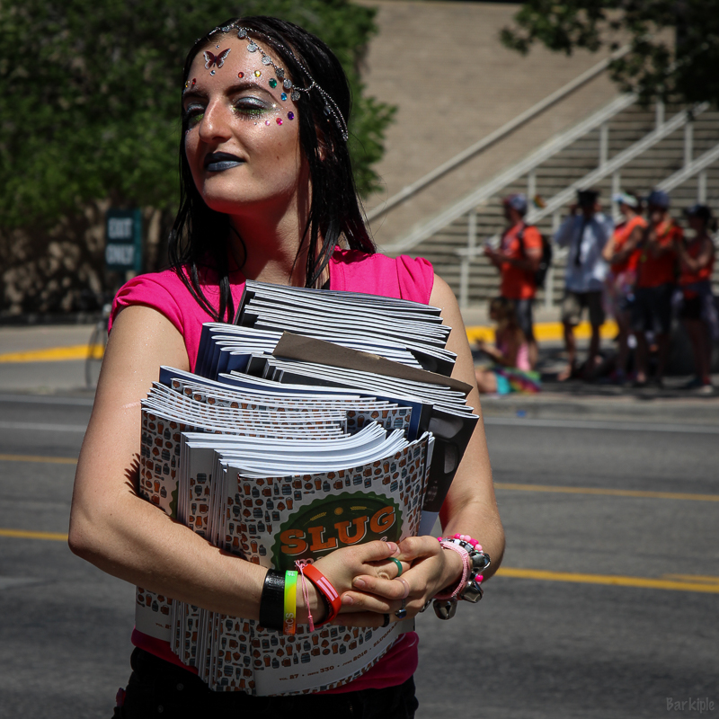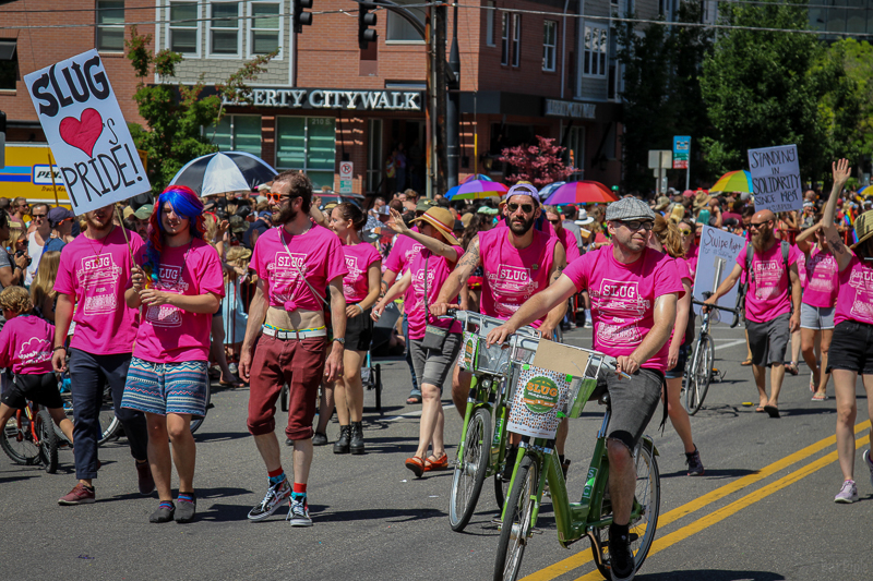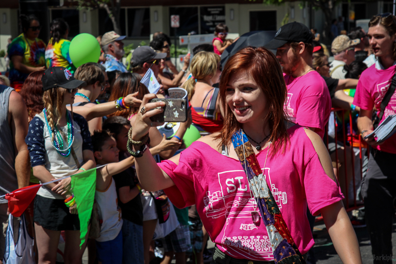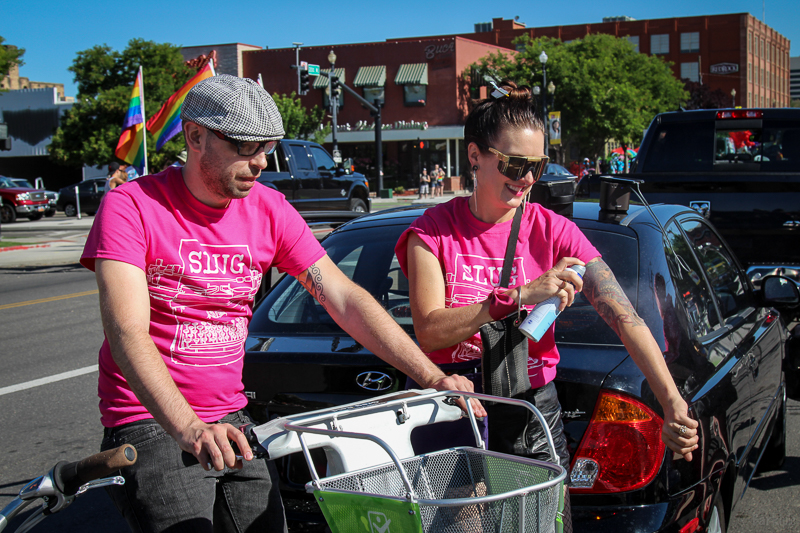 As this pink procession marched along 200 South, the natural ebb and flow of parade dynamics would spread the marchers thin on the street, and then they’d gather in a thick, pink blob of SLUG Mag solidarity for all things LGBTQ+. SLUG cyclists spun tiny laps around the group as SLUG strollers walked among the crowd passing out tchotchkes.