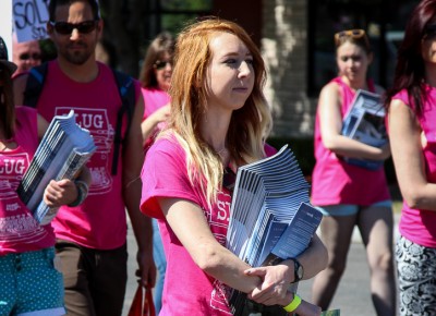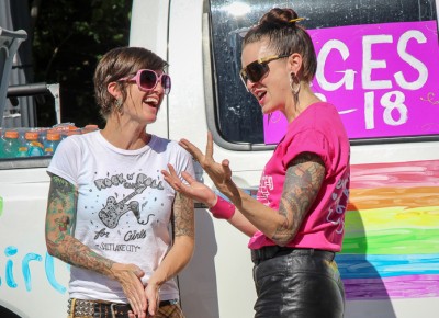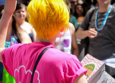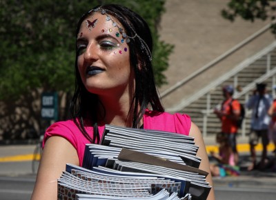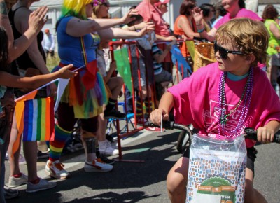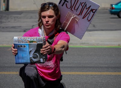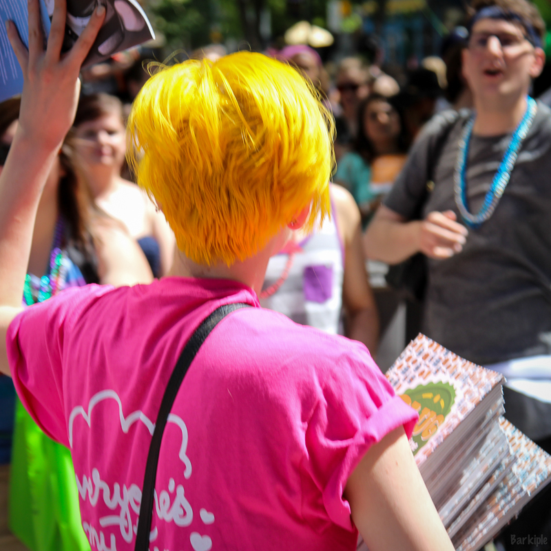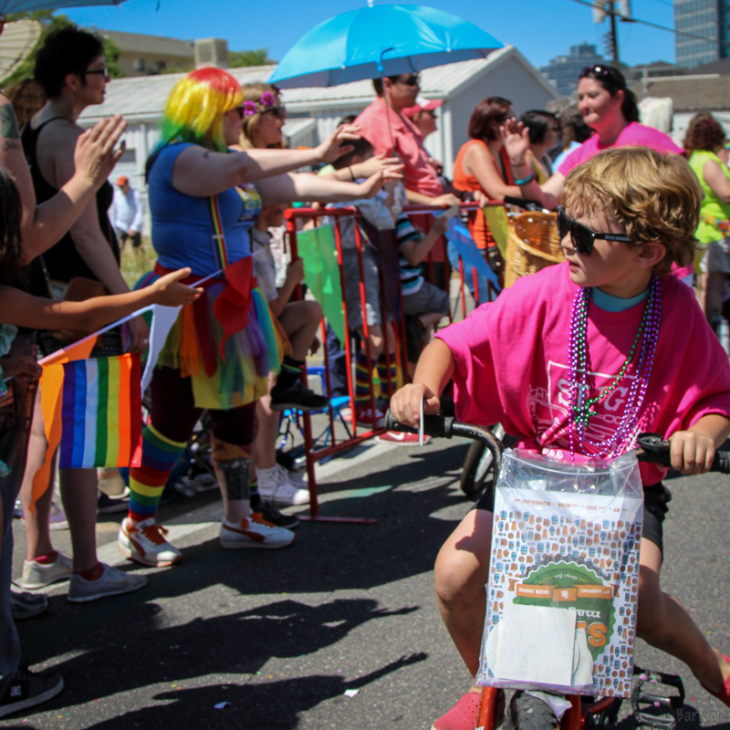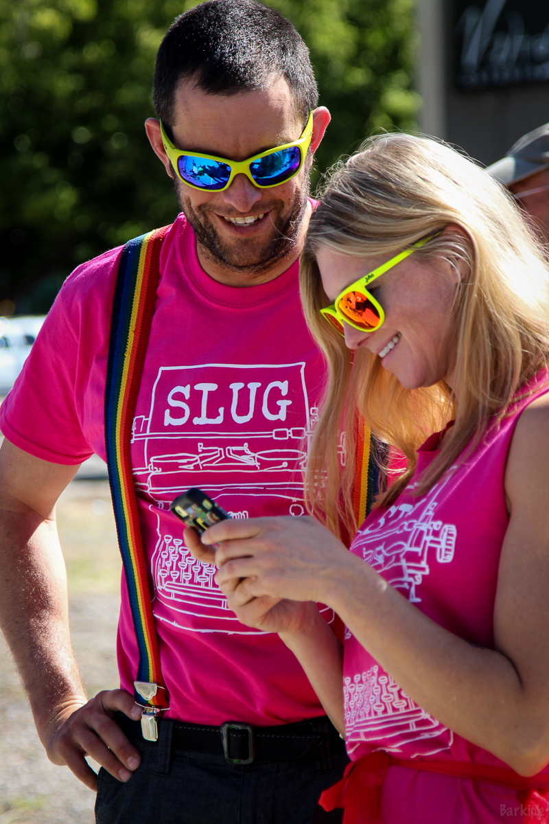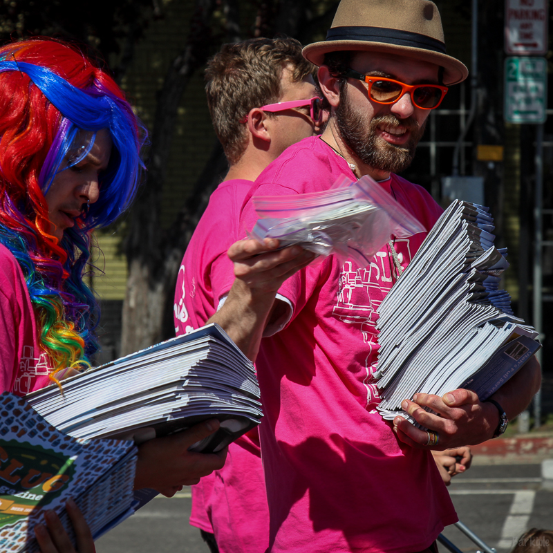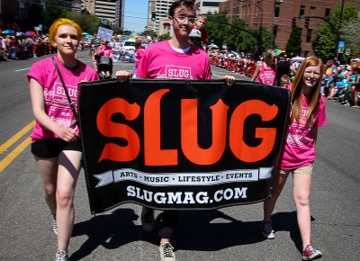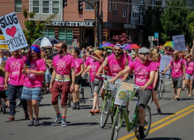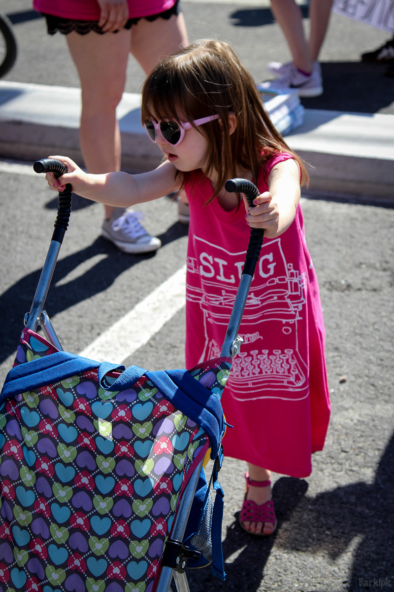 As this pink procession marched along 200 South, the natural ebb and flow of parade dynamics would spread the marchers thin on the street, and then they’d gather in a thick, pink blob of SLUG Mag solidarity for all things LGBTQ+. SLUG cyclists spun tiny laps around the group as SLUG strollers walked among the crowd passing out tchotchkes.