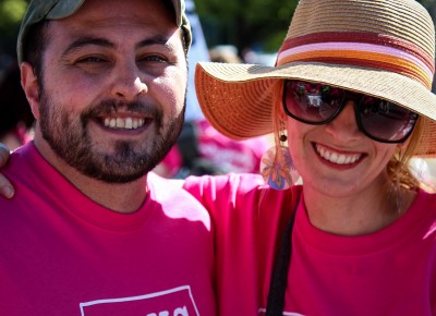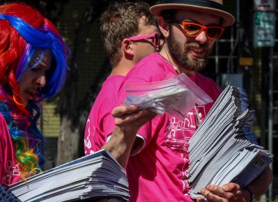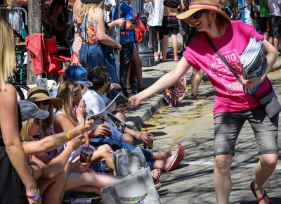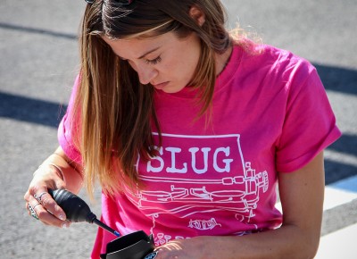 SLUG staffers marched in uniform. This time it was pink T-shirts with a typewriter on the front and the slogan, “everyone’s my type,” on the back, designed by Hey Rooney. As always, a few staffers made creative alterations to these unisex, blocky shirts including opened shoulders, rolled sleeves and scooped necks. One young girl wore her shirt as a tiny dress.