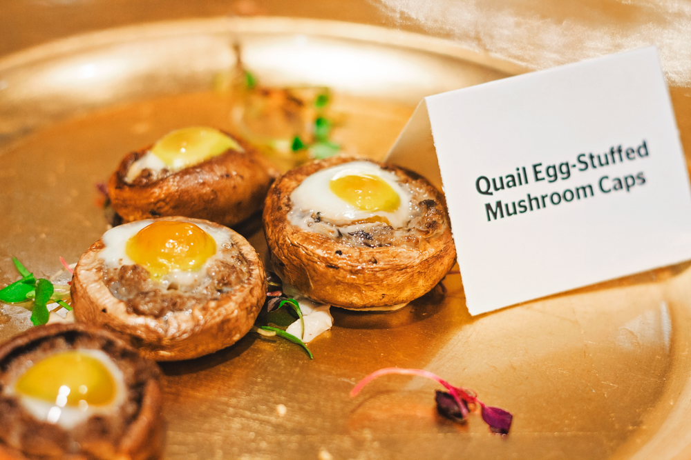 Quail-egg-stuffed mushrooms float across the room on their well-deserved golden thrones. Photo: Talyn Sherer