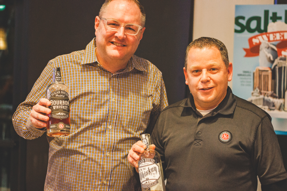 (L–R) Jeff Thompson, grand ambassador, and James Fowler, owner, of Sugarhouse Distillery show off their whiskey varieties that set them apart from others in the local industry. Photo: Talyn Sherer