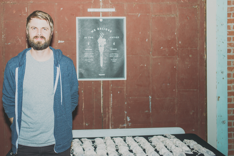 Matt Wigham, who started Big Cartel, stands near goodie bags featuring pins in the shape of a van. Photo: @clancycoop