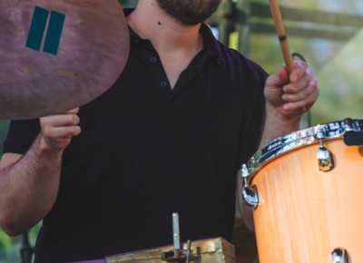 Father John Misty’s touring drummer brings a stick in the air to come down hard on that hi hat during their performance. Photo: Talyn Sherer