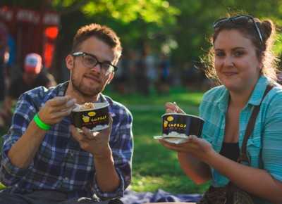 (L–R) Friends Scott Meschke and Hannah Roe enjoy some Cupbop for their first time on Thursday night. Photo: Talyn Sherer