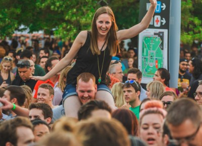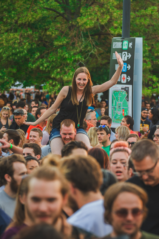 Climbing to the top of the crowd, one fan enjoys her own dance solo on the shoulders of another. Photo: Talyn Sherer