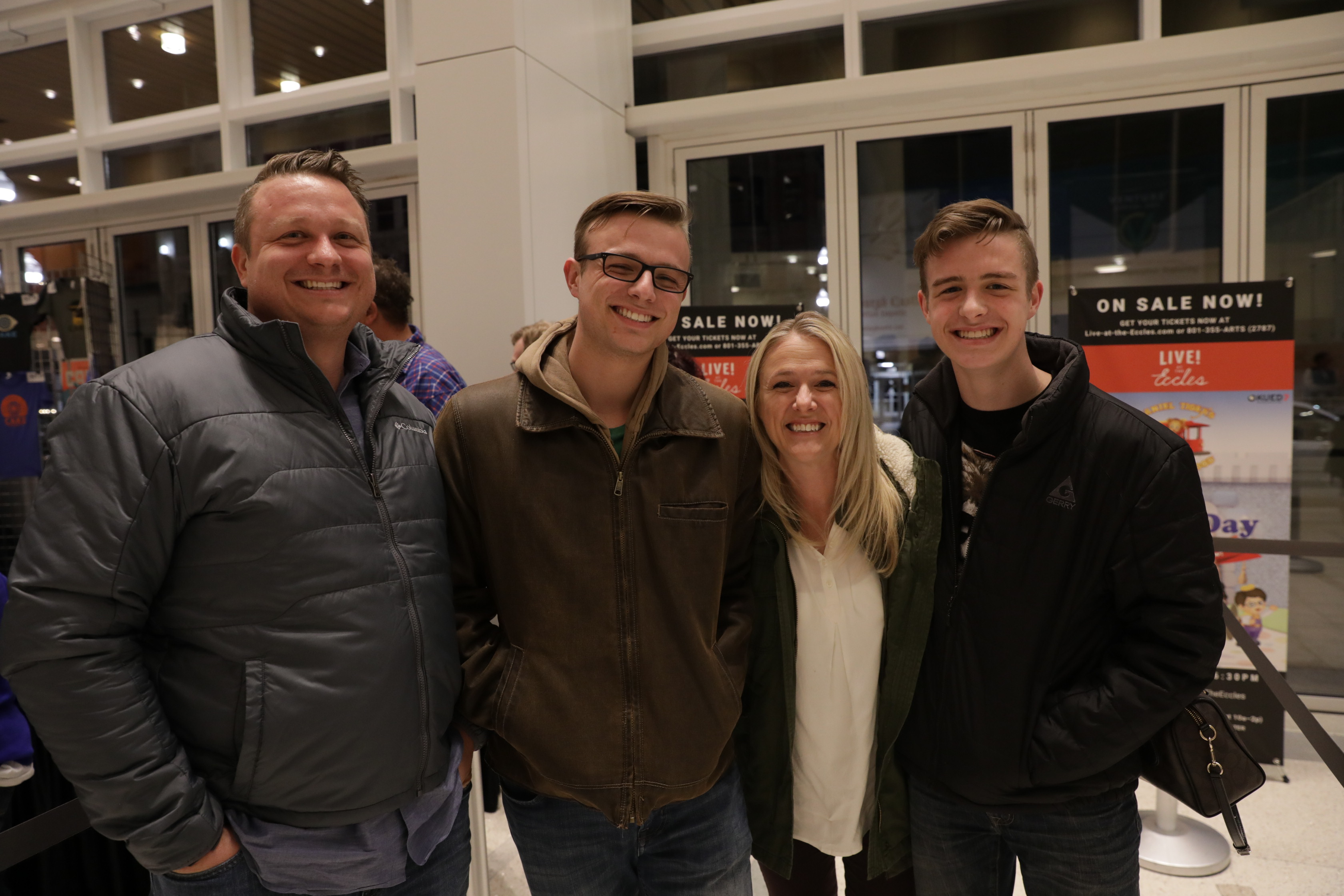 Mike, Brady, Christine and Brayden waiting in line for the merch table. Favorite CAKE songs include “Short Skirt,” “Long Jacket” and “Mustache Man.” Photo: Lmsorenson.net