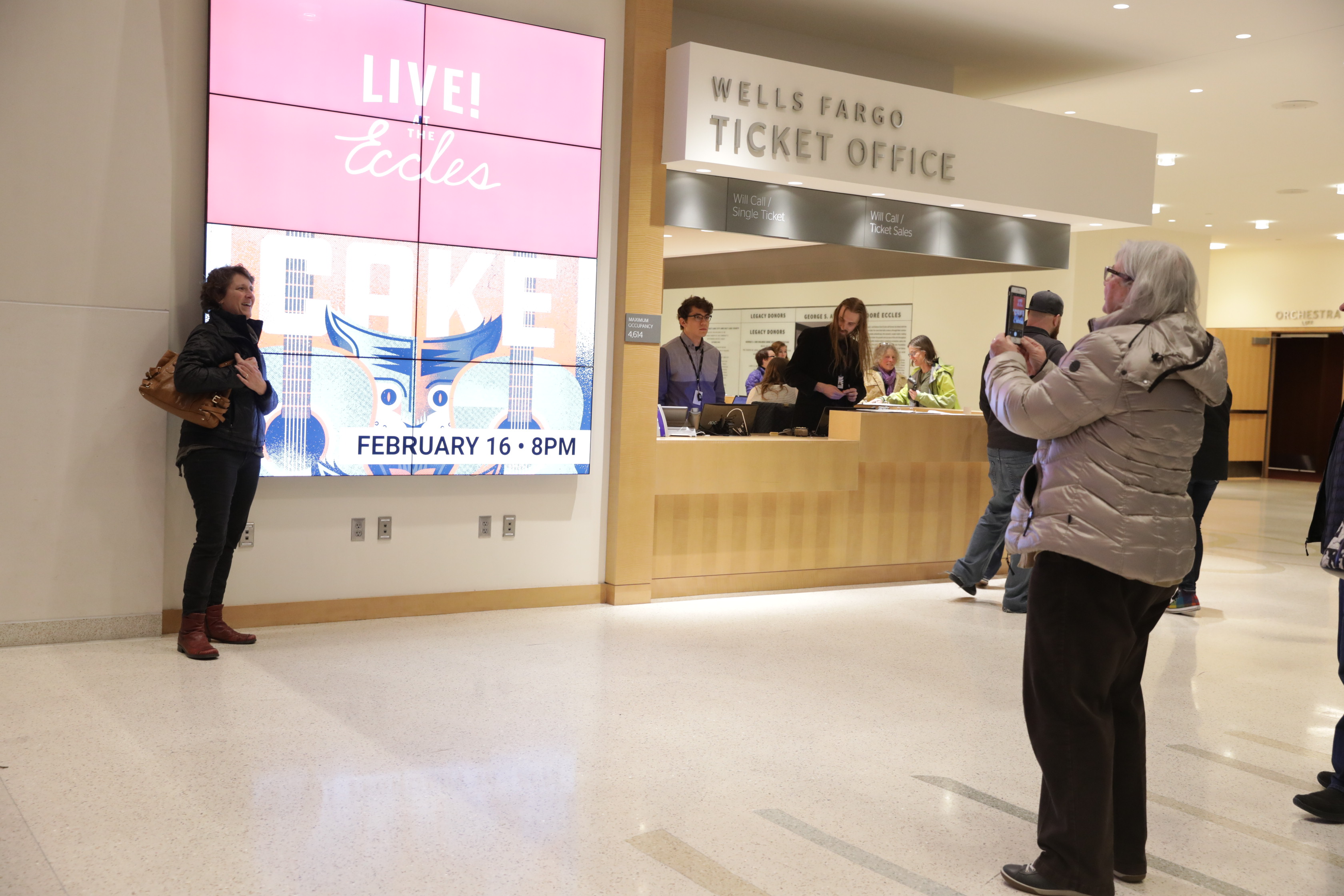 People take turns posing with the giant CAKE event screens in the lobby of the Eccles Theater. Photo: Lmsorenson.net