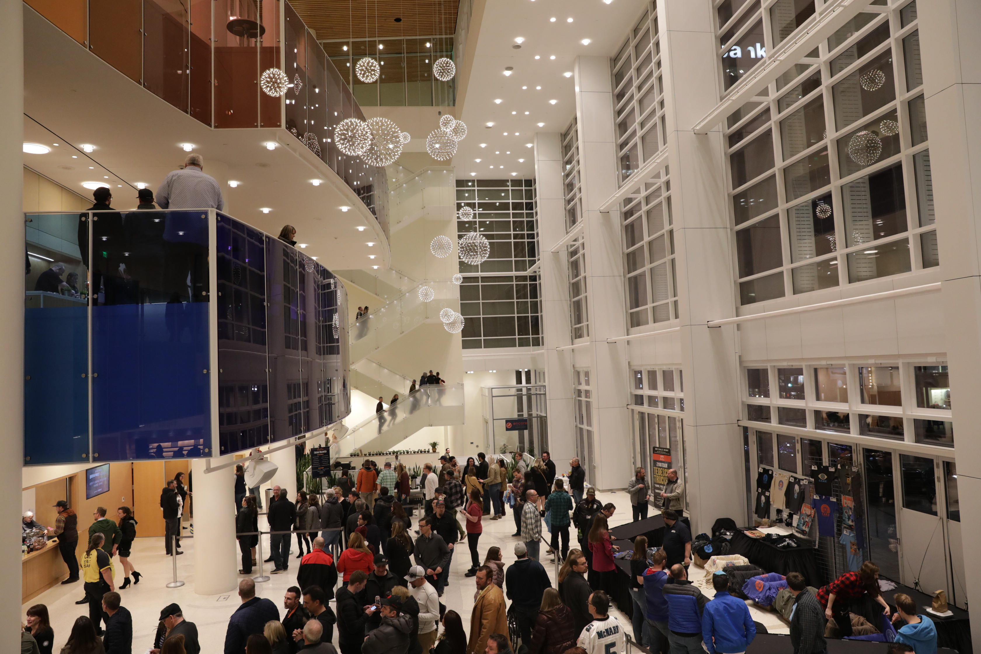 The open-faced glass wall to downtown Salt Lake City and the many lines of attendees heading to their seats at the Eccles Theater. Photo: Lmsorenson.net