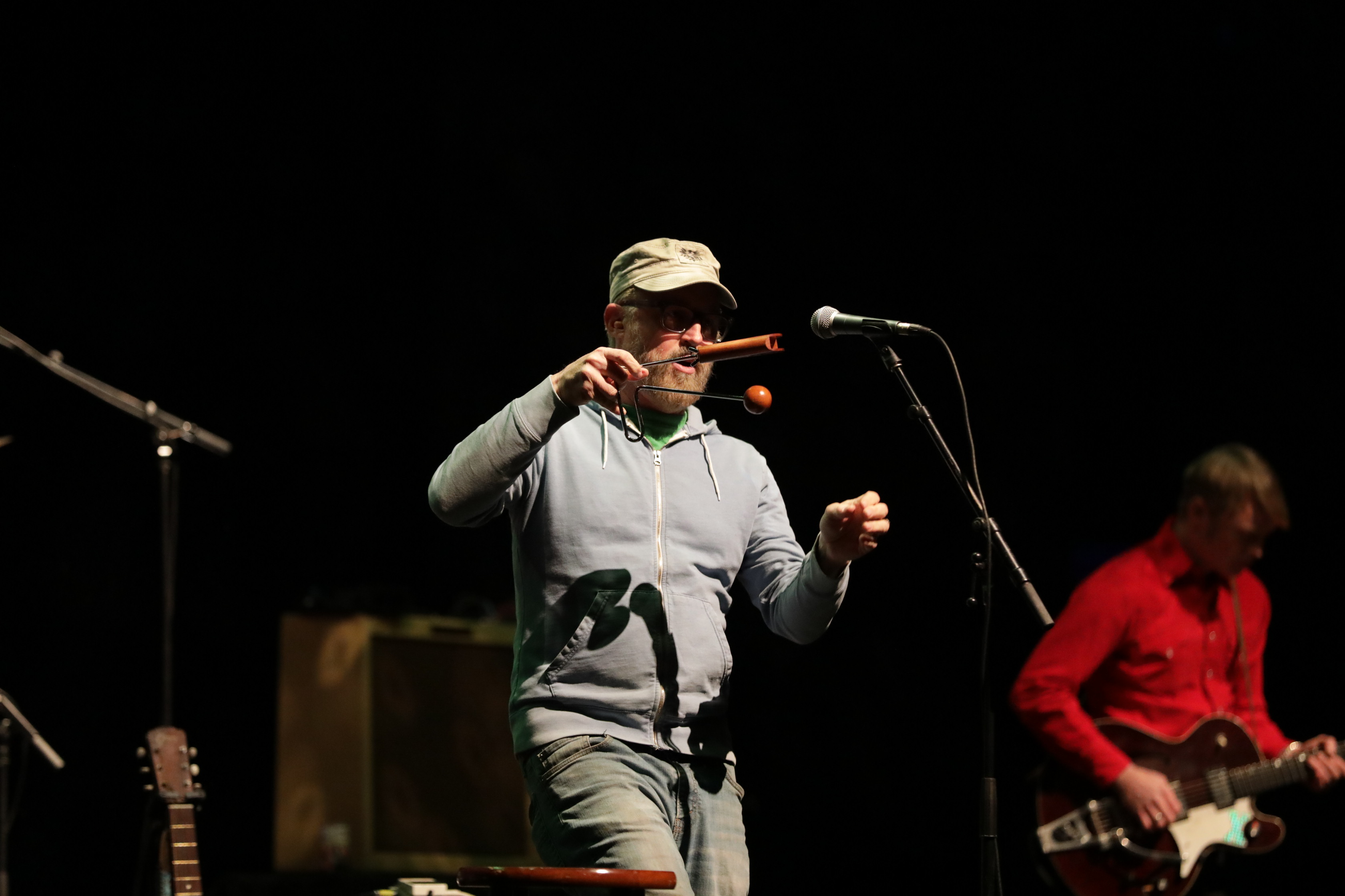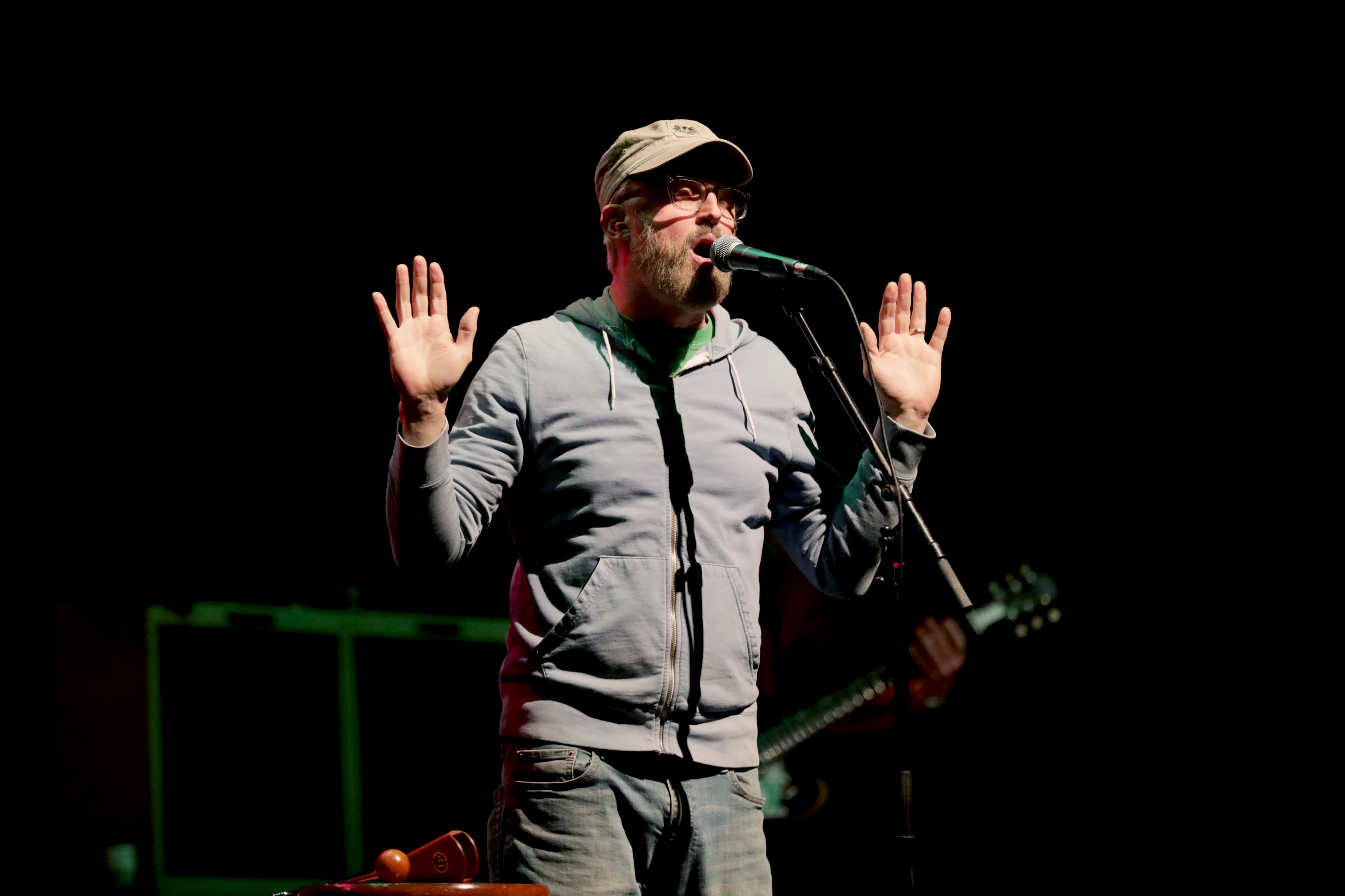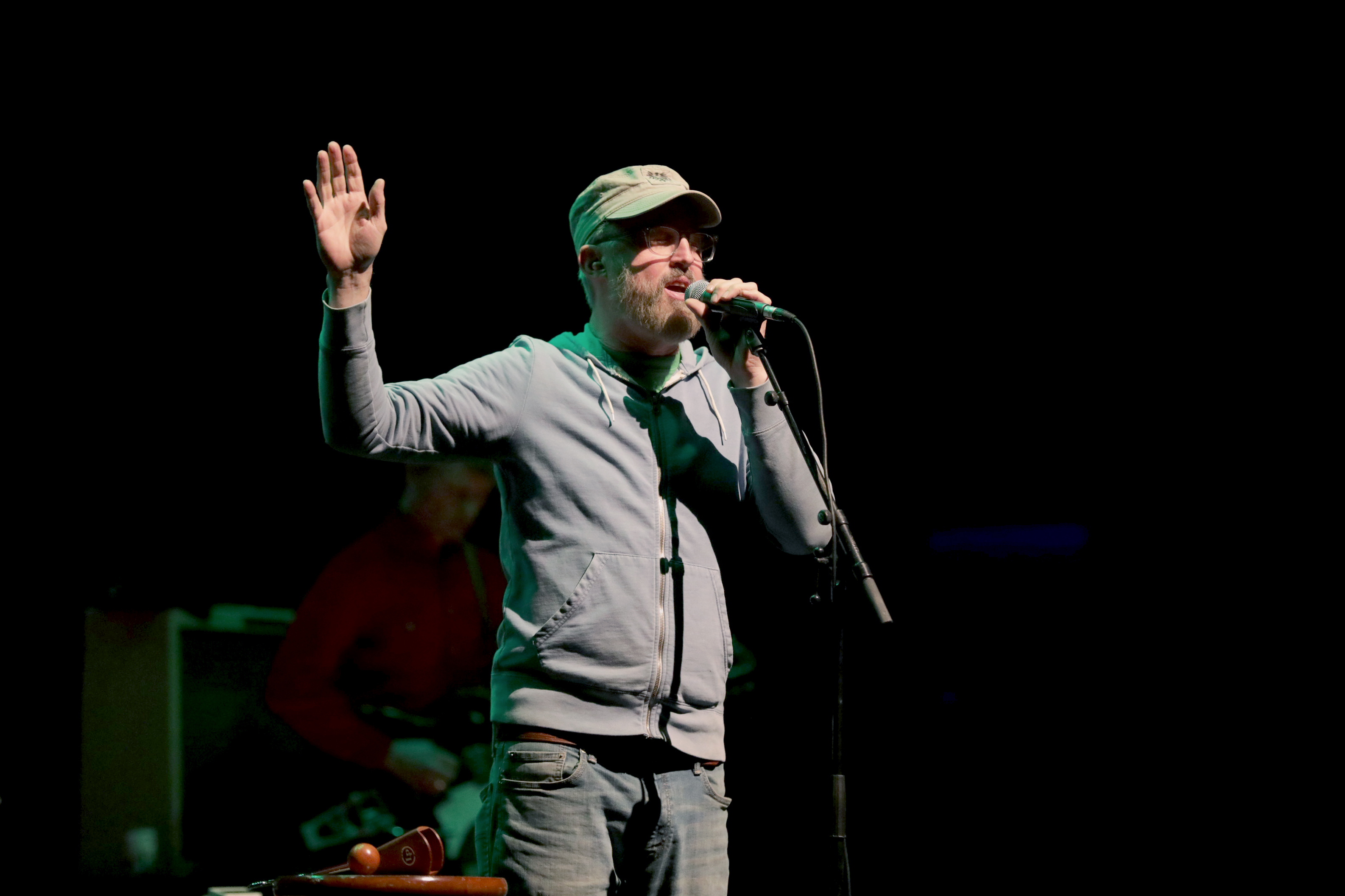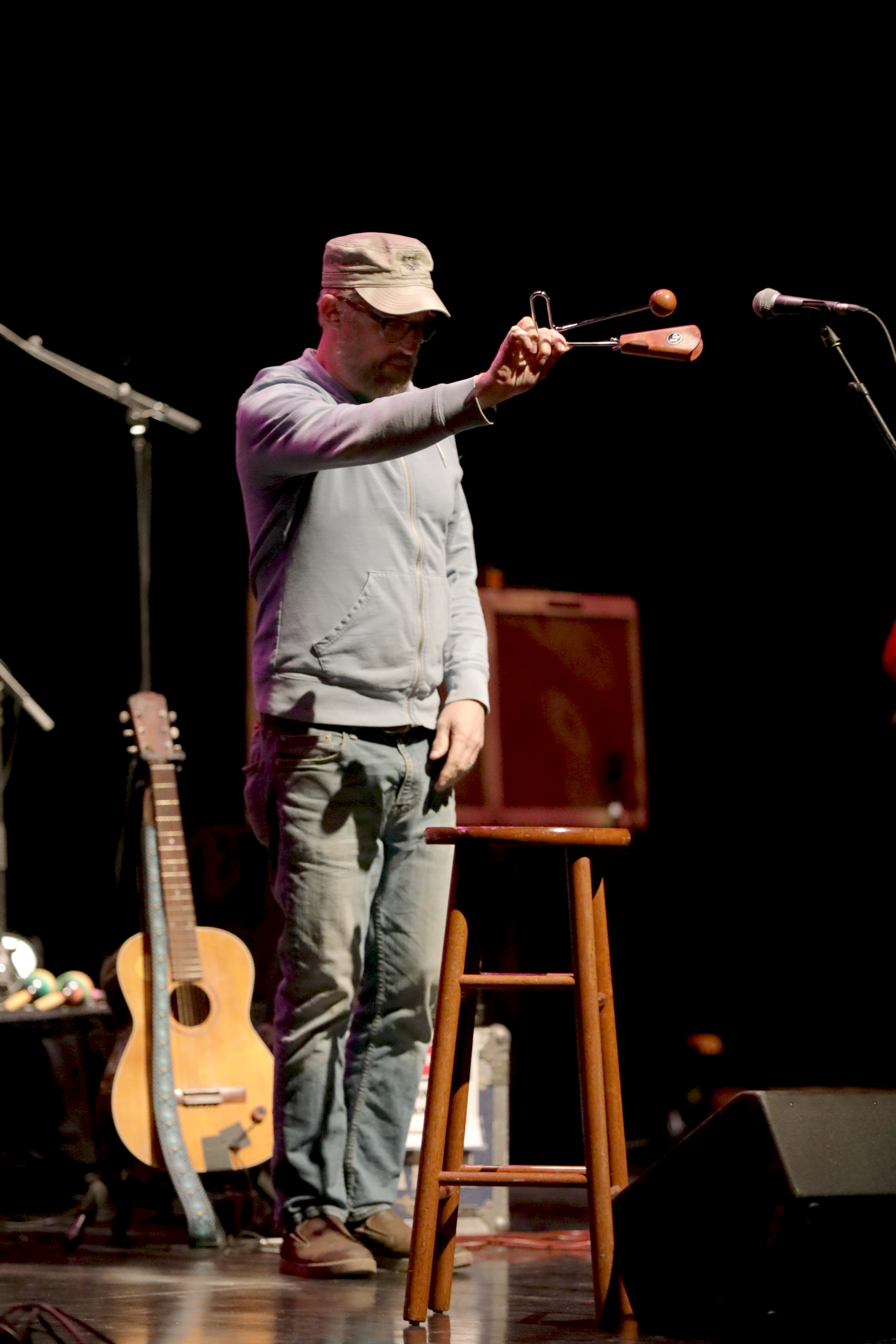 John McCrea points to the audience with the vibraslap to guide their singing along. Photo: Lmsorenson.net