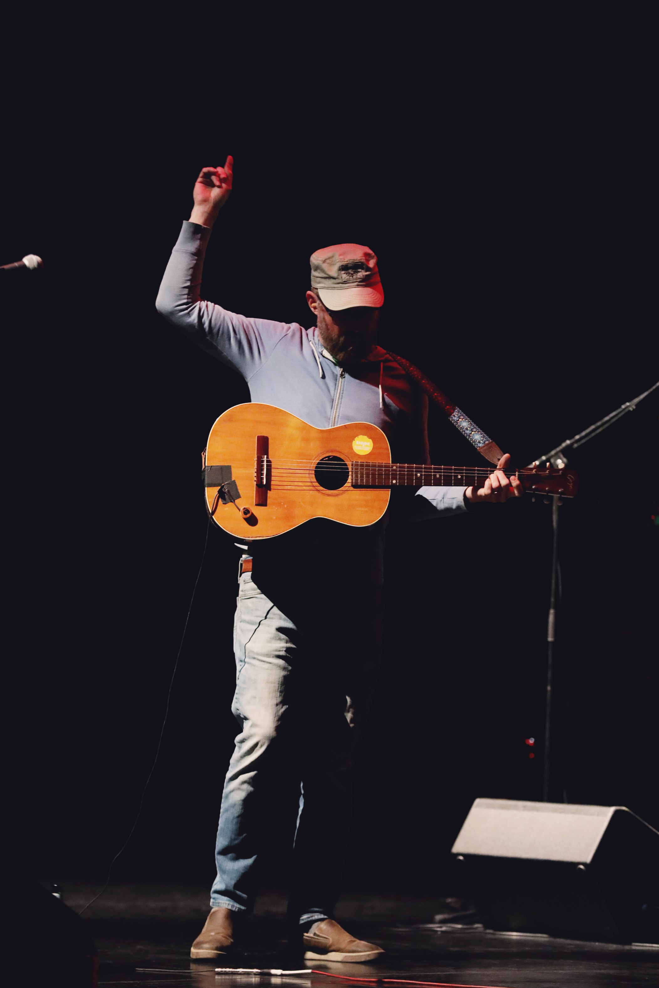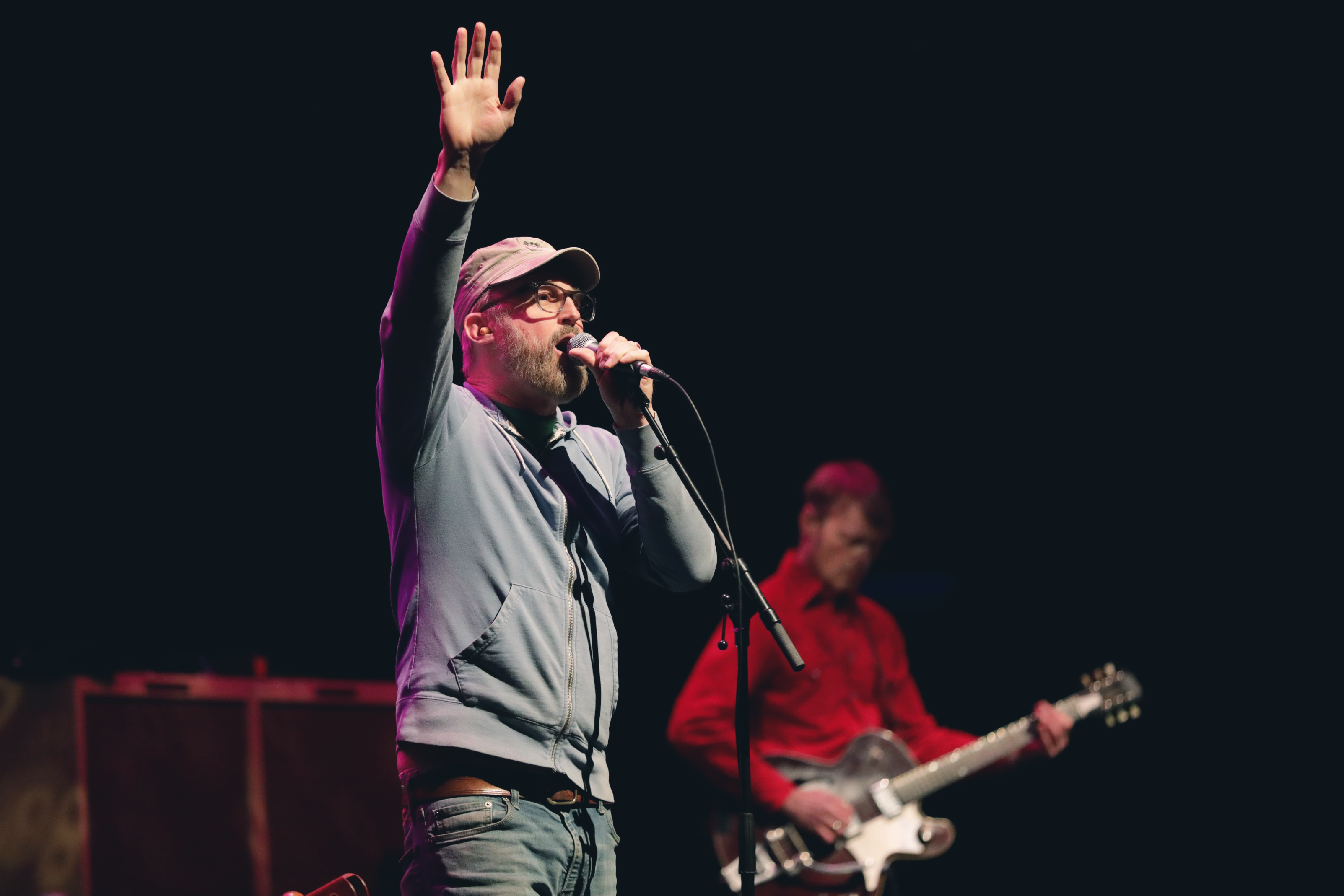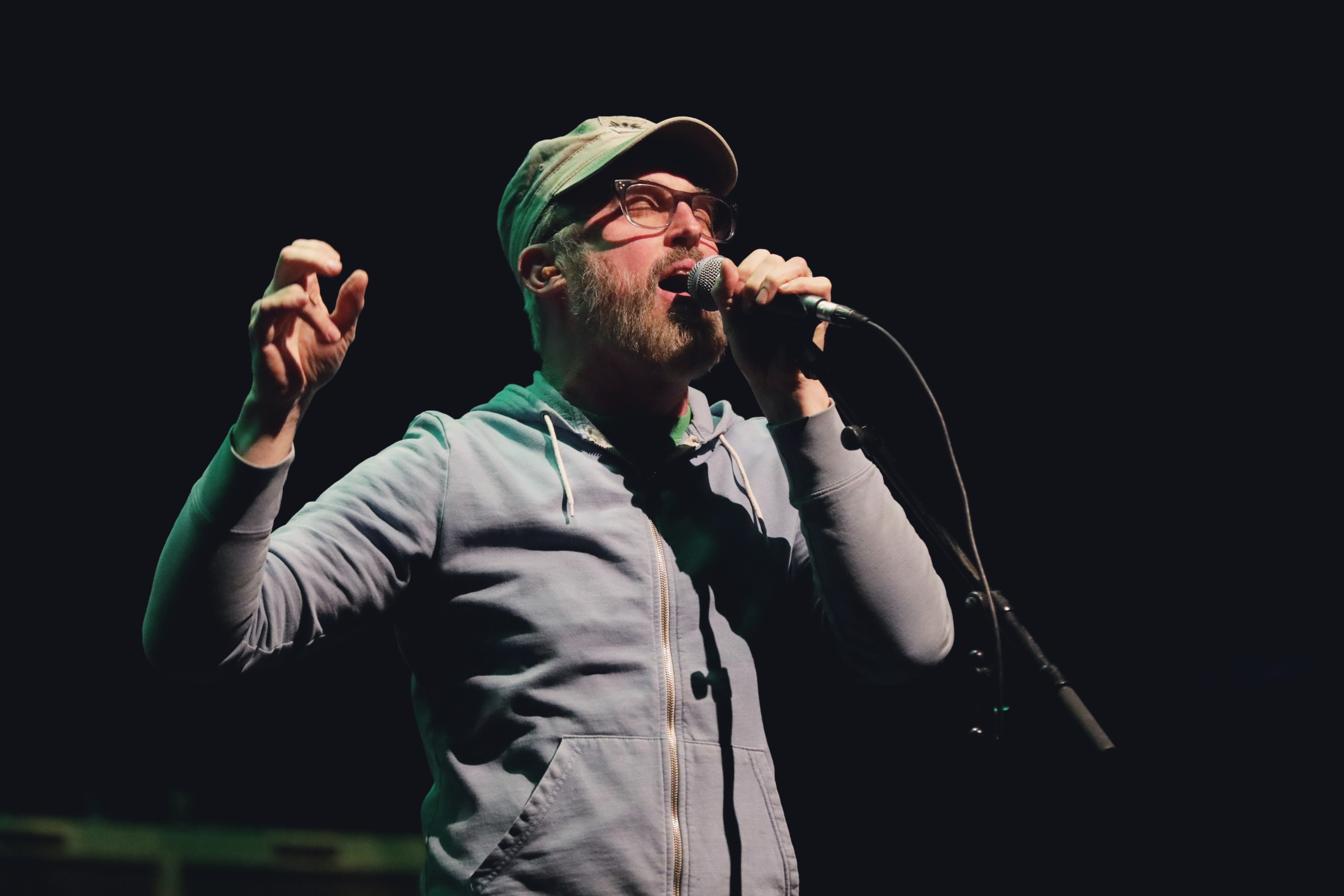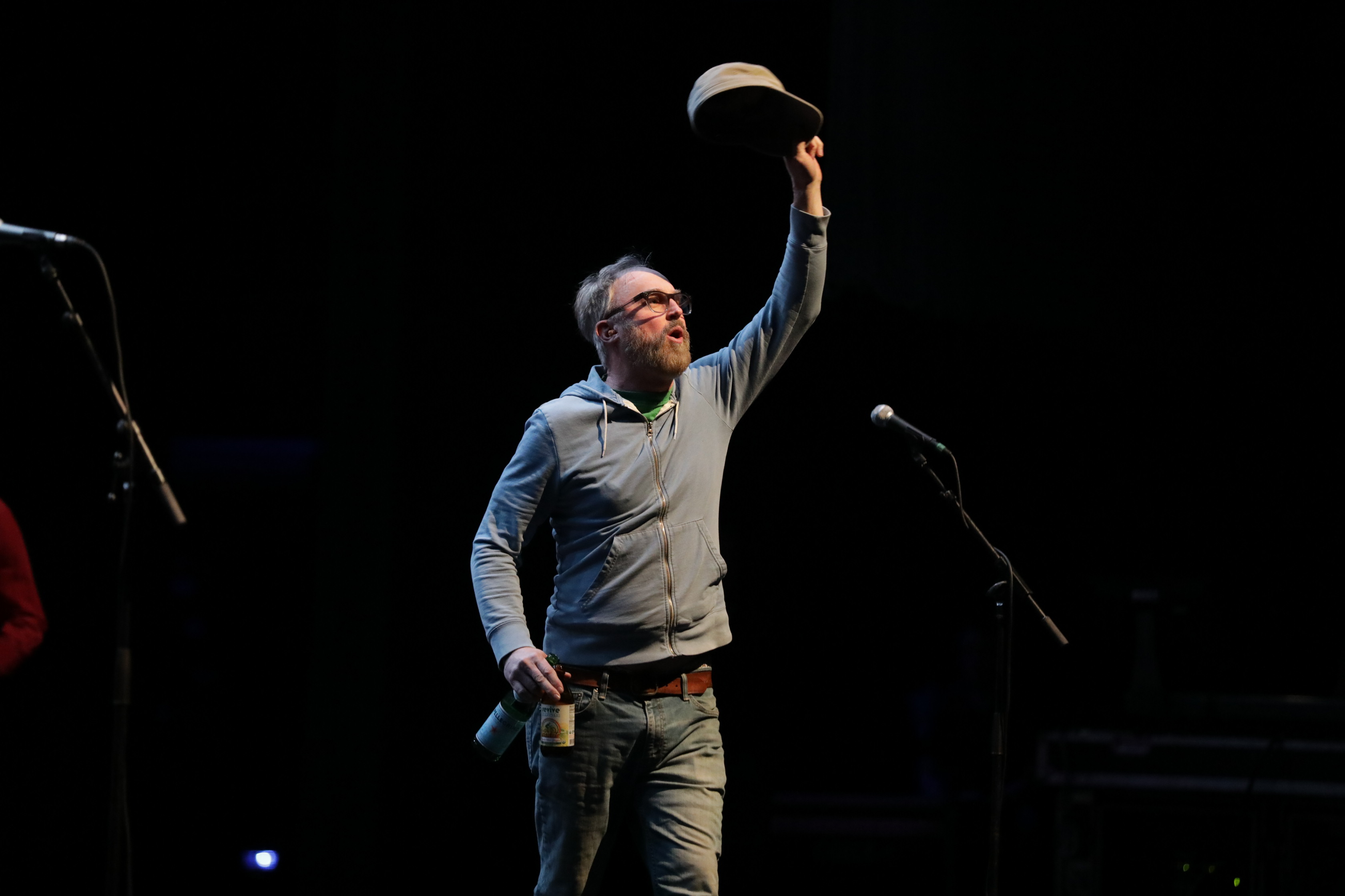 John McCrea points to the audience with the vibraslap to guide their singing along. Photo: Lmsorenson.net