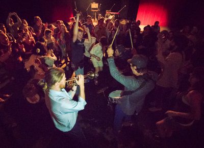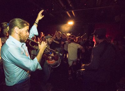 The Honeydrops are seen on the move to descend the stage and play on a dance floor party. Photo: JoSavagePhotography.com