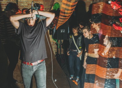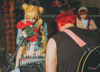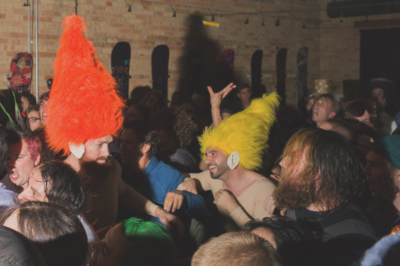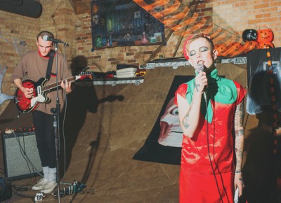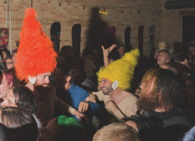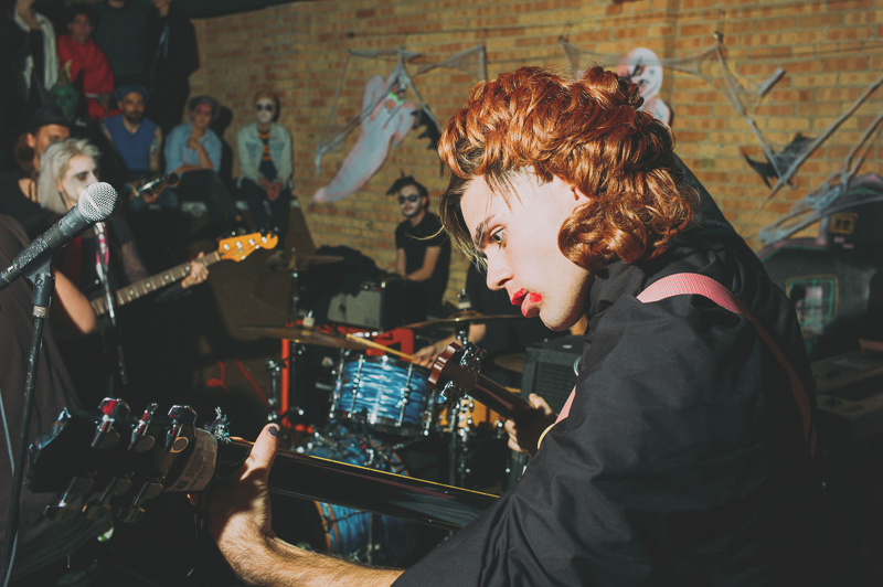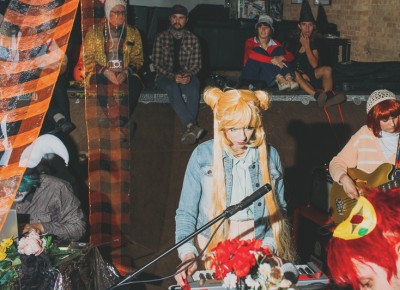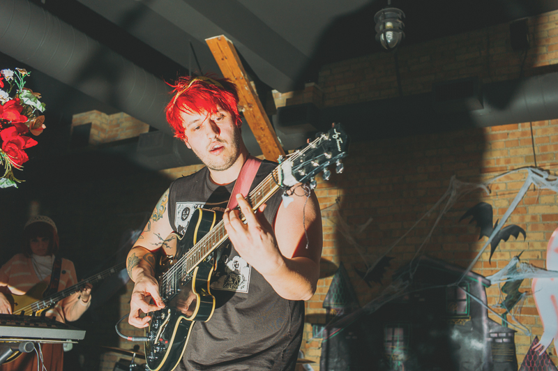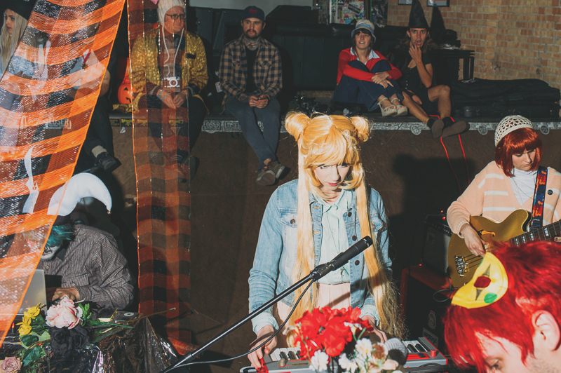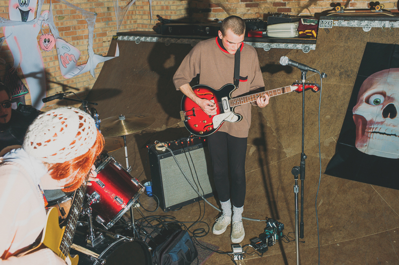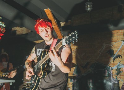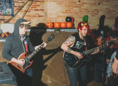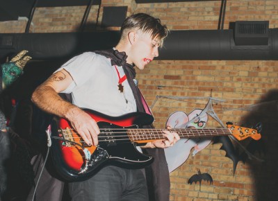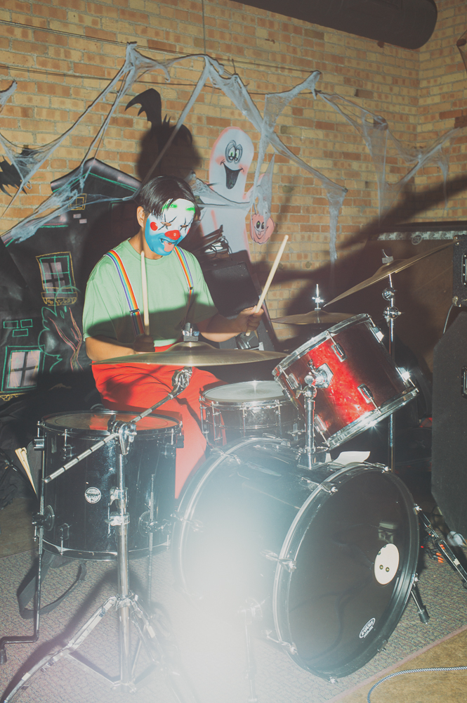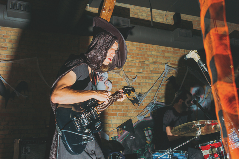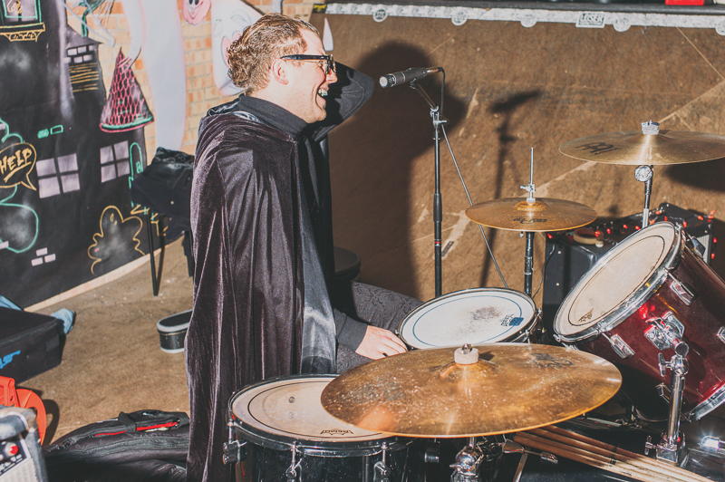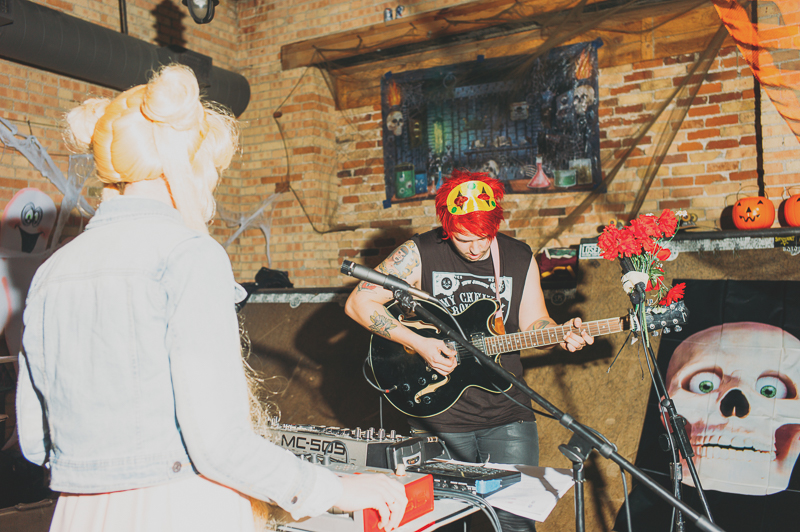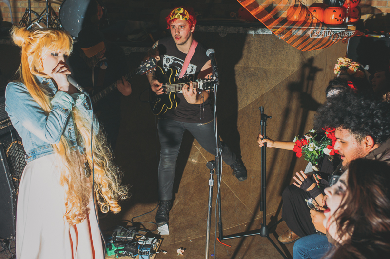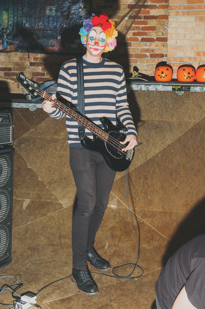 Punk Rock Halloween was held at Super Top Secret, with their mini ramp halfpipe serving as the stage, which was surrounded by spooky artwork and decoration by Robin Banks of Foster Body—who started off the show with The Go-Go’s enduringly catchy “We Got The Beat.” Banks was adorned as a bright red strawberry with green eye shadow to match their chlorophyll. Their set was quick and energetic, including other fan favorite “Vacation.” After a brief break to check out costumes, Fossil Arms brought the dance-y synth-pop of New Order with electronic drum backing which had everyone dancing. Chalk took the stage as Hüsker Dü, playing their ferocious and fast “New Day Rising” which got the crowd moshing, which was the beginning of the end for much of the Halloween decorations which began to be knocked over as the crowd spilled into the small stage.