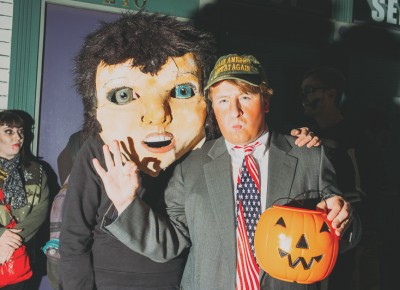 (L–R) Sasha Polo as “secret costume” and Kit Fry as Donald Trump. Photo: Tyson Call @clancycoop