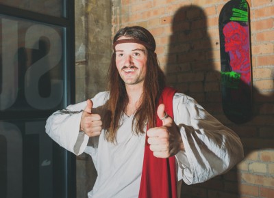 SLUG contributor Sam Milianta as a vegan kosher hot dog. “So I don’t offend anybody,” says Sam. Photo: Tyson Call @clancycoop