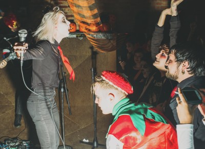 Robin Banks (dressed as a strawberry) sings “We Got the Beat” as The Go-Go’s (Foster Body). Photo: Tyson Call @clancycoop – Punk Rock Halloween kicked off with Robin Banks (dressed as a strawberry) singing “We Got the Beat” as The Go-Go’s (Foster Body). Photo: Tyson Call @clancycoop