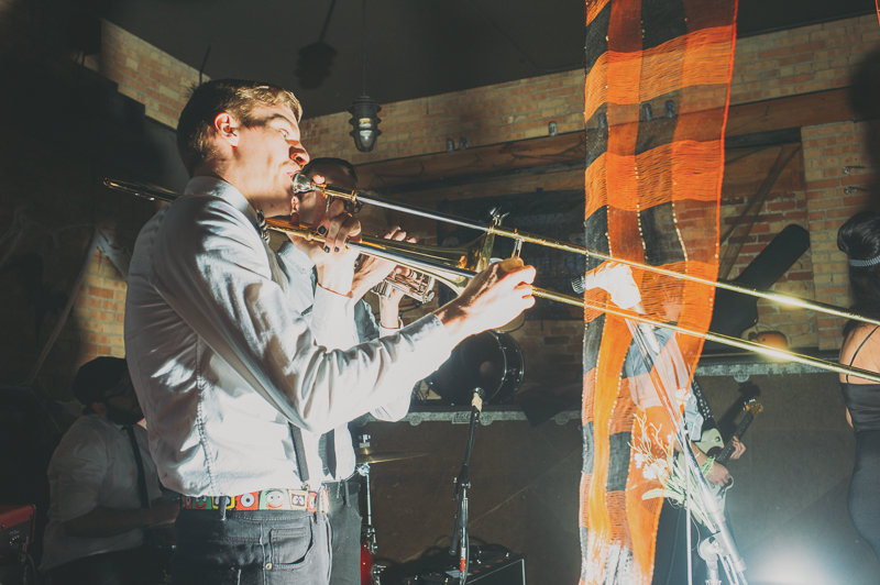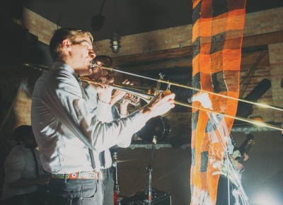 Peter Barret plays the trombone as part of Amy Winehouse (Show Me Island). Photo: Tyson Call @clancycoop