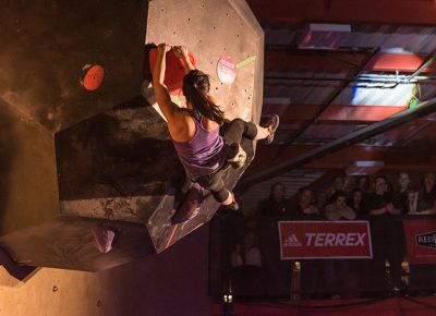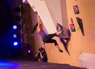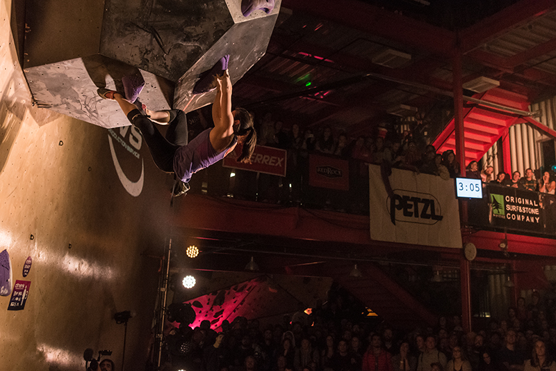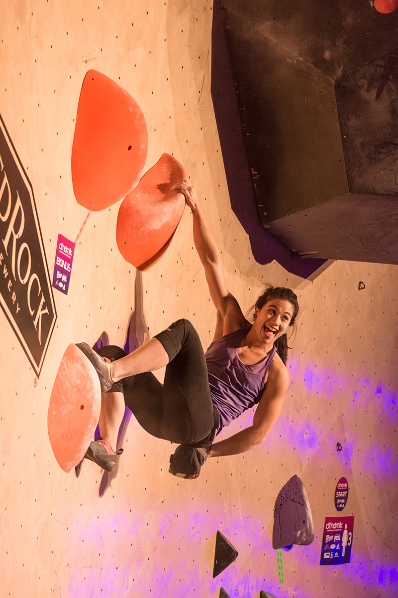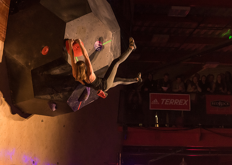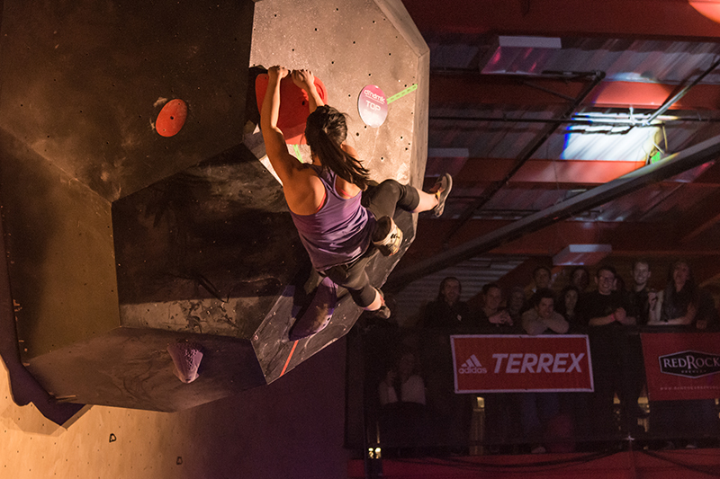 Puccio shows her strength on a huge dynamic move on the women’s final problem. Photo: ColtonMarsalaPhotography.com