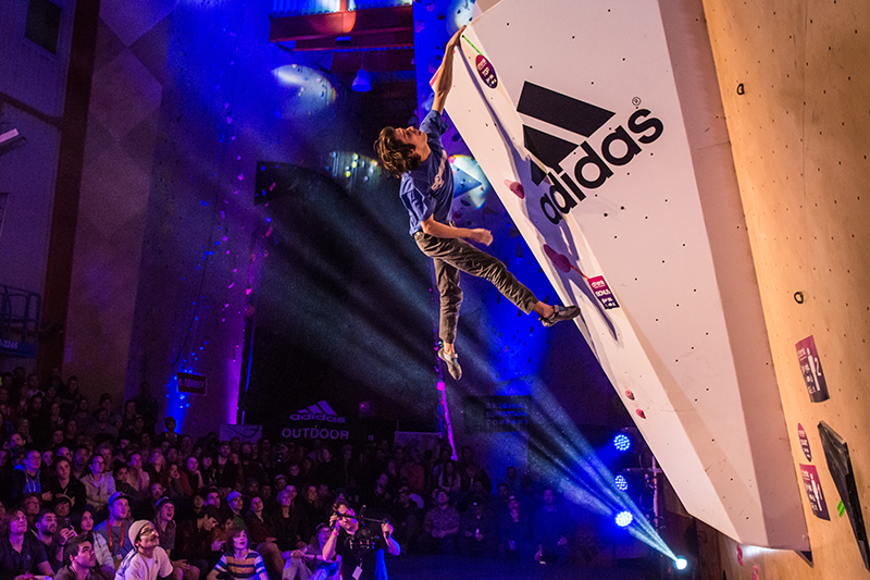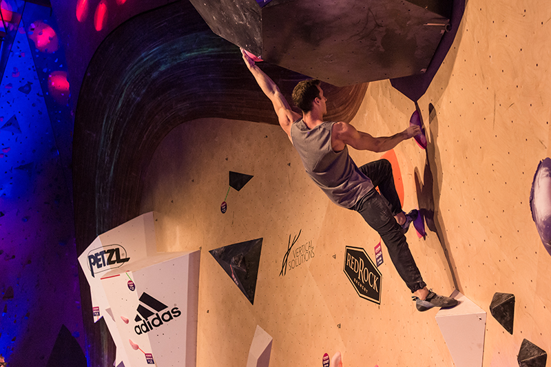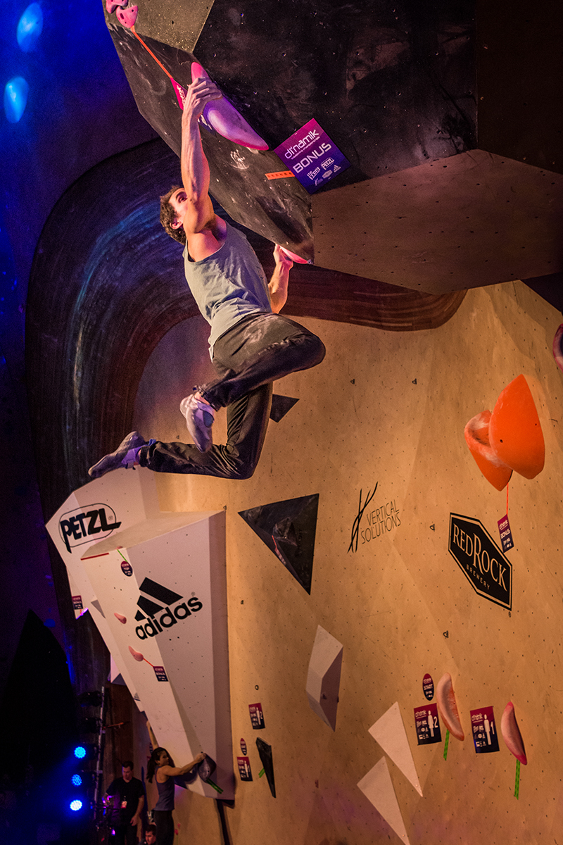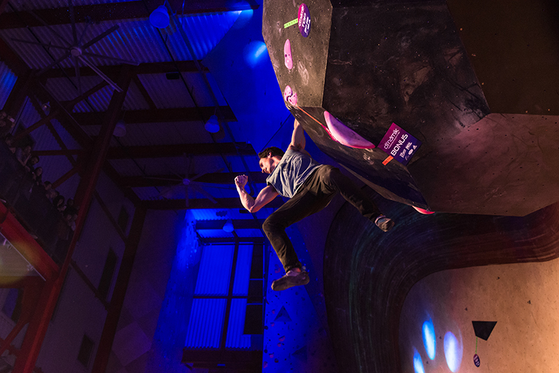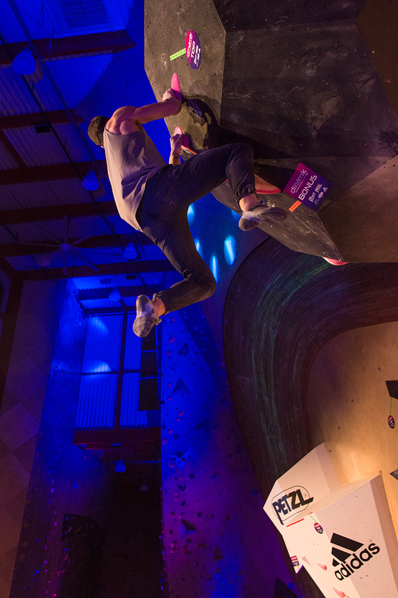 Carlo Traversi gets in position to make the last move on the third and final problem. Photo: ColtonMarsalaPhotography.com