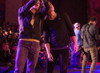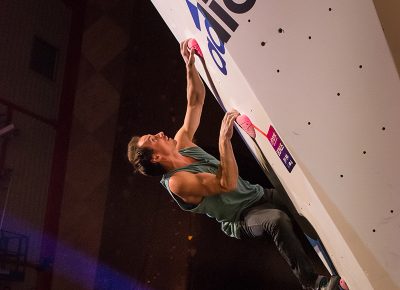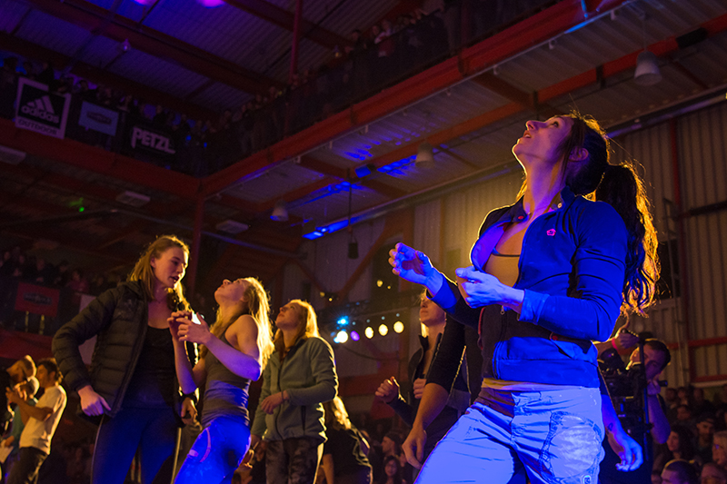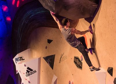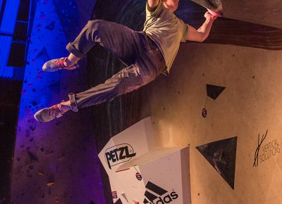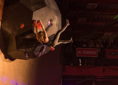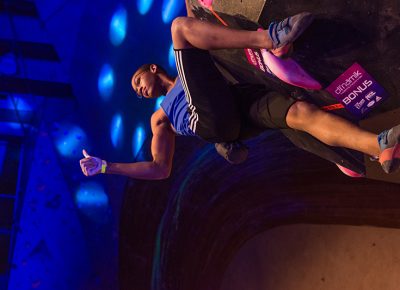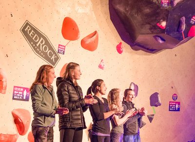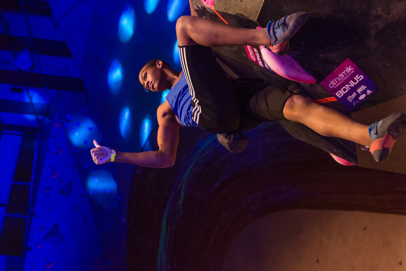 Di’namik consists of three different climbs for each group, allotting four minutes for the climber to attempt to reach the final hold. For those that can reach the top in the first try, a term called “flashing a problem,” more points are awarded to honor this feat. Starting from the lowest scoring qualifier, male and female climbers attempted their problems side by side during the short race against the clock. The first men’s problem consisted of a huge dynamic move, necessitating a tight grip on the wall during a swing. In the third women’s problem, 14-year-old Sami Singleton landed the move of the evening; using her strength, she launched herself into the air, grabbing hold of two pinches and gripping tight while her legs swung from the momentum. Mind-blown, I dropped my camera and I began cheering for her. The uplifting competition showed off the talent and fitness of each individual, causing wild roars of excitement from the crowd.