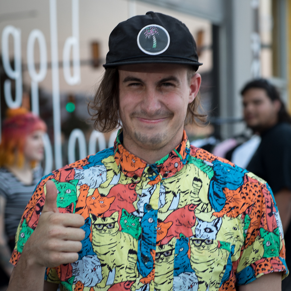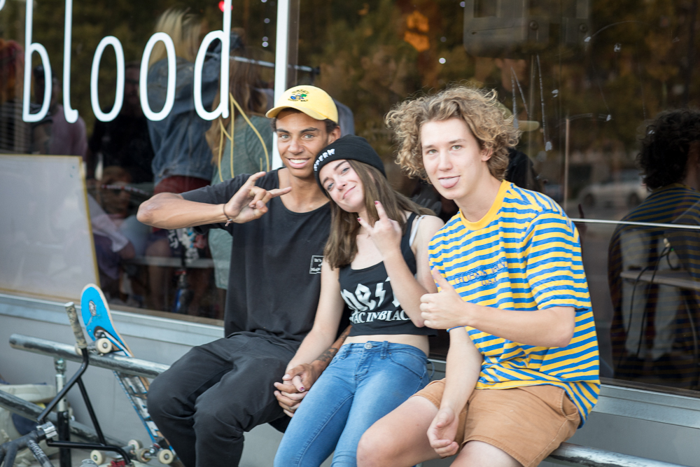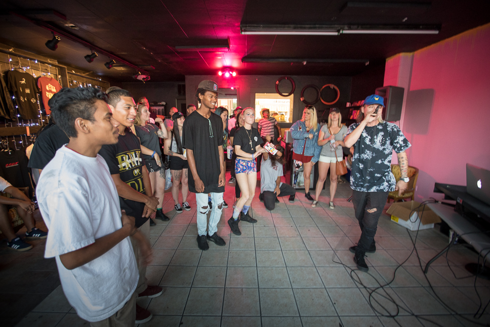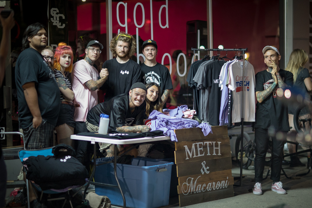 The space is currently stocked with BMX bikes, mugs, T-shirts, hoodies and hats. And for tonight’s opener, it’s all pushed aside to create a dance space with room for bands in the corner. Corvette Boys, Radius and Swell Merchants kept it loud inside, and a Meth & Macaroni pop-up kept it cool on the sidewalk. It was a welcoming scene filled with friendly artists and enthusiasts.