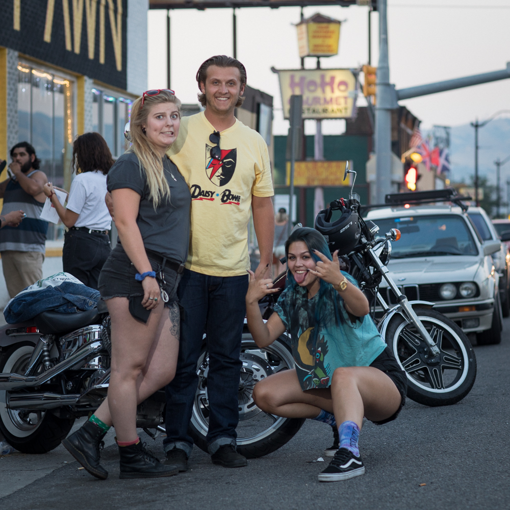 (L–R) Annelise Busch, Jeremy Wilkinson and Rileigh Aleshire pose in front of Busch’s and Wilkinson’s motorcycles. Busch appreciates the vintage and custom offerings from Gold Blood on 1526 South State. Photo: John Barkiple