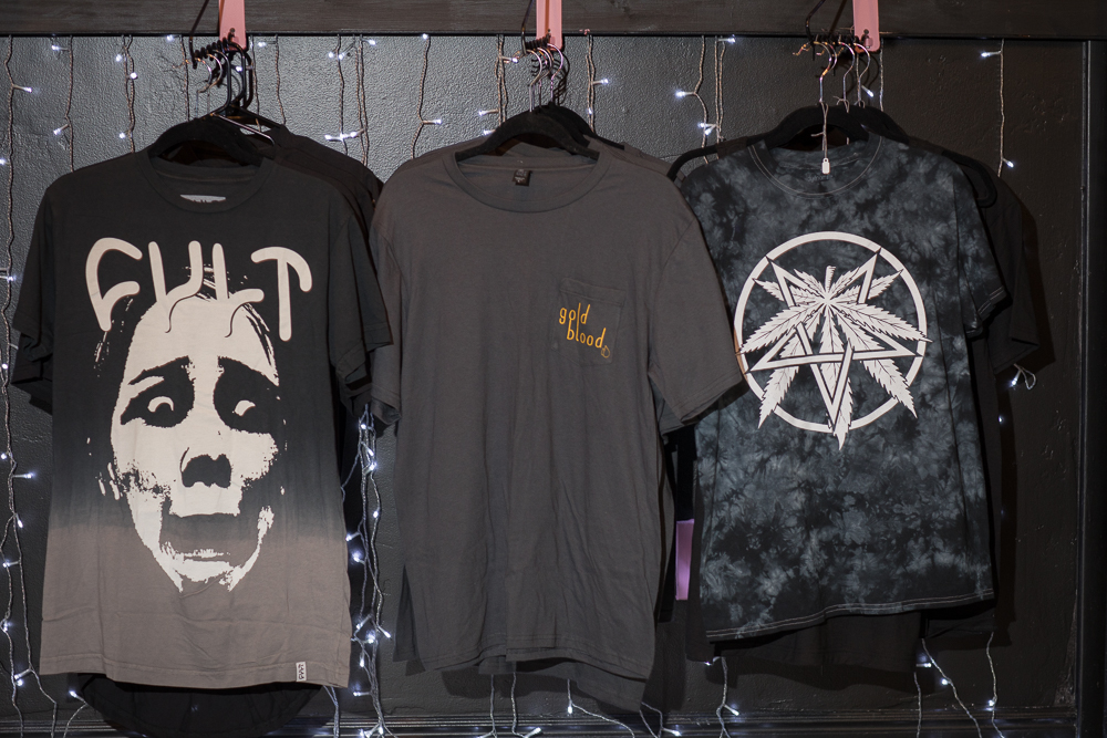 Three T-shirts for sale at Gold Blood. Photo: John Barkiple