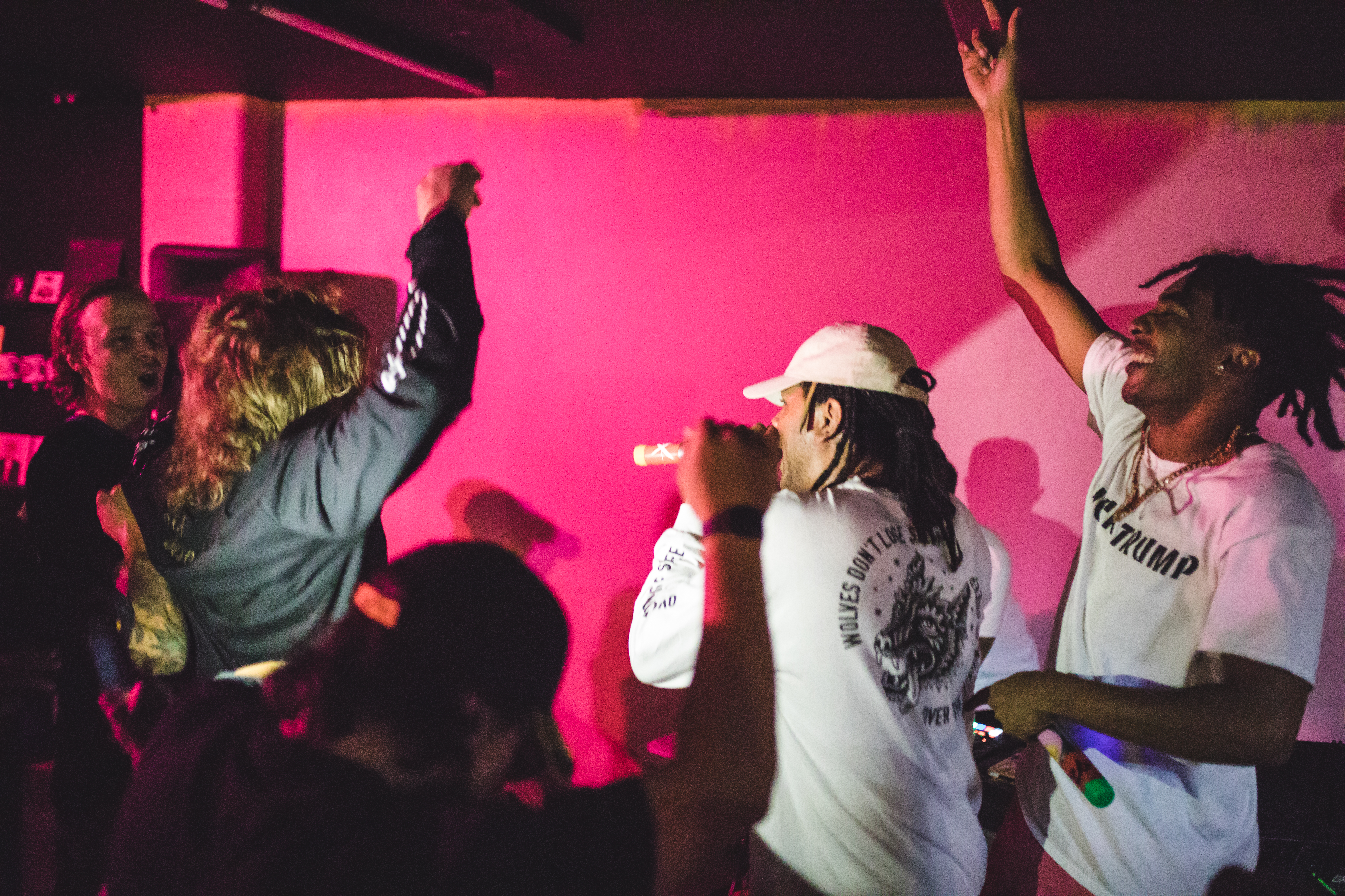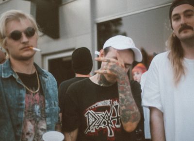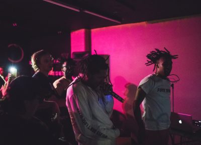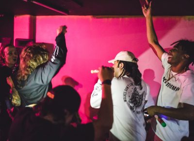 (L–R) Jordan Pack chats with Sara Collins and Yung Goya. Look for Yung Goya to perform at Gold Blood on Aug. 19. Photo: John Barkiple