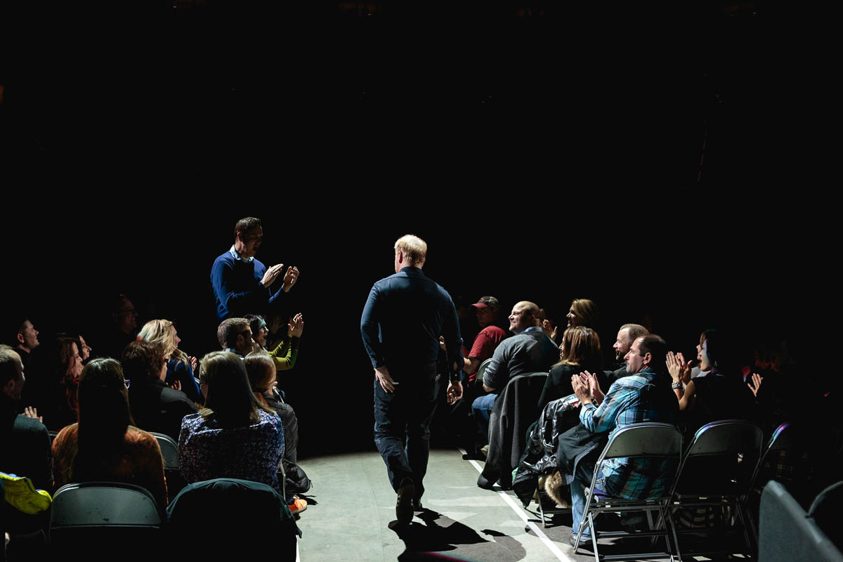 After the all-too-brief opening act, Gaffigan is announced without any break. Coming onto the stage like a basketball team of one, Gaffigan marches through the uproarious applause and the aisles of fans clapping and standing in a giddy anticipation. With the mic in hand, Gaffigan blasts happy audience members with one joke after another, whether it be it about tight pants, fry sauce, personal trainers and attempts at converting Brian Reagan to the LDS faith. Without spoiling any of the punchlines, this photographer can unequivocally say that people better make their way into Gaffigan’s next Vivint show on Dec. 9—or, be very envious of those who already have tickets to this very special event.