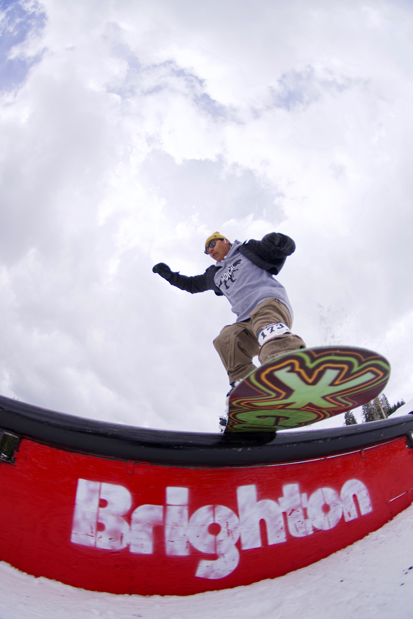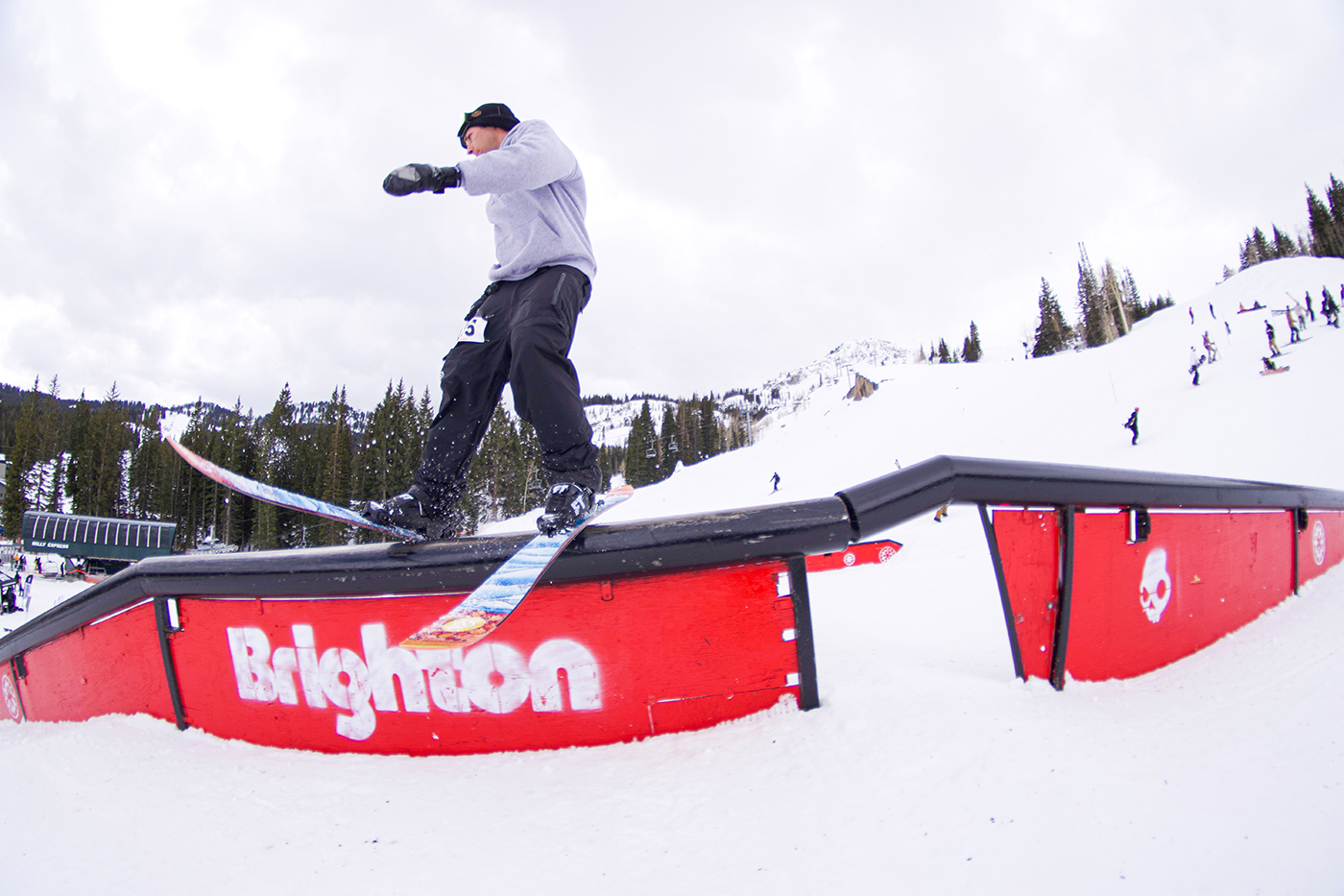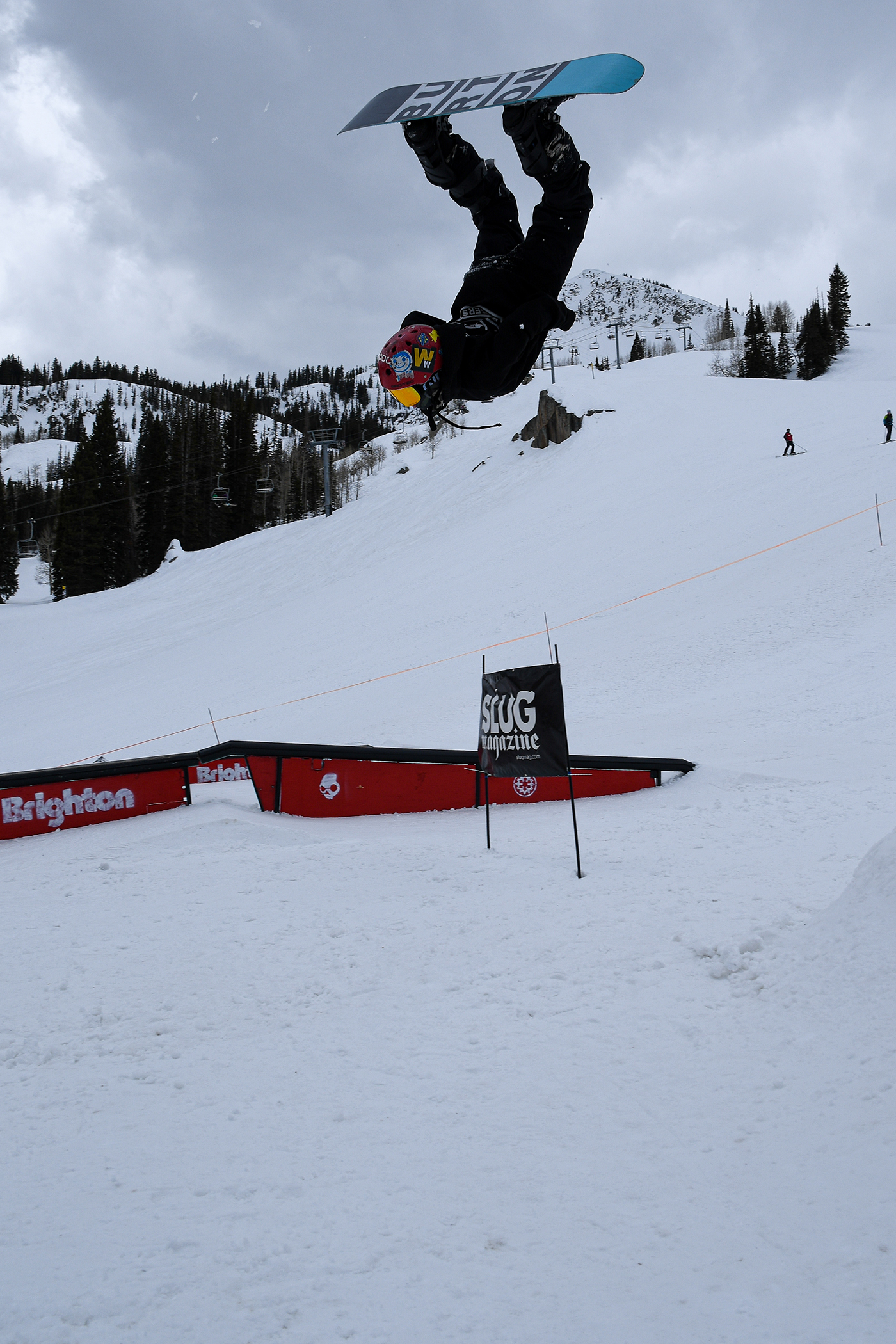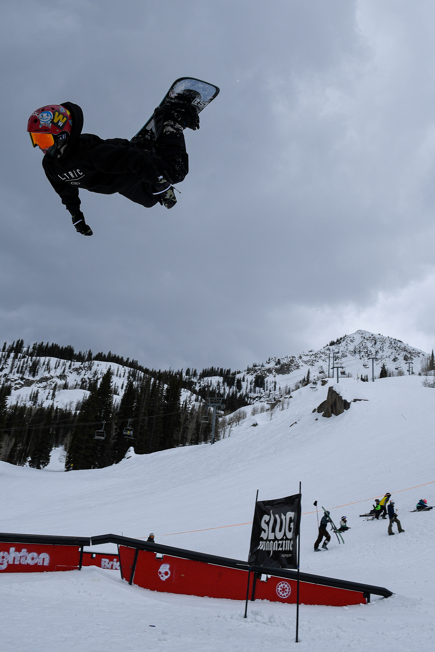 The 20th Annual SLUG Games competition, this being the Meltdown edition, kicked off this past Saturday at Brighton Resort. For 20 years, this contest has been going down, highlighting some of the best and brightest, oldest to youngest and most creative riding and skiing around. The stage was set up by the Brighton Diggers, which included a crucifix-box-to-rail with wooden spines on either side, an unorthodox and large-scale flat-down-flat round bar, and a step-down with a bonk/wallride immediately off the lip. With a variety of features, there was sure to be no shortage of the variety of tricks that would go down.
