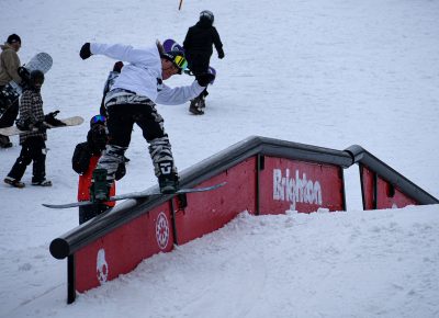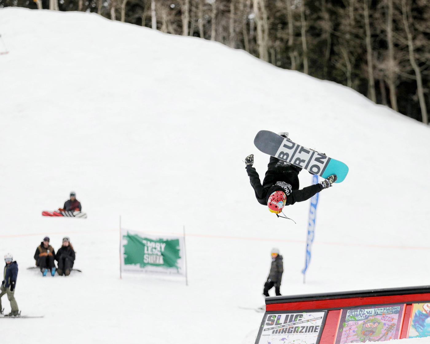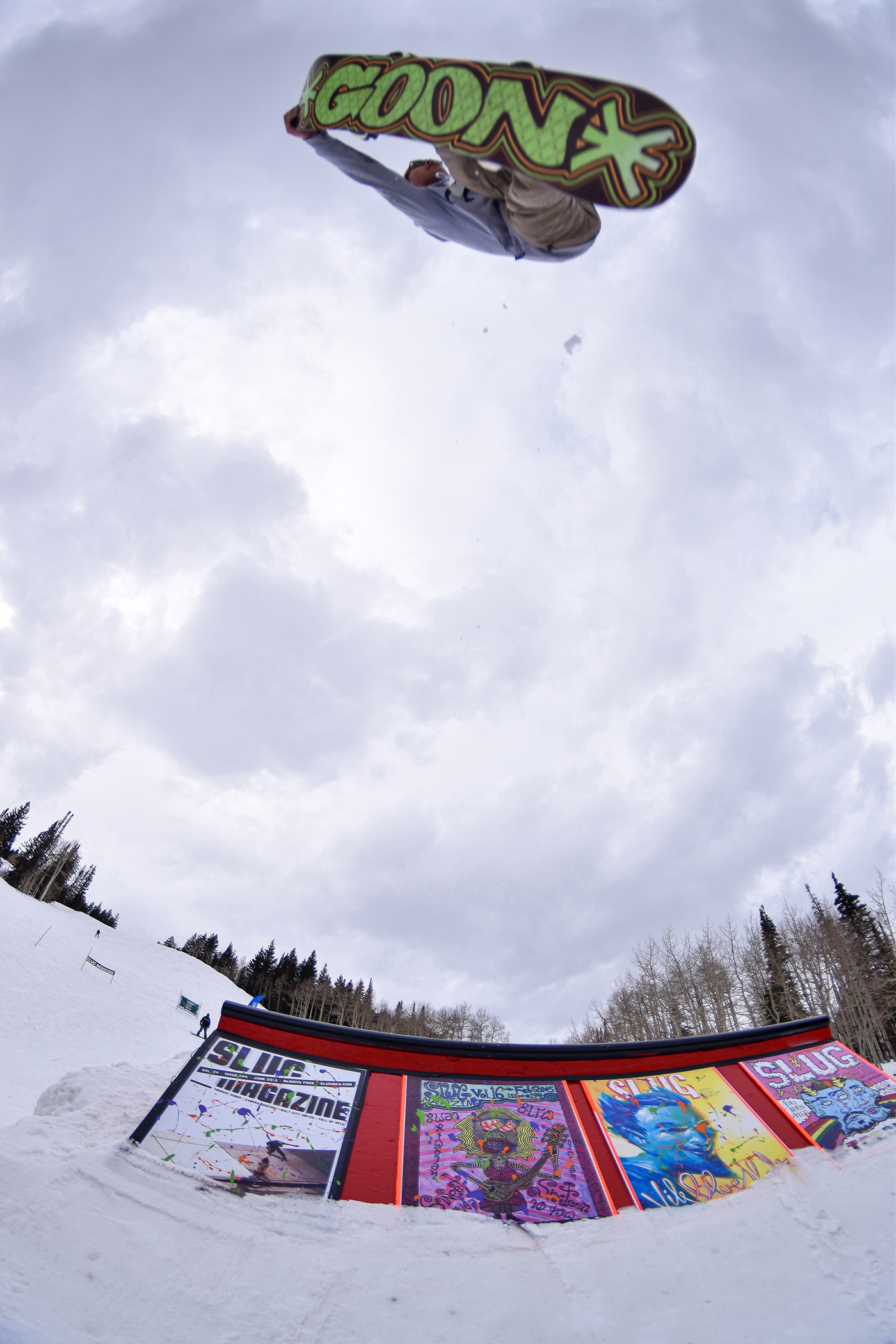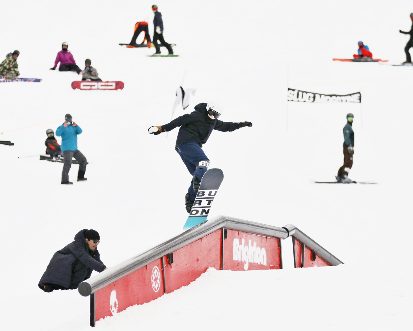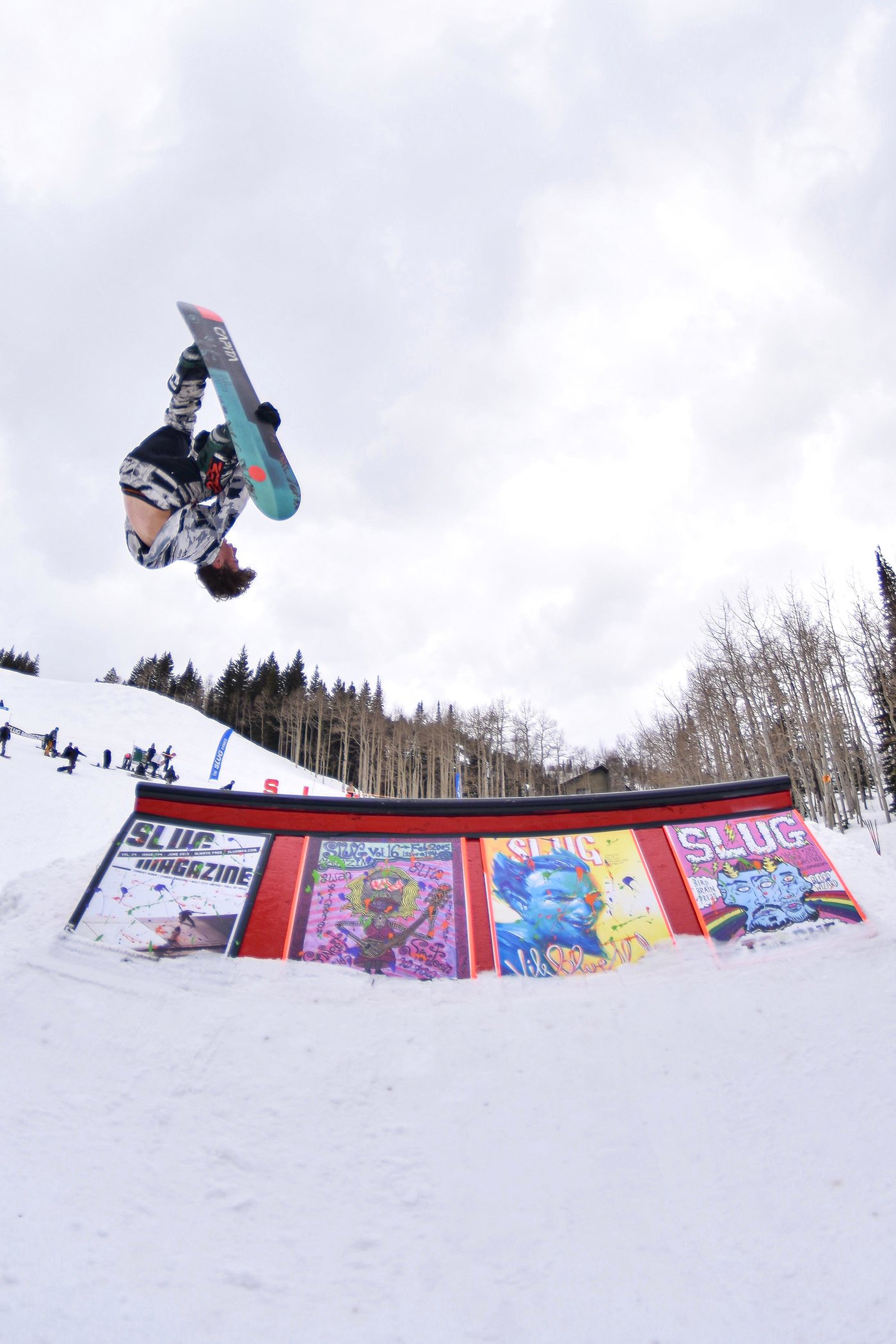 The 20th Annual SLUG Games competition, this being the Meltdown edition, kicked off this past Saturday at Brighton Resort. For 20 years, this contest has been going down, highlighting some of the best and brightest, oldest to youngest and most creative riding and skiing around. The stage was set up by the Brighton Diggers, which included a crucifix-box-to-rail with wooden spines on either side, an unorthodox and large-scale flat-down-flat round bar, and a step-down with a bonk/wallride immediately off the lip. With a variety of features, there was sure to be no shortage of the variety of tricks that would go down.