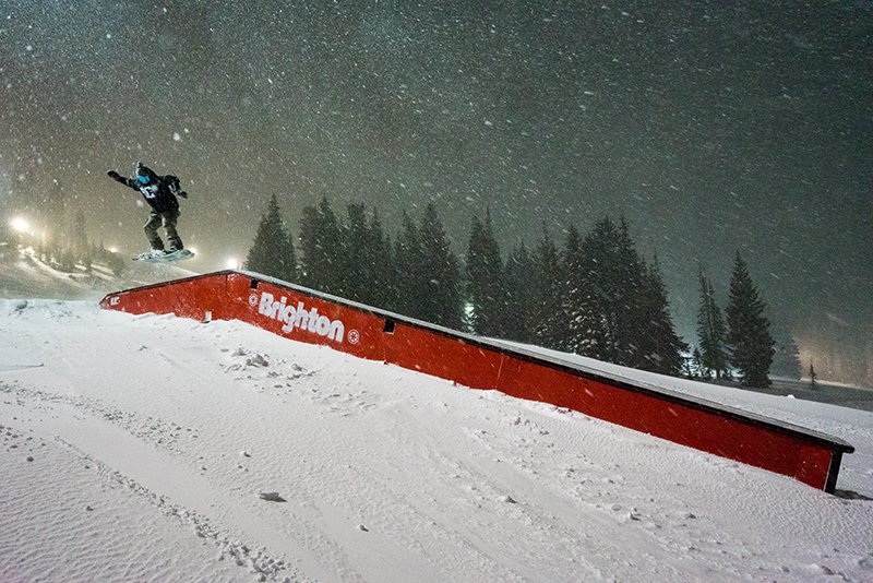 Local Salt Lake snowboarder Jonah Car Michael hit the boxes at the well-lit terrain park, accessible by the Majestic Lift. Photo: Jo Savage // @SavageDangerWolf