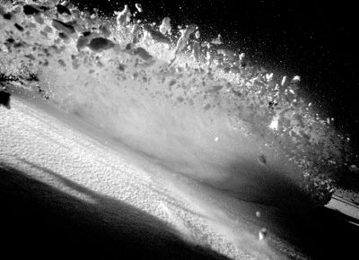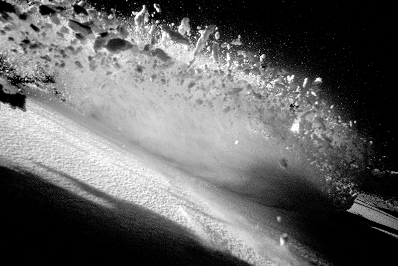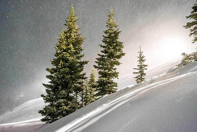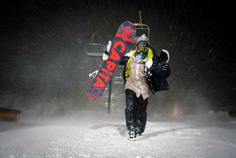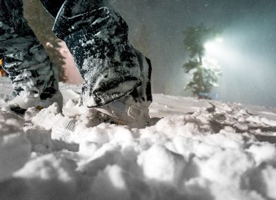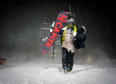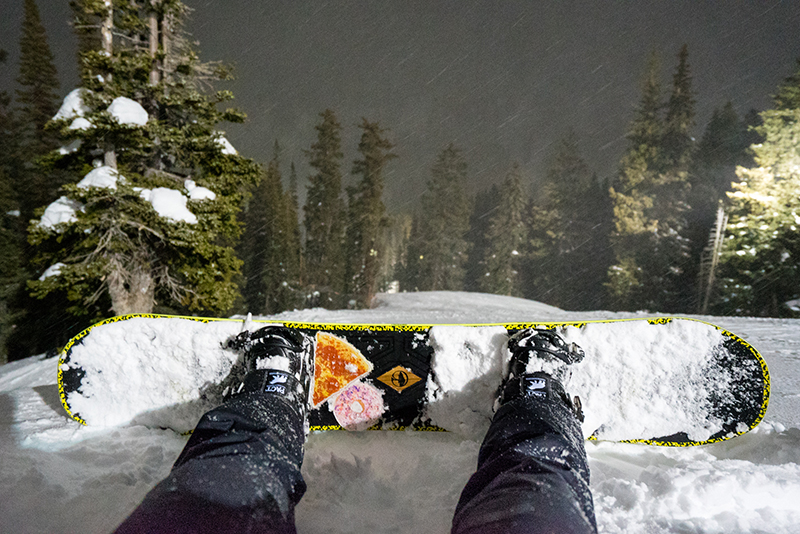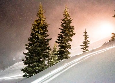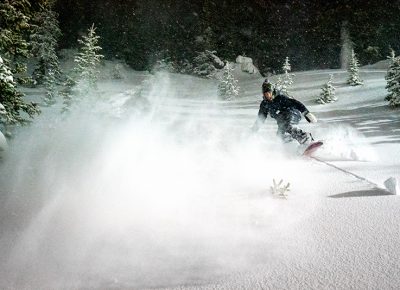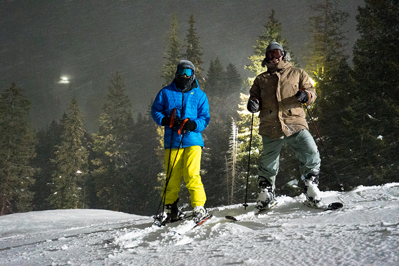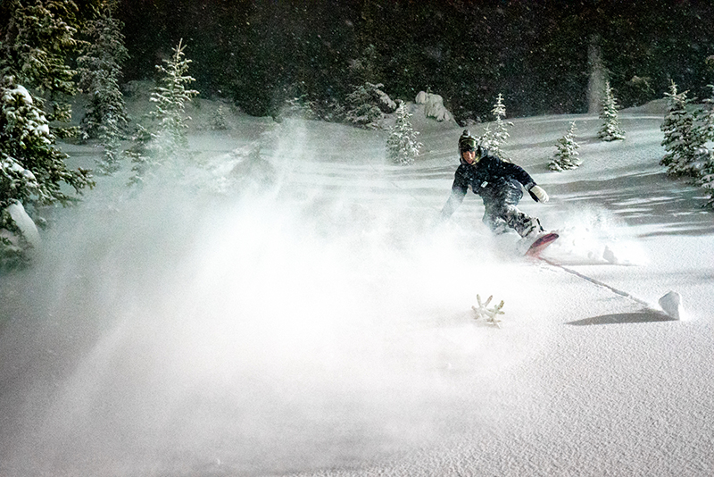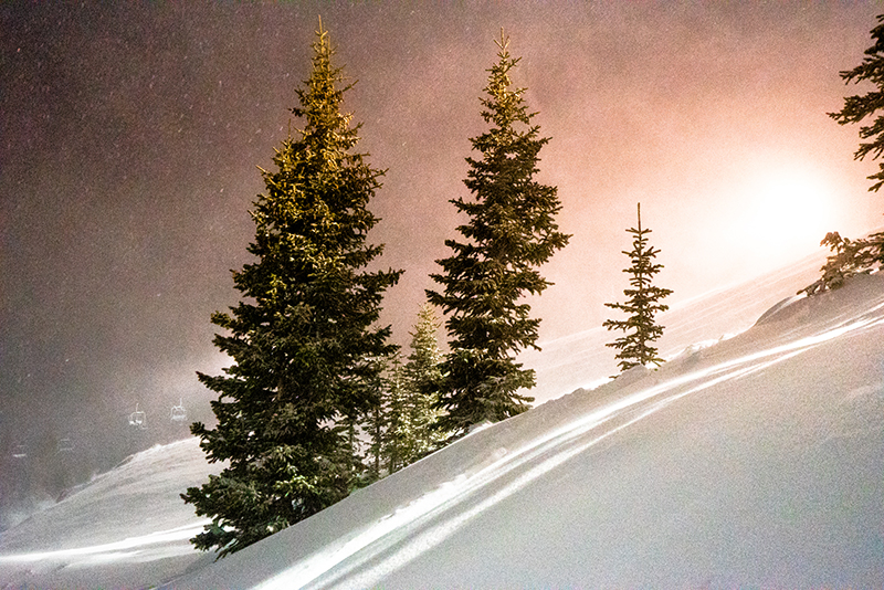 After the terrain park and running into some friends, I took a few laps on Crest. The lighting is really cool at night: bright enough for there to not be safety concerns, and there aren’t too many people, so that often, it feels like you have the mountain to yourself. After a few laps and pow patches spotted from the lift, we ventured to the scouted locations and hiked to hit some pow. There is nothing quite like hitting pow in the dark (or shooting it).