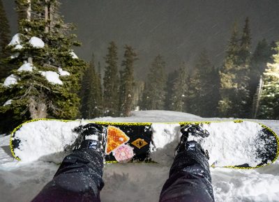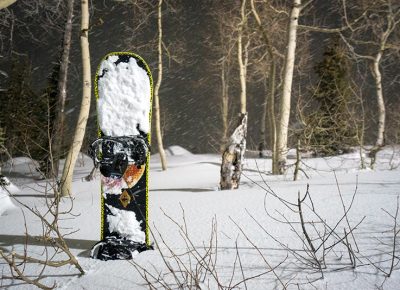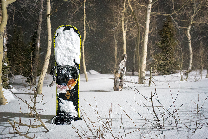 The snowboard waited patiently in soft, deep and fluffy pow while its rider photographed the terrain park. Photo: Jo Savage // @SavageDangerWolf