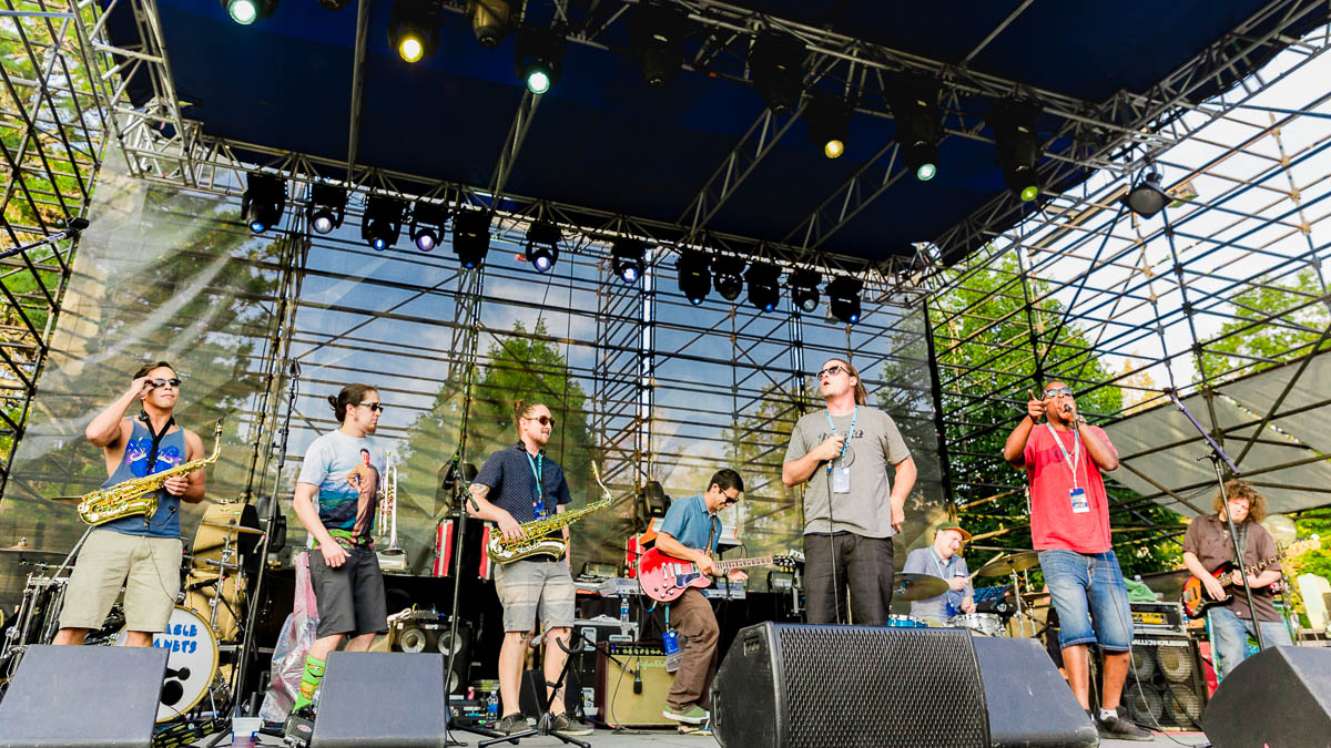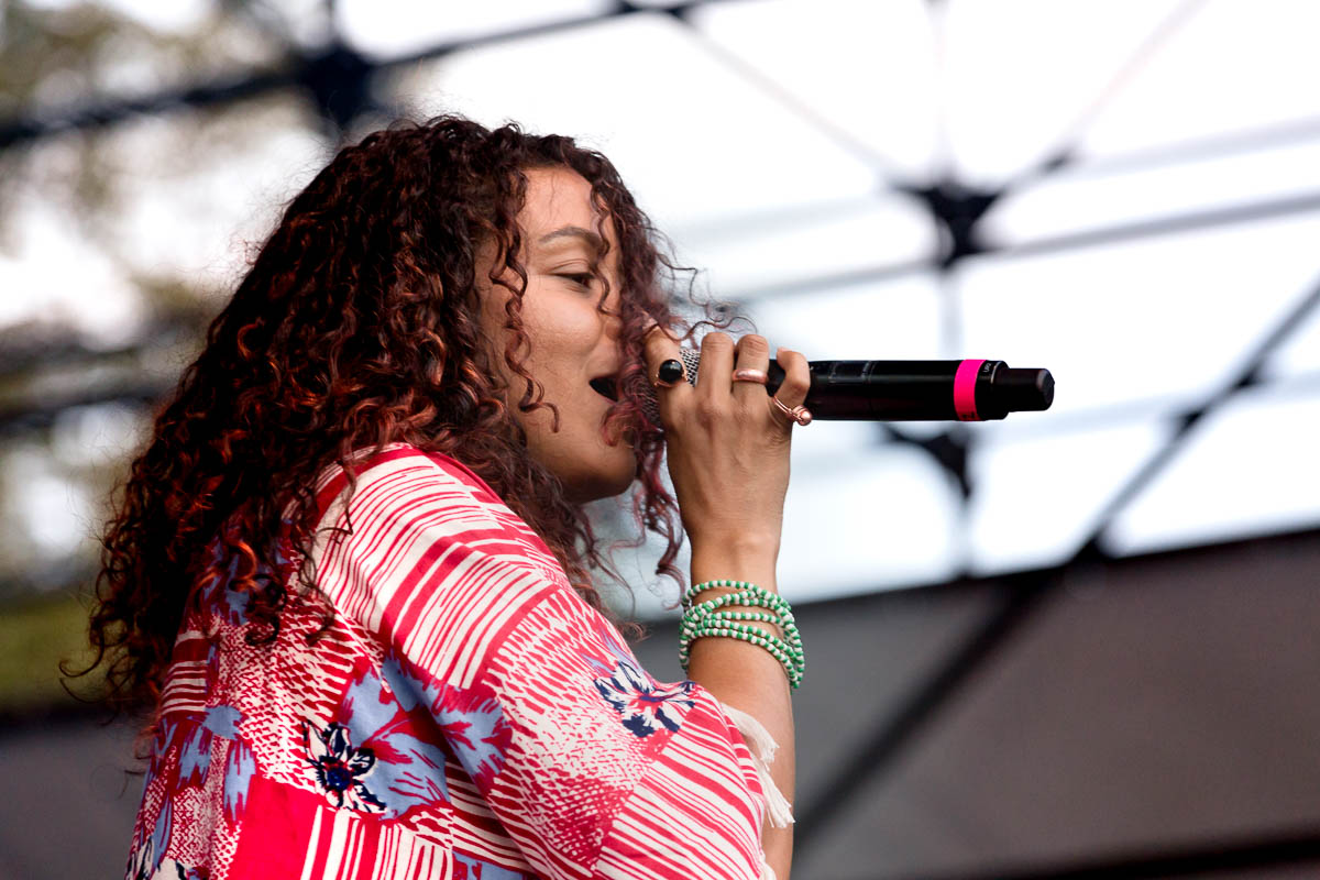After the crowds congregated in the summer sun, the audience turned their focus to the stage. Local group Grits Green gathered onstage, providing a welcome break from the silence with an energetic set of their dance hip-hop style. This larger ensemble incites some dancing and plenty of smiles from the crowd with rap tracks such as “Straight No Chaser.”