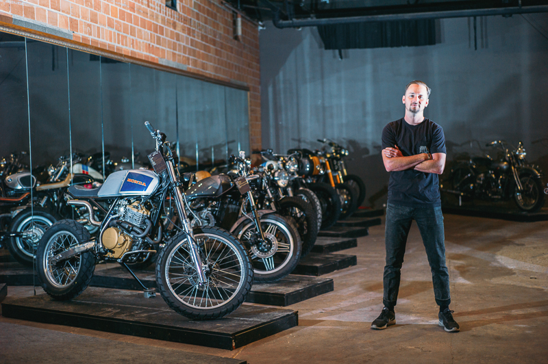 Salty Bike Revival co-founder Jason “Rev” Clark poses next to a row of bikes in the invited builder room. Photo: @clancycoop